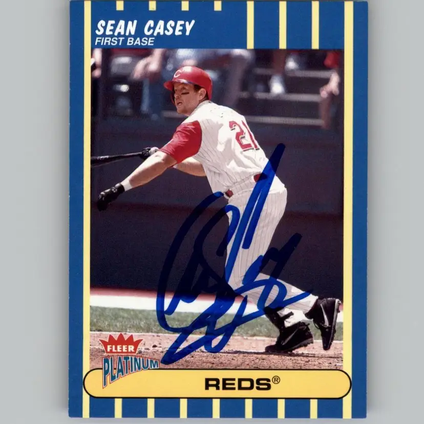 Authentic Fleer Platinum baseball card featuring Sean Casey of the Cincinnati Reds, signed boldly in blue ink. A must-have for Reds fans and autograph collectors. Your purchase supports Signatures For Soldiers in aiding homeless and disabled veterans.