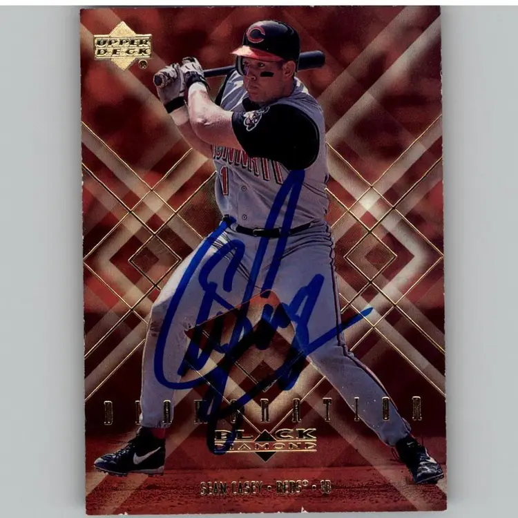 Authentic Upper Deck Black Diamond baseball card featuring Sean Casey of the Cincinnati Reds, signed boldly in blue Sharpie. A must-have for Reds fans and autograph card collectors. Your purchase supports Signatures For Soldiers in aiding homeless and disabled veterans.