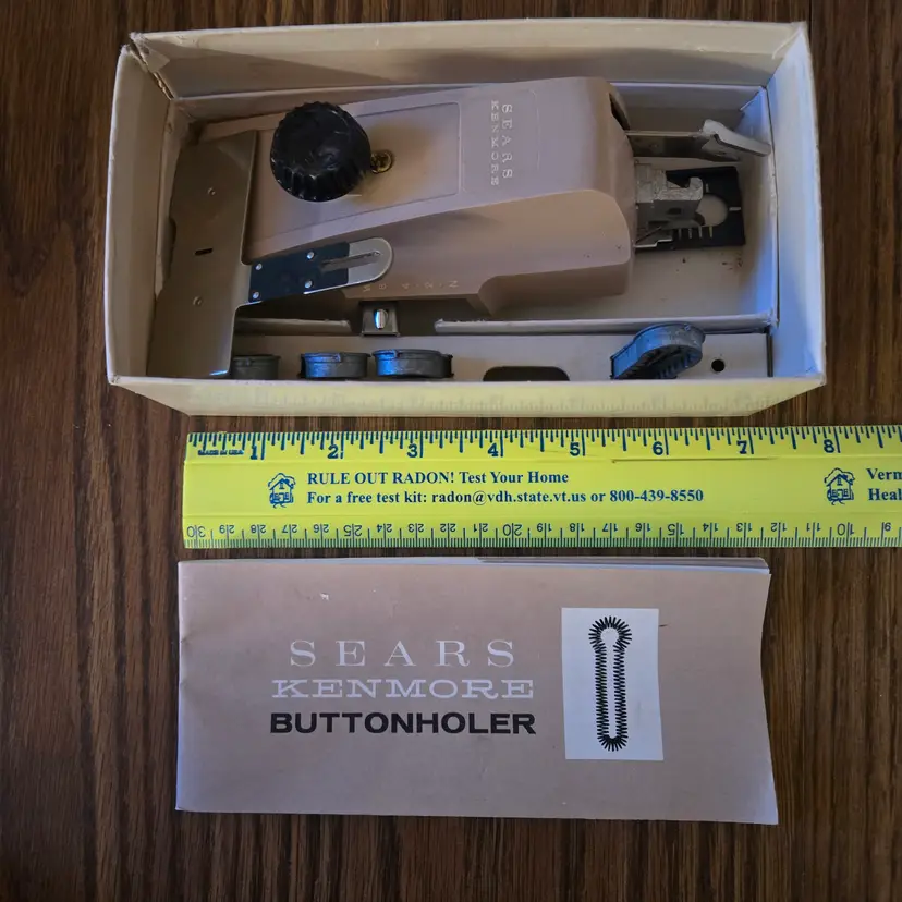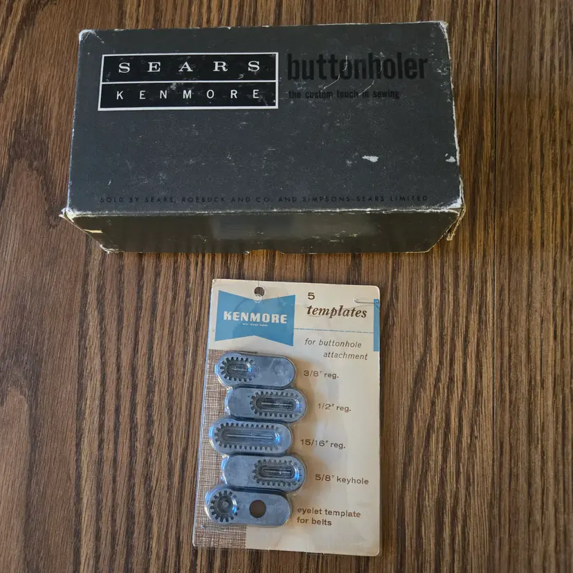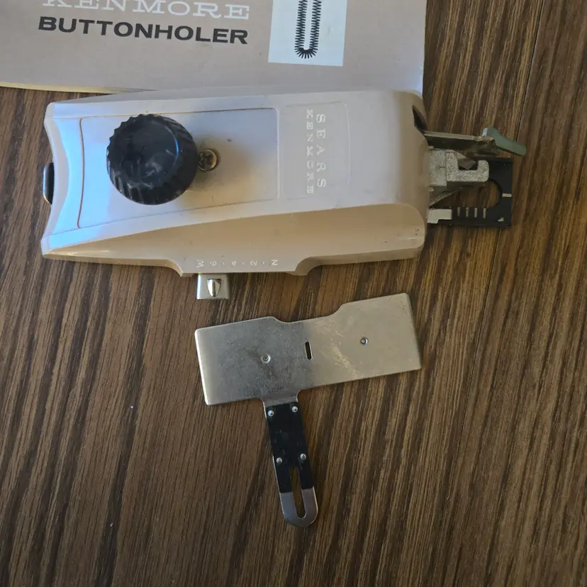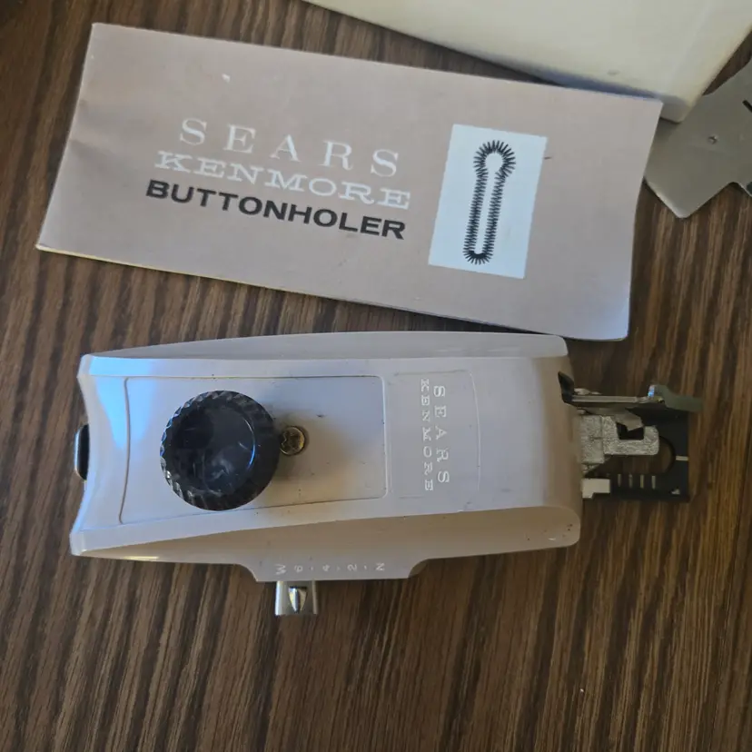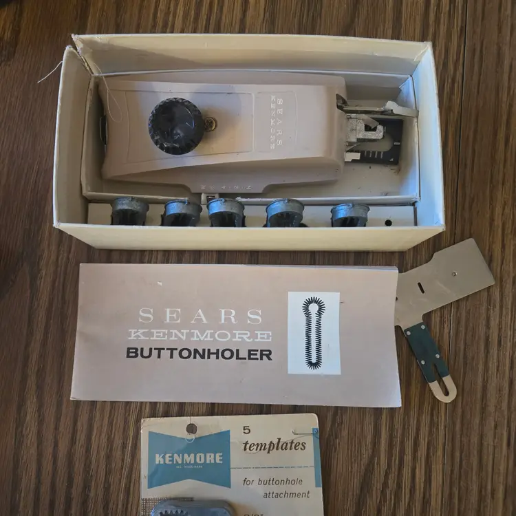 I found this buttonhole attachment for Sears Kenmore sewing machines among boxes of sewing stuff after my sister died. It is an attachment tool in the original box. The only thing missing that I'm aware of is the screw for the plate that goes over the feed. It has been used and does show where it has been greased (see pictures) and the plastic knob looks odd. It may just be marbled plastic but it doesn't look like I would expect. I didn't test it on a sewing machine since it won't fit mine, but I did test a long template and it manually will move across the entire template while moving the knob so I assume it will work on a machine.