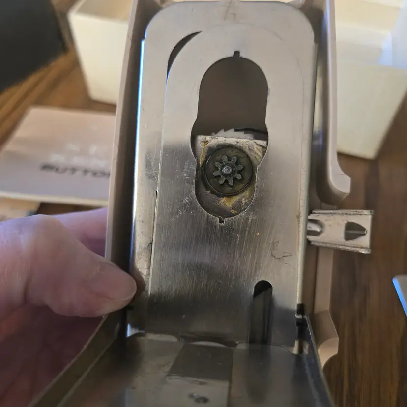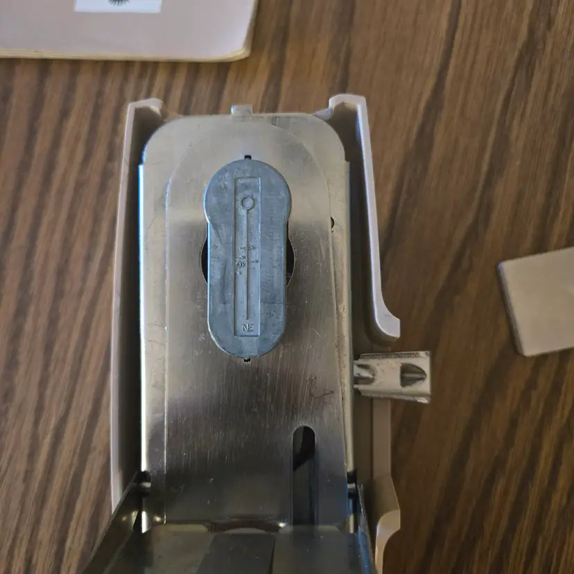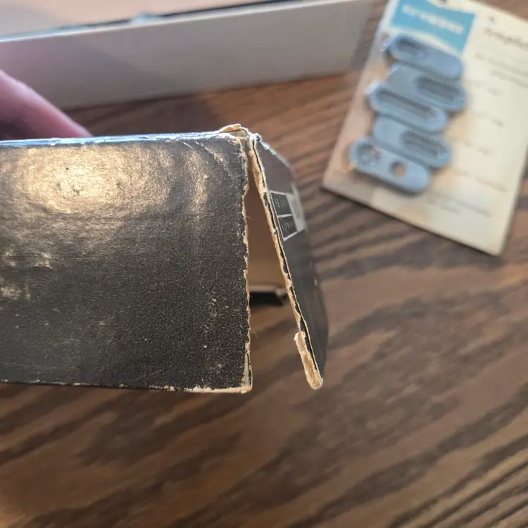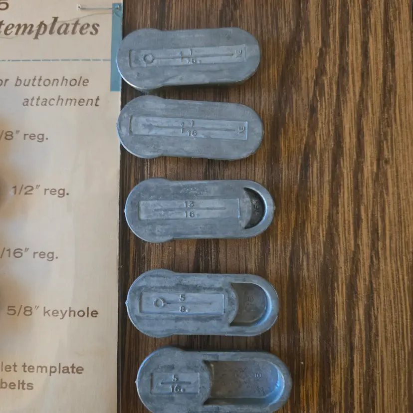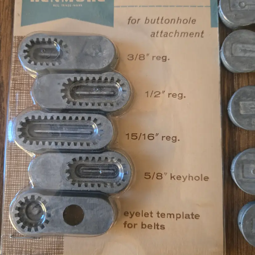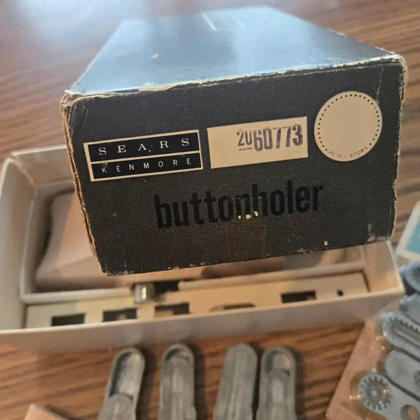 I found this buttonhole attachment for Sears Kenmore sewing machines among boxes of sewing stuff after my sister died. It is an attachment tool in the original box. The only thing missing that I'm aware of is the screw for the plate that goes over the feed. It has been used and does show where it has been greased (see pictures) and the plastic knob looks odd. It may just be marbled plastic but it doesn't look like I would expect. I didn't test it on a sewing machine since it won't fit mine, but I did test a long template and it manually will move across the entire template while moving the knob so I assume it will work on a machine.