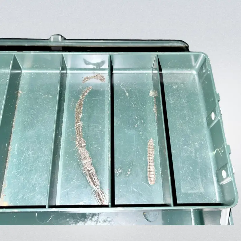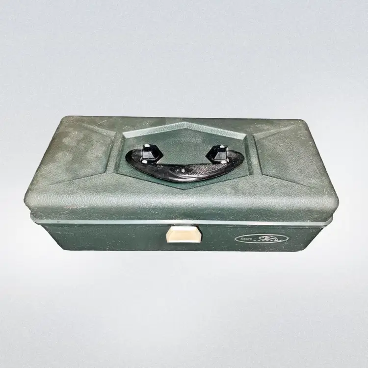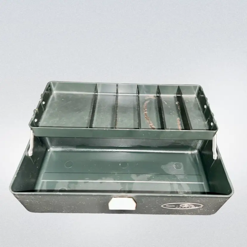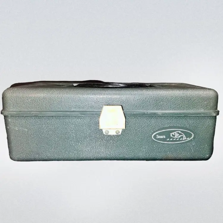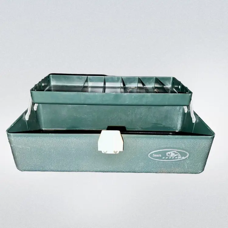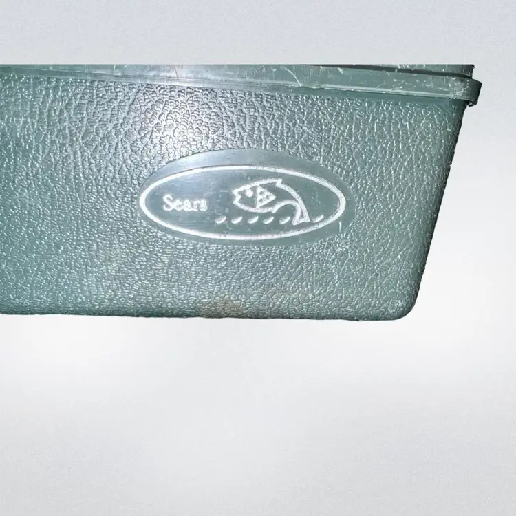 Epic piece of nostalgia!! Cute fish on the handle ๐ฅฐ ๐ There is some damage to two of the tray sections from an artificial lure that got too hot ๐๐ This could be used as a starter box for a kiddo, for storage or for display. Measures ~13x5.5x4.5