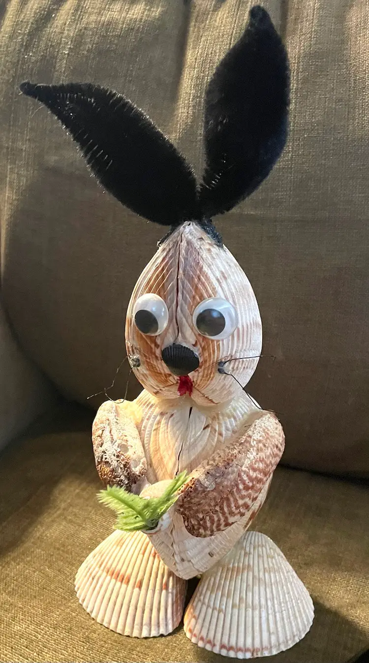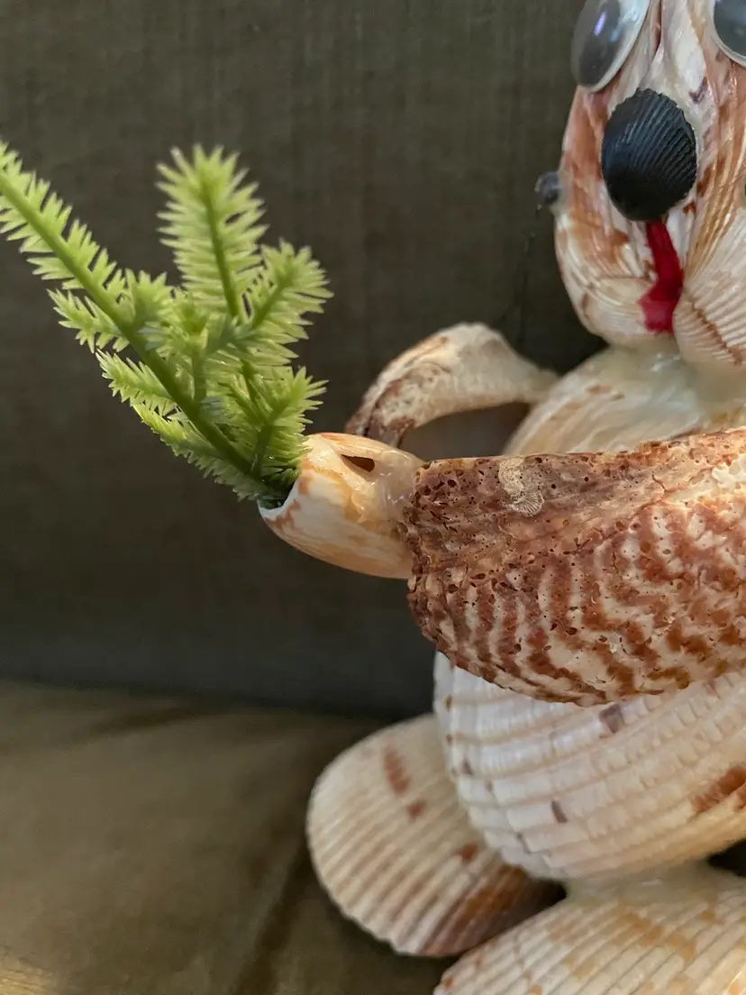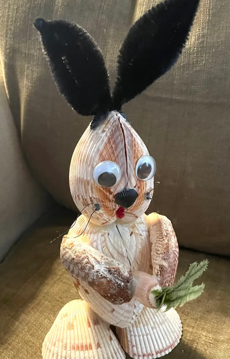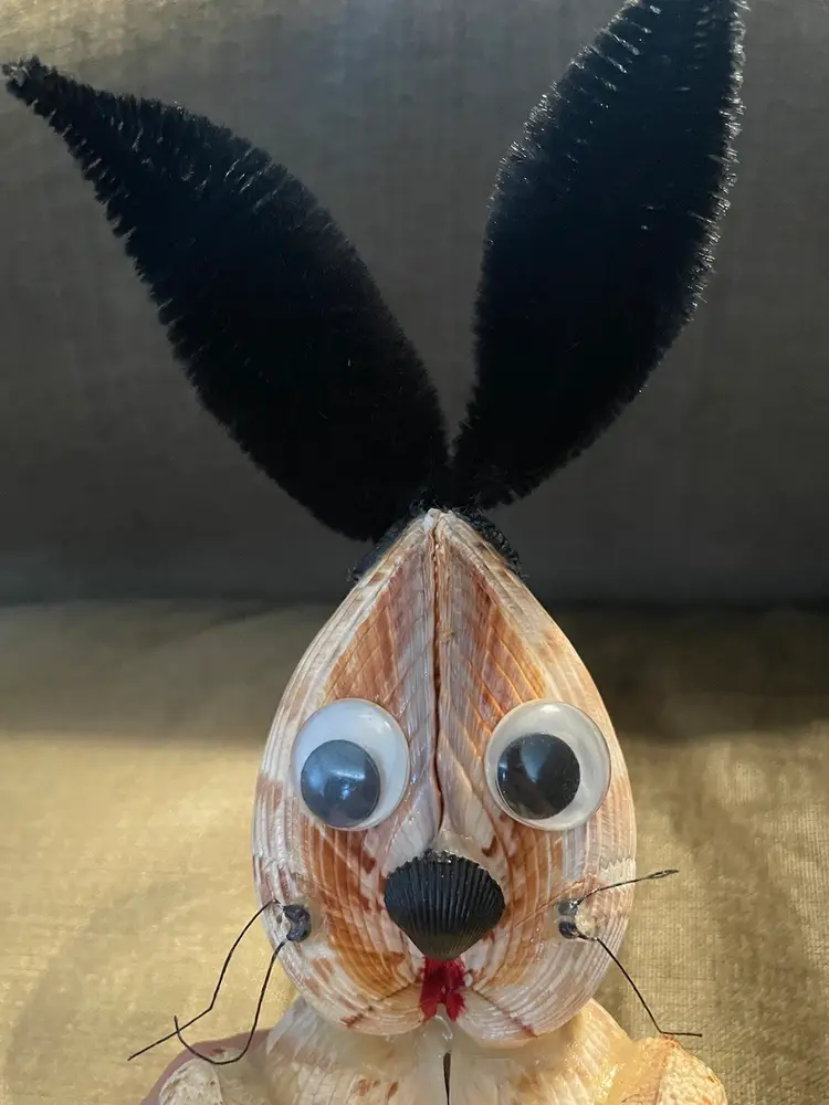 This sweet bunny is crafted from seashells right down to the carrot he holds in his hands. He stands at 8 3/4” to the top of his head and just shy of 12” to the tips of his ears. He is 5” at his widest. This is a fun, unique crafted bunny brought to you just in time for Easter :)