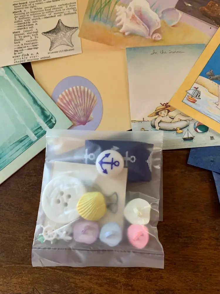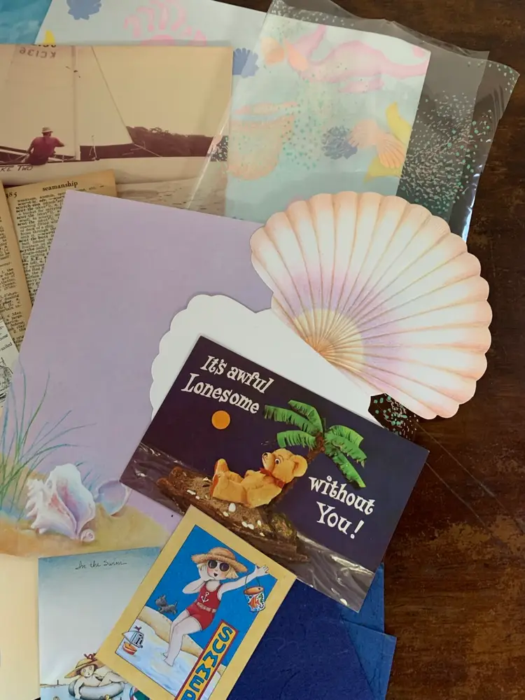 Seashell/Ocean themed junk journaling ephemera packet containing 25+ items from my personal stash of paper and trims. Packet has an Ideals magazine page, wrapping paper, a page from book about art by Winston Churchill, seashell print cellophane, an 80’s sailboat photo, 80’s seashell stationery, seashell buttons and more! A great inspiration for a nautical, ocean or beach themed journal or paper crafting.