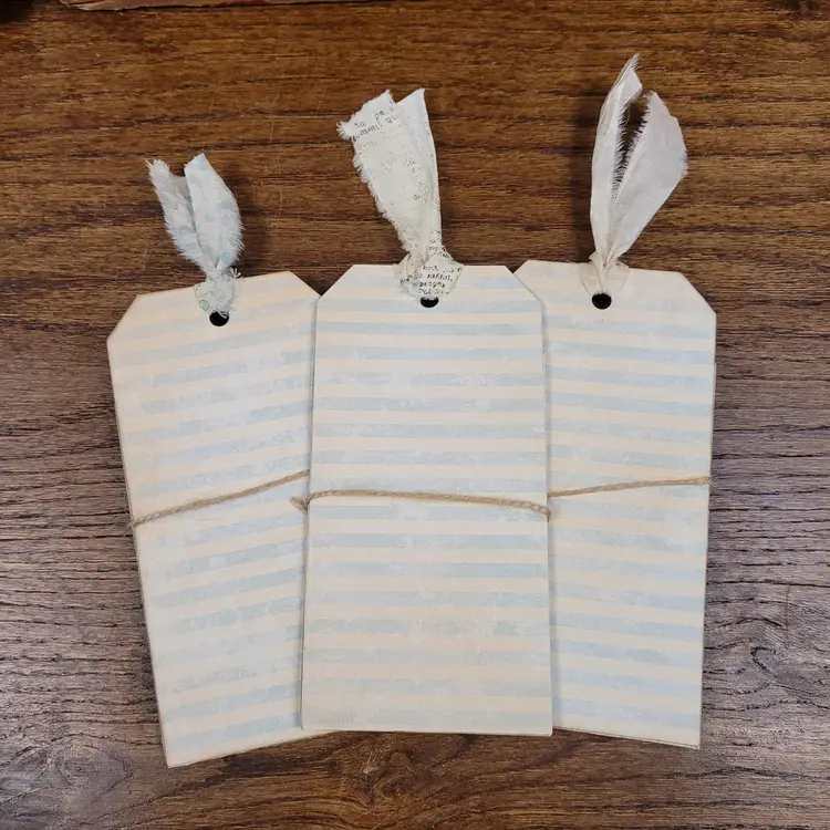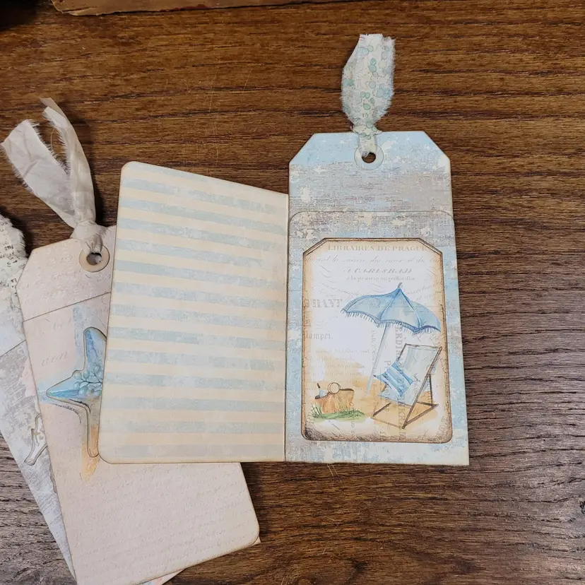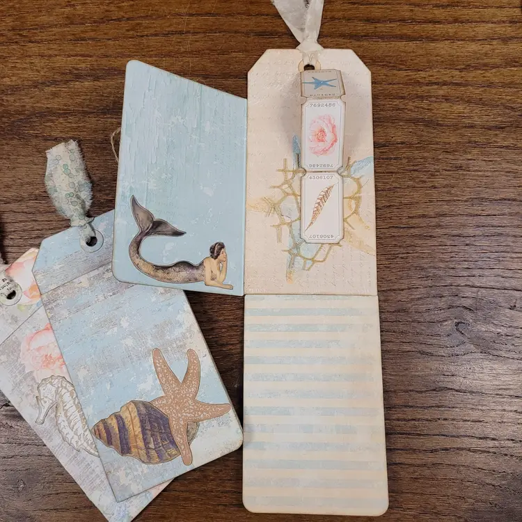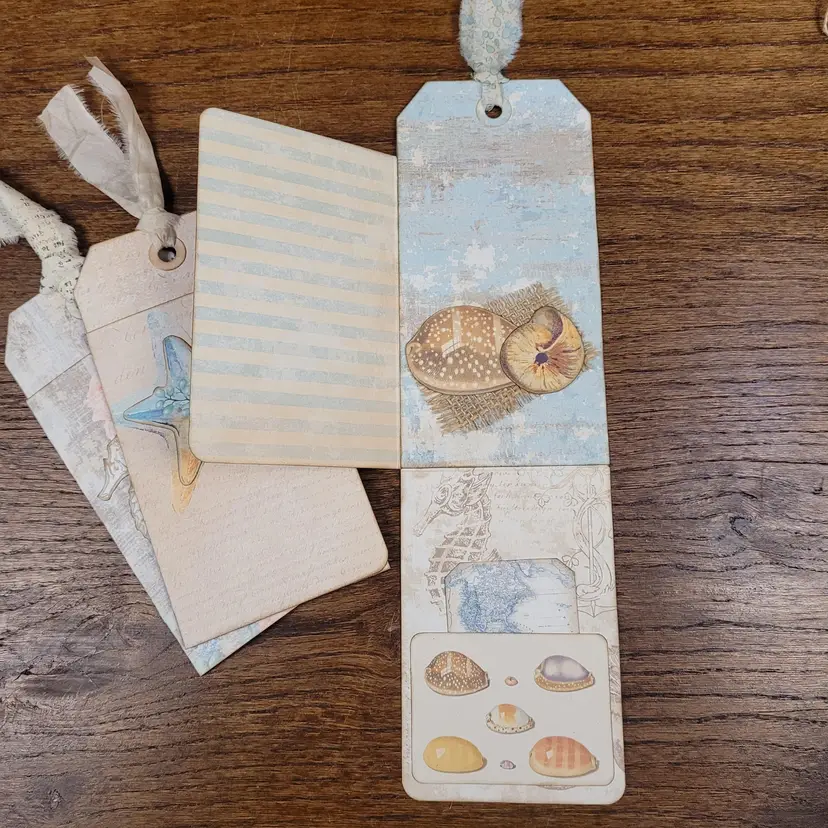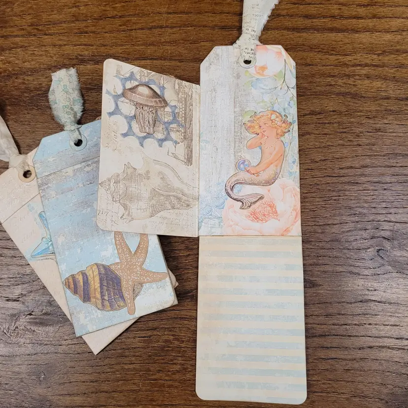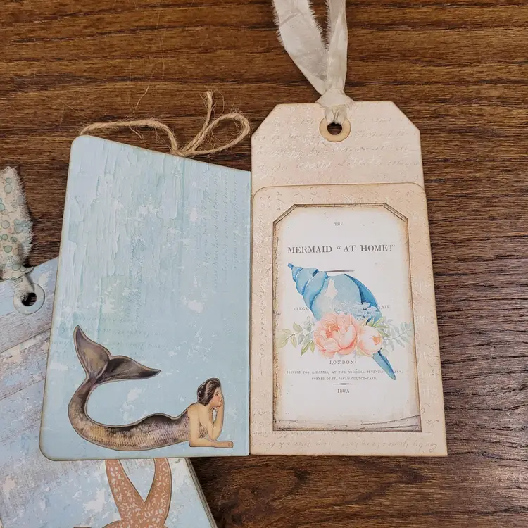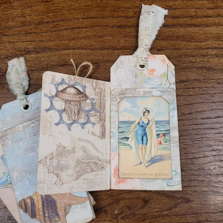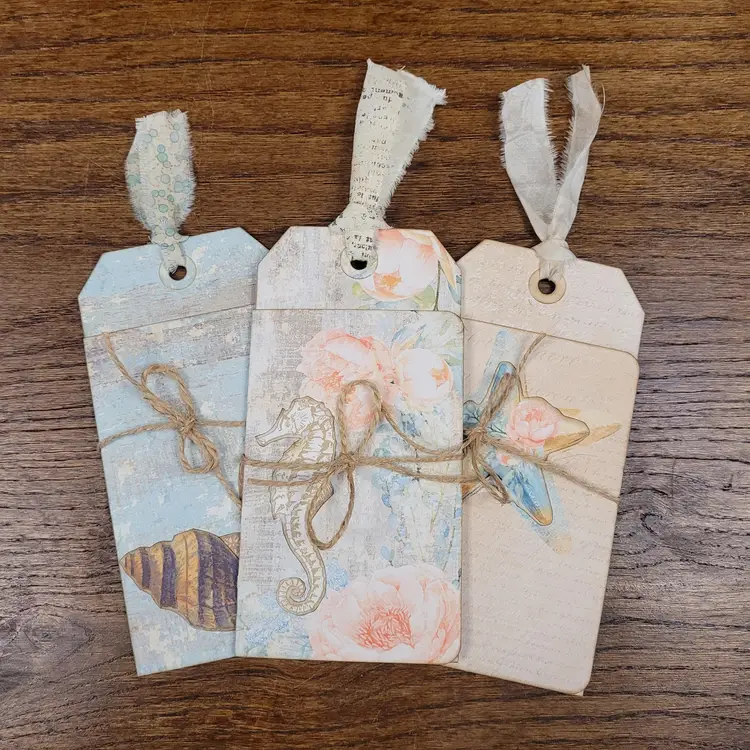 Add a touch of costal charm to your journal or gifts with this set of 3 mixed media tags. Each tag features unique designs with floral patterns, sea creatures, and rustic twine accents. Perfect for any occasion, these tags are sure to make your presents stand out.