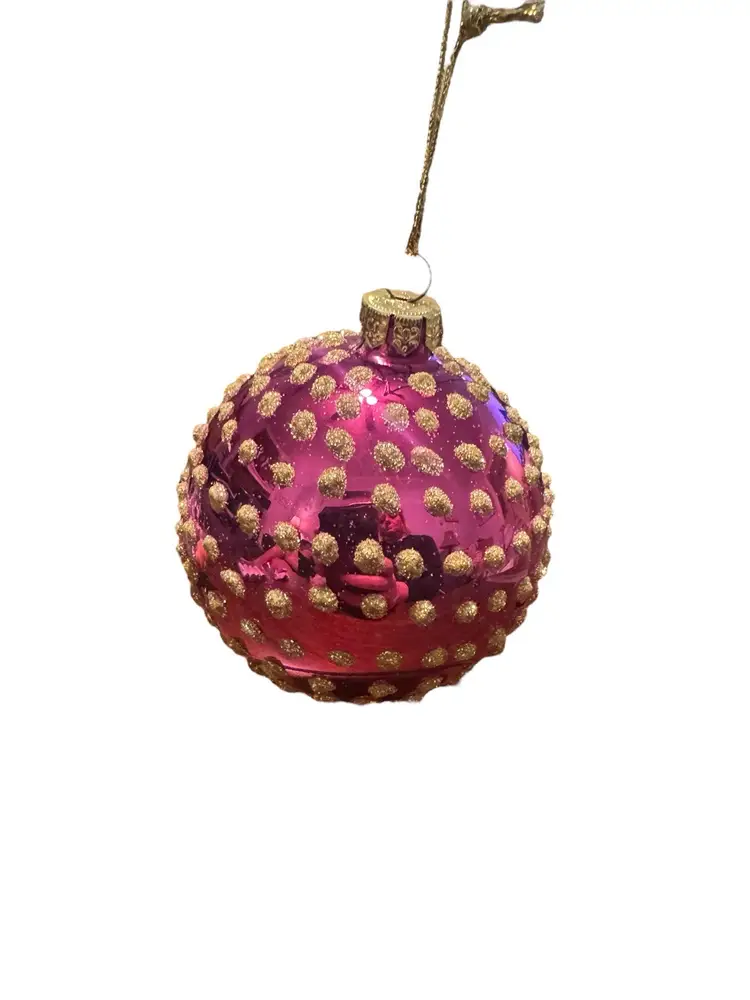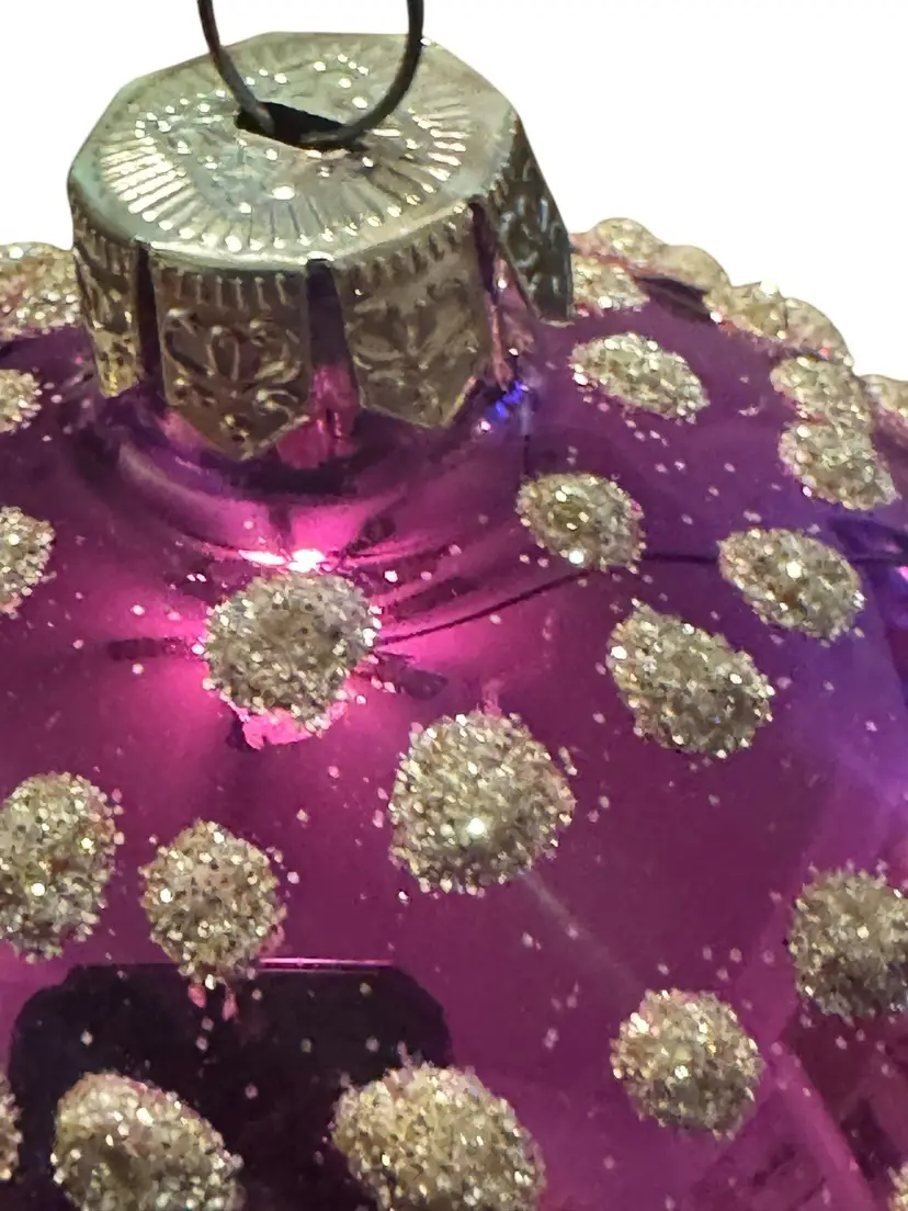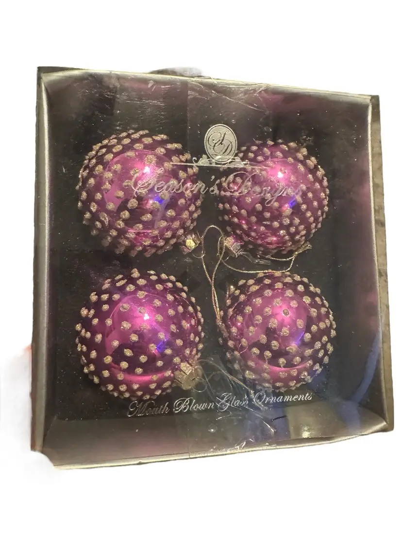 Seasons Designs Set Of 4 Hand Blown Glass Purple Christmas Ornaments 3” w/box with beautiful gold colored accent. Excellent condition and comes with the original box