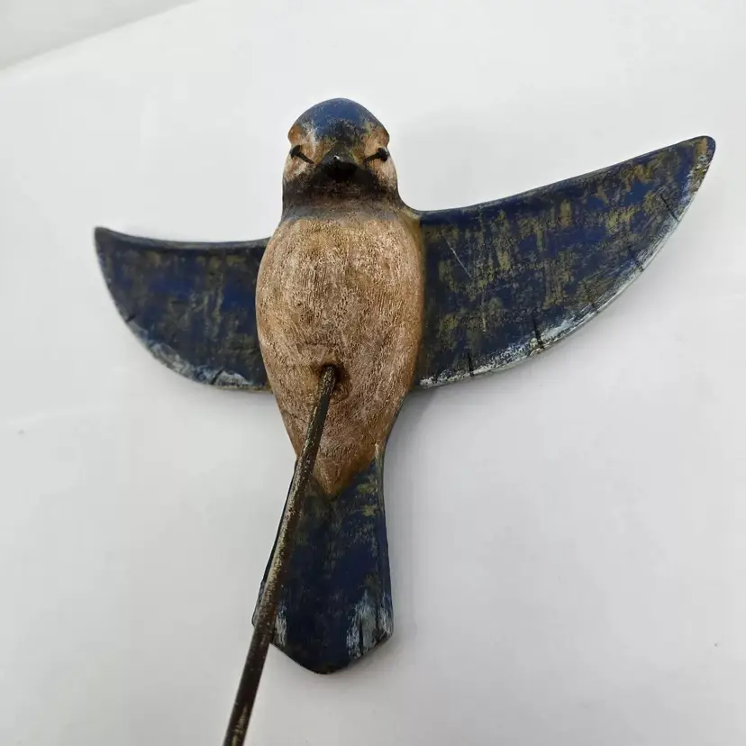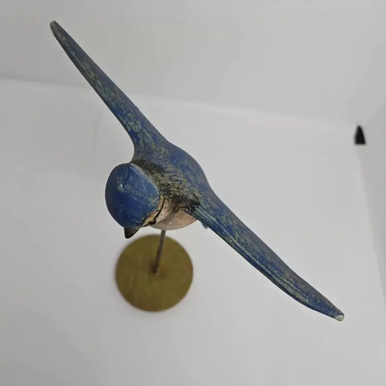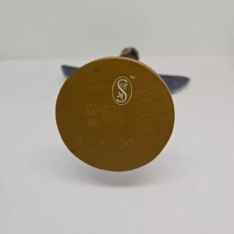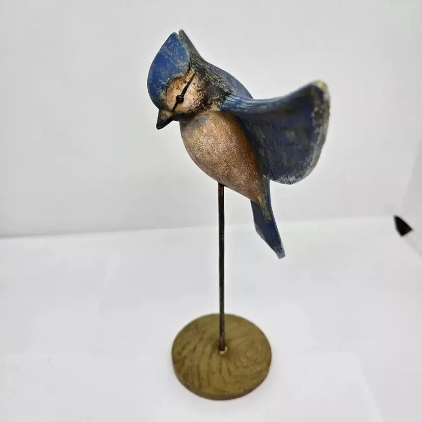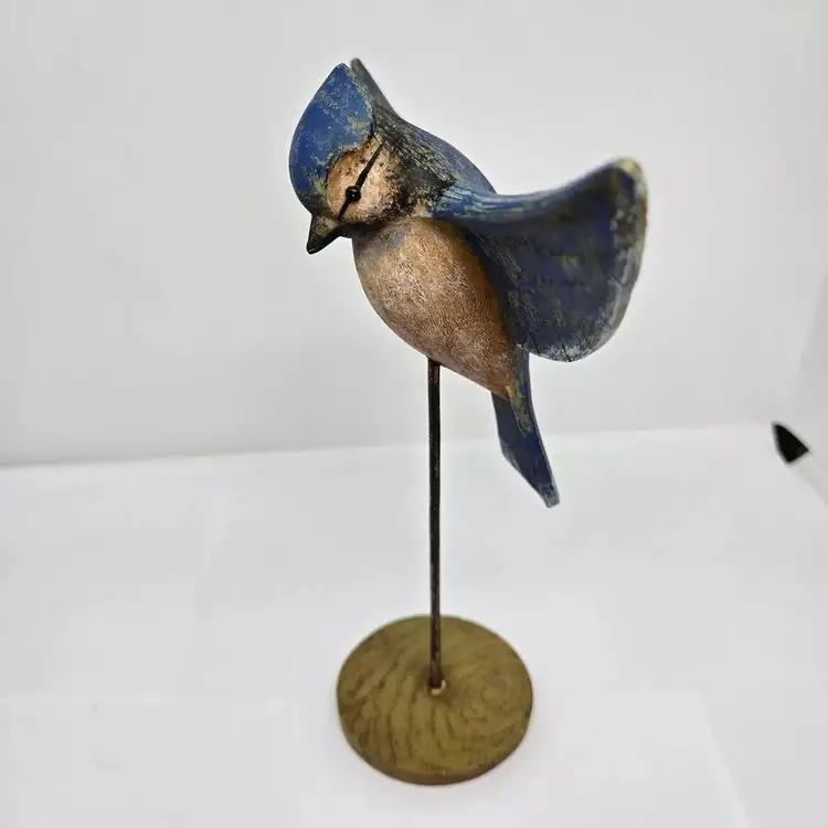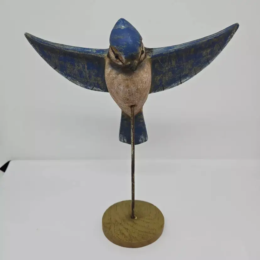 The stand base appears to be wood, the bird, I believe is resin, and there is a metal piece suspending the bird above its base.