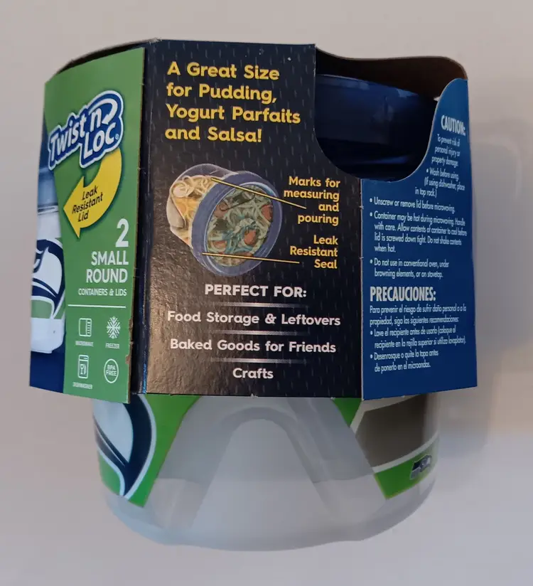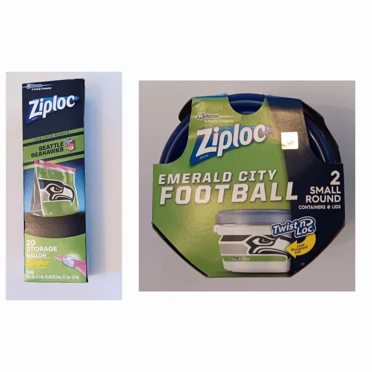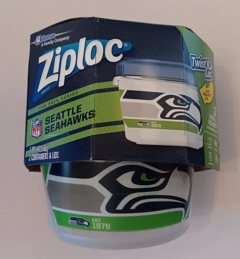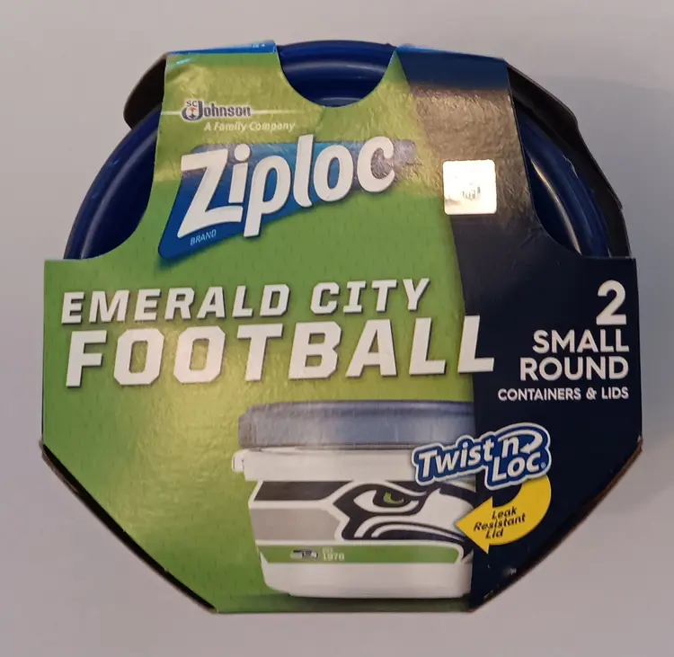 The Seattle Seahawks Emerald City Football Ziploc Party Pack is a limited edition food storage set, perfect for storing snacks while showing support for your favorite NFL team, the Seattle Seahawks. With the team's iconic colors and logo, this set of 20 Ziploc gallon sized slider bags and two 1 pint "Twist 'n Loc" round storage containers is ideal for game day gatherings or tailgating events. Keep your food fresh and your team spirit high with this exclusive fan apparel and souvenir item. Brand new in sealed box.
