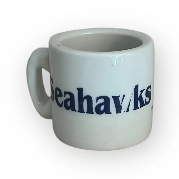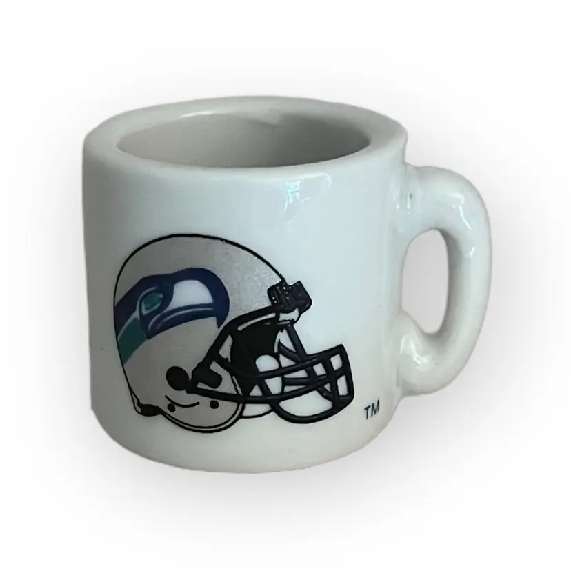 Seattle Seahawks Vintage NFL Football Mini Ceramic Mug 1.25" Miniature Gumball Prize Collectible. Helmet Logo Football Gift Display Paint loss on lettering