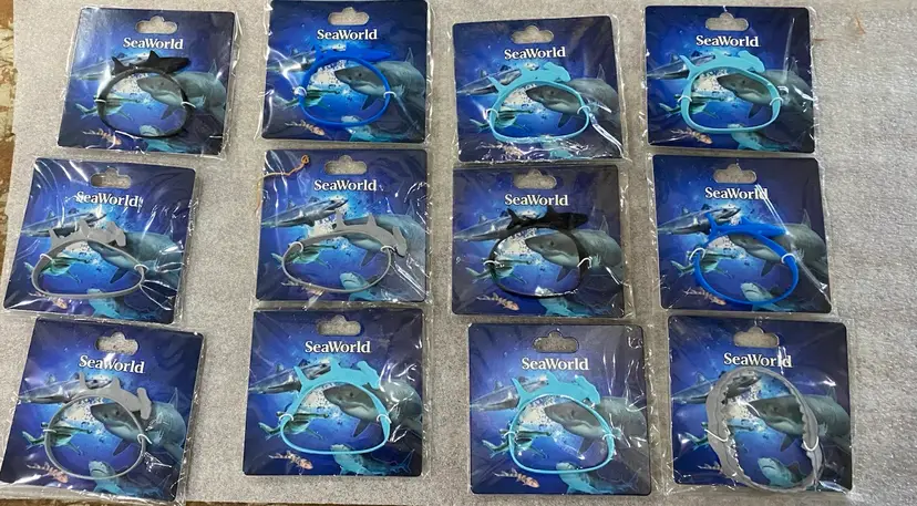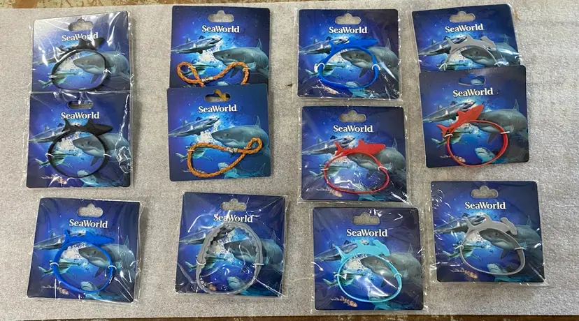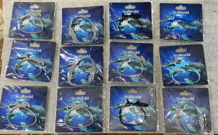 Lot of SeaWorld souvenir shop bracelets - mostly rubber - few missing cellophane wrapper - some soiling on cellophane from storage - includes 2 rings