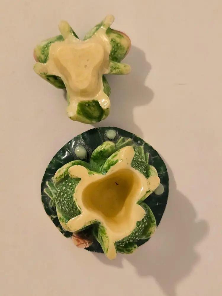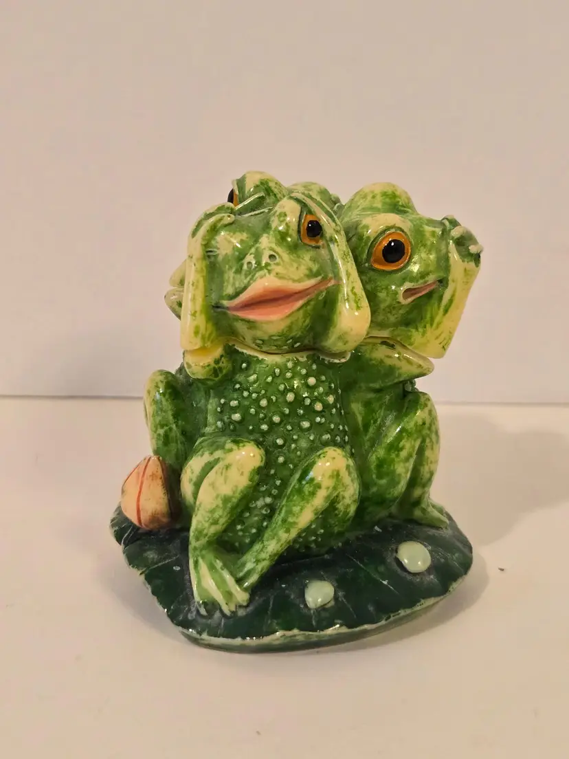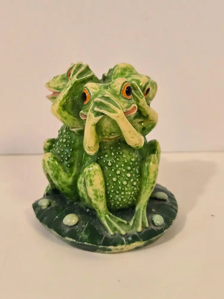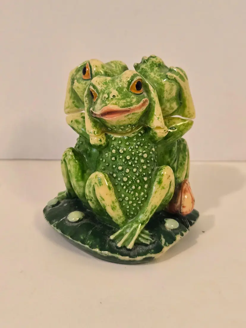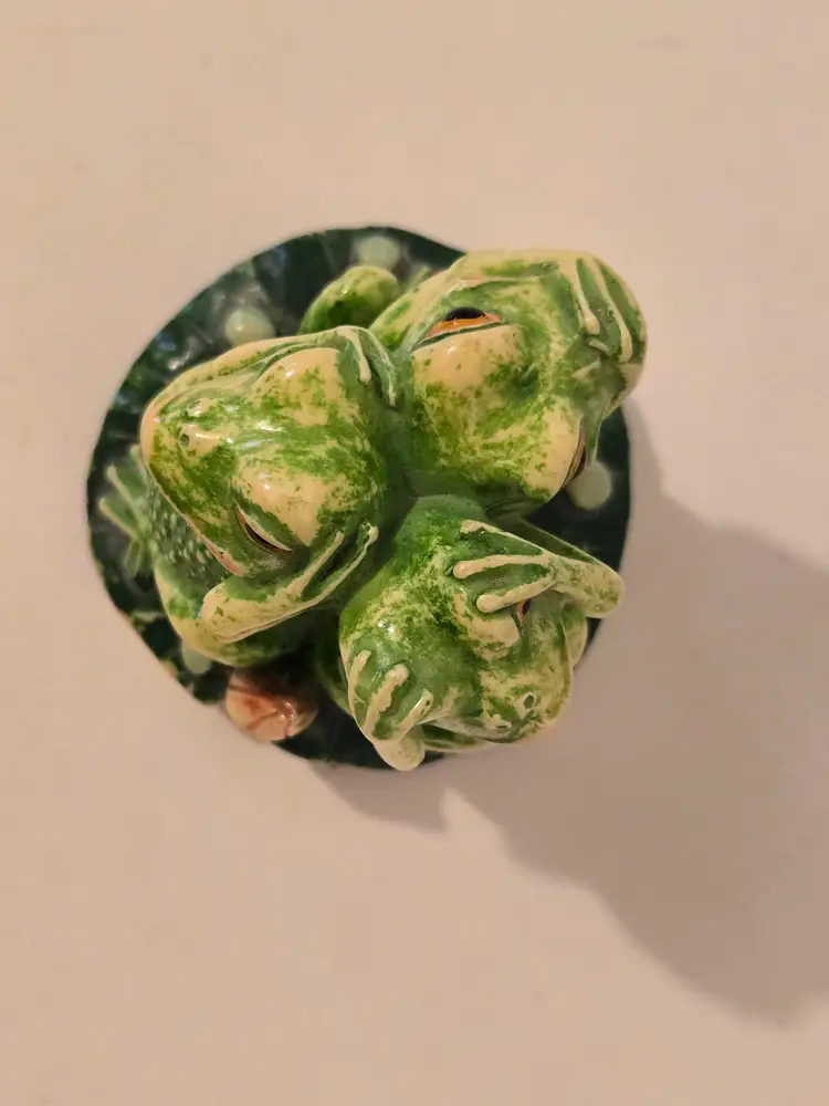 This charming trio of frogs is here to remind you; see No Evil, hear No Evil, speak No Evil. The trinket box measures approximately 3.6×2.5 inches. There are chips on the arms of two of the frogs, please see last photo. The box is marked TAI.