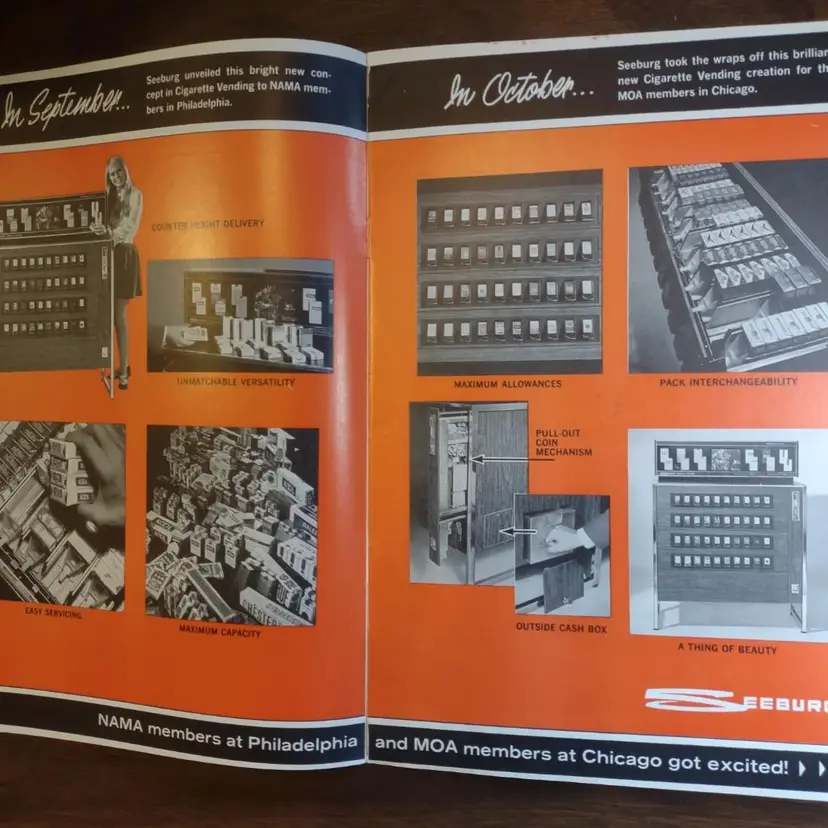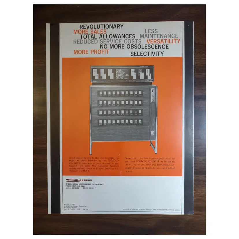This vintage Seeburg cigarette vending machine flyer booklet from 1968 is a rare find for collectors of ephemera and paper memorabilia. Measuring 8.5" x 11", it features stunning promo art and is in excellent shape for its age. Made in the United States, this item is a testament to the quality craftsmanship of the era and is sure to be a conversation starter in any collection. Its time period manufactured and modified item status make it a valuable addition to any vintage collection. Don't miss out on the chance to own a piece of history.