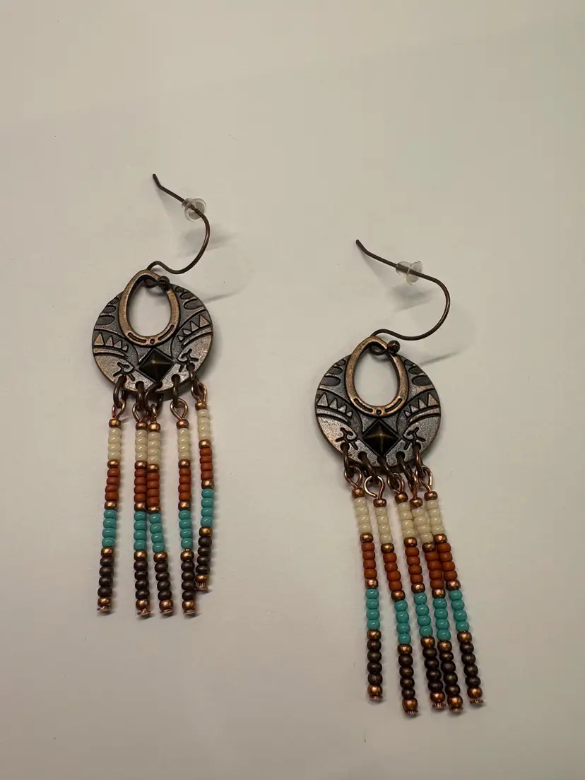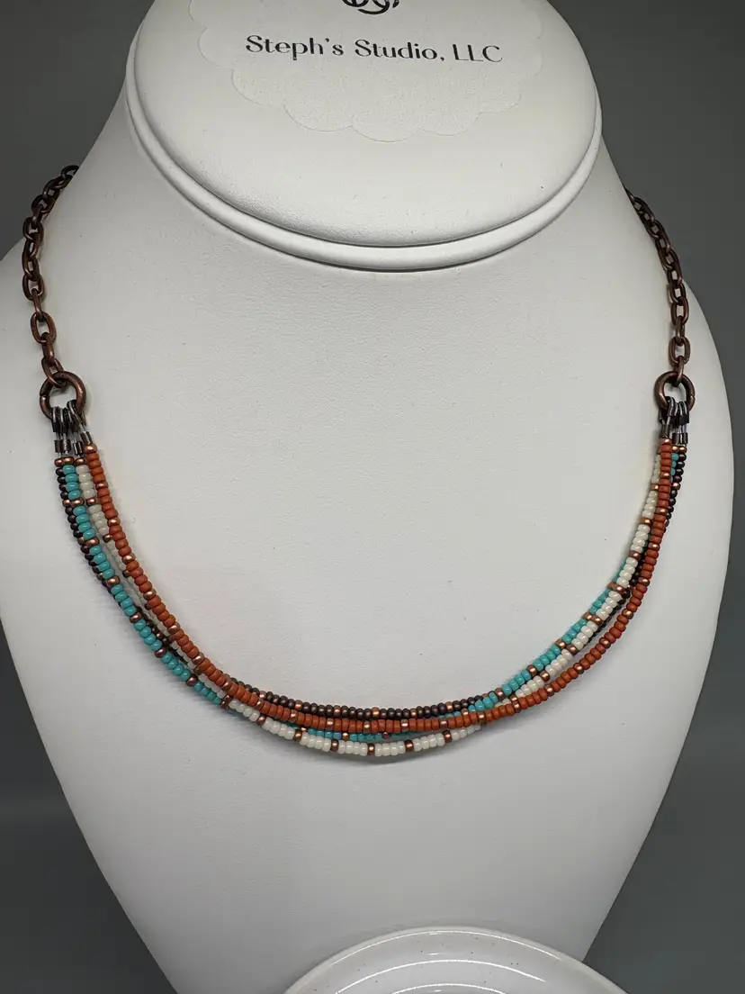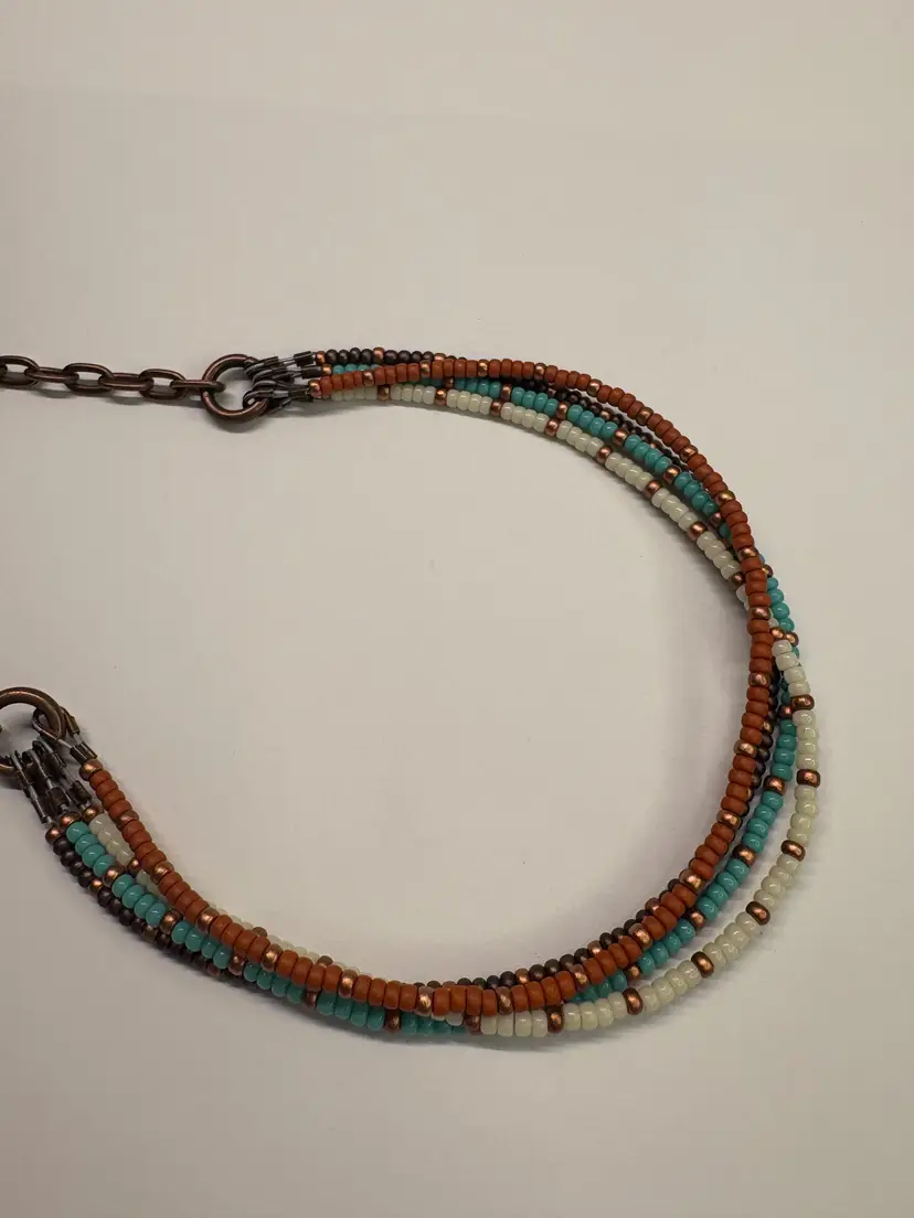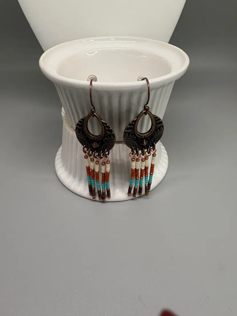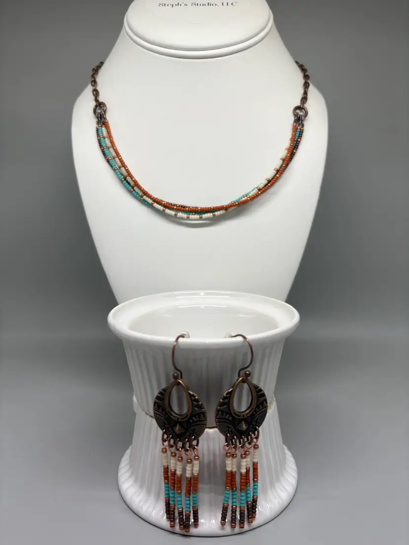 Seed bead necklace and earring set. Necklace is 20 inches long. Earrings have a 3 inch drop. Copper chain necklace and copper ear wire. Tierra Cast earring charms.