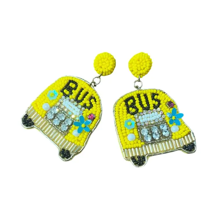 Bring the fun with these hand-beaded school bus earrings—perfect for teachers, bus drivers, or anyone who loves playful accessories! Bright yellow seed beads form a cheerful bus design, accented with rhinestones, tiny floral appliqués, and faux pearl details. Backed with metallic faux leather for lightweight wear. Each earring measures approx. 2.5” long and is full of personality.