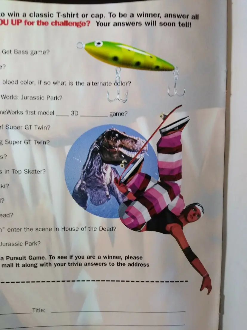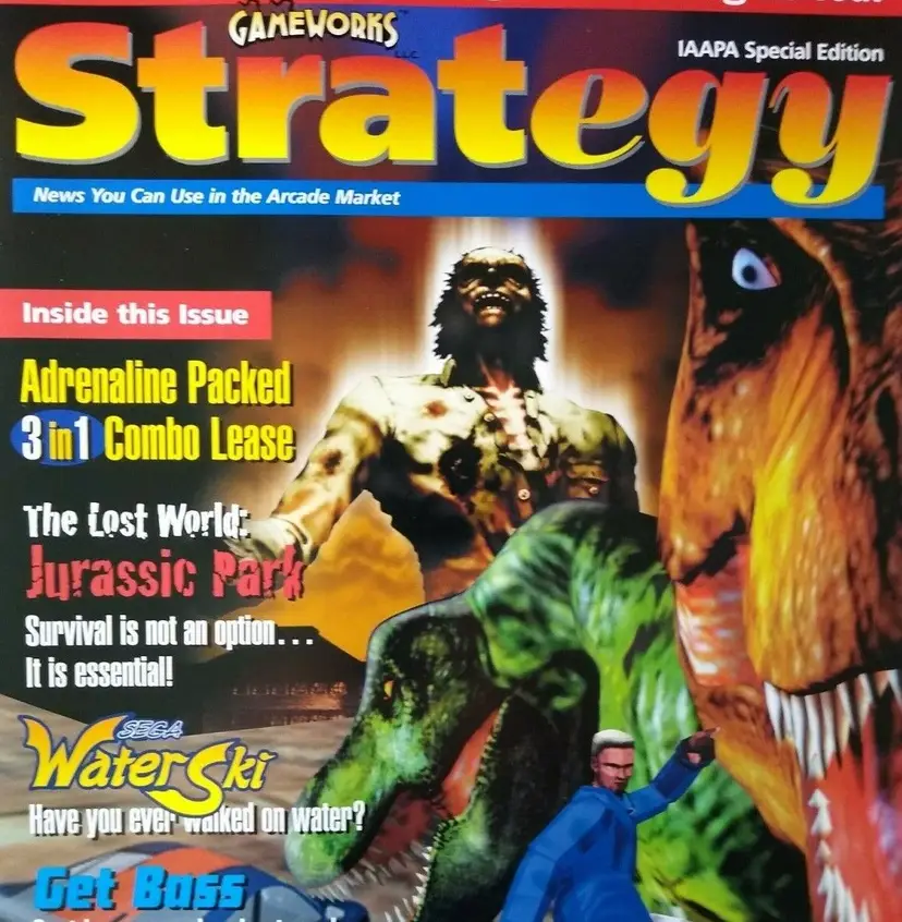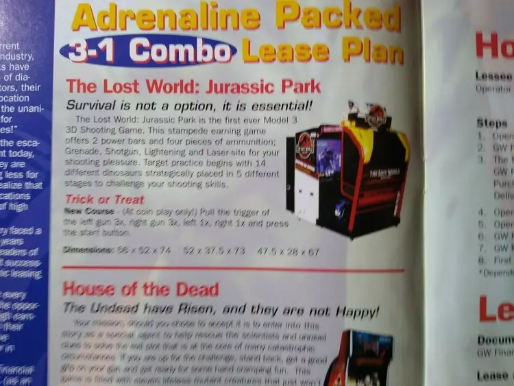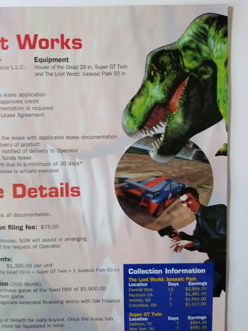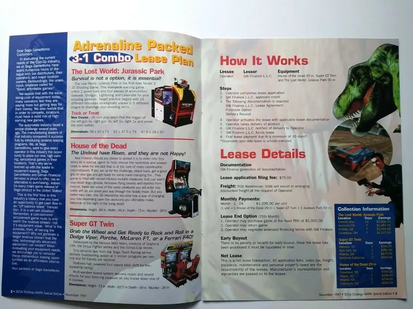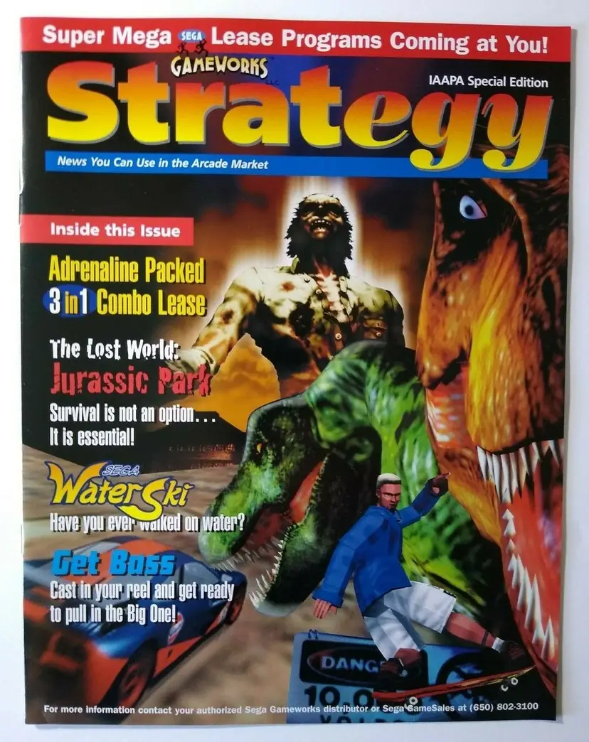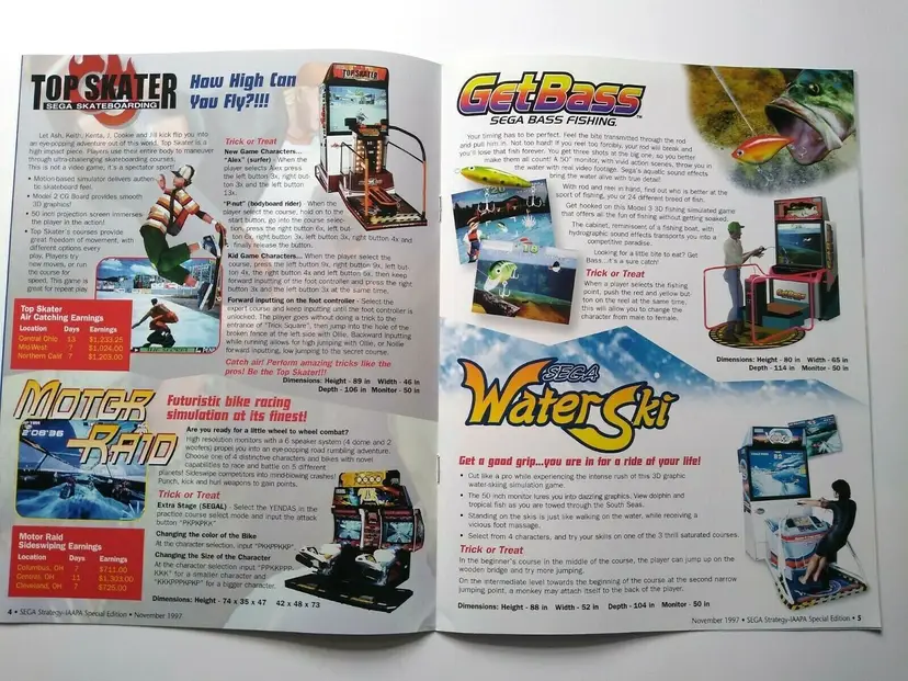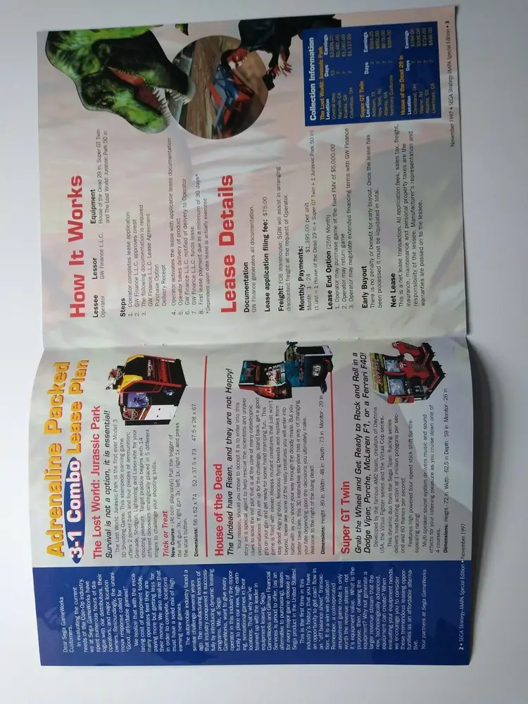 Original amusement arcade machine trade magazine produced by Sega. 8 pages loaded with color photos and information on their product line. Some of the games are: The Lost World Jurassic Park, House Of The Dead, Super GT Twin, Top Skater, Motor Raid, Get Bass, Water Ski, Wave Runner. Size is 8.5" X 11". New old stock with some corner creases.