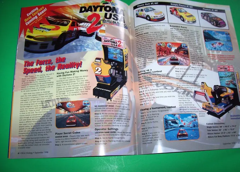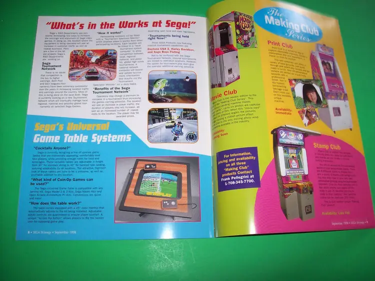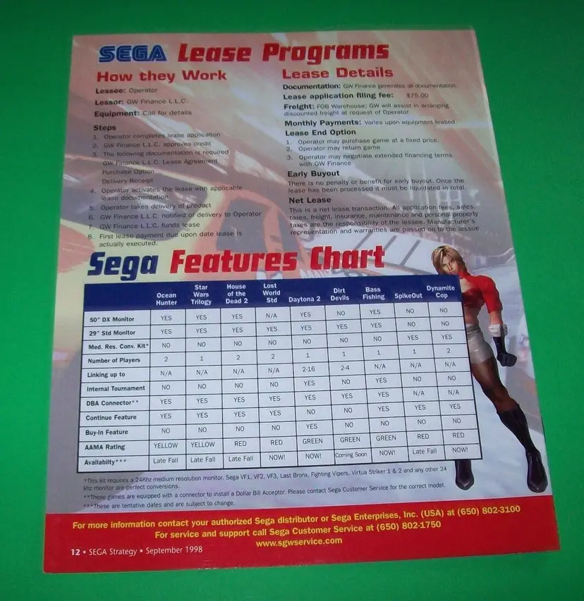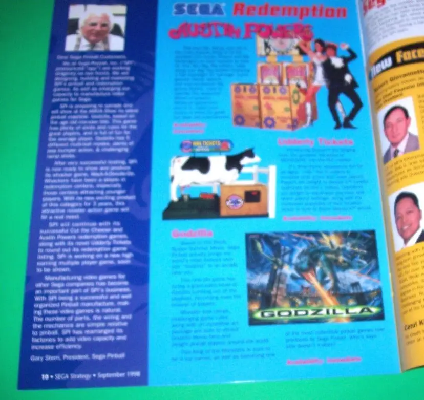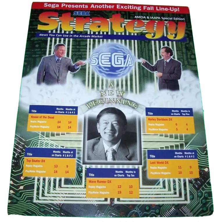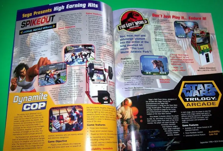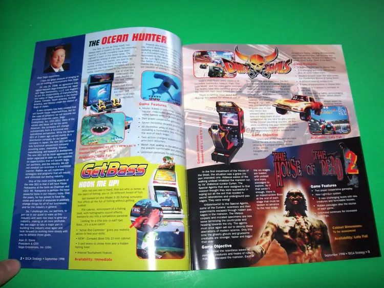 Original amusement arcade machine trade magazine produced by Sega. 12 pages loaded with color photos and information on their product line. Some of the games are: The Lost World Jurassic Park, House Of The Dead 2, Godzilla pinball machine, Austin Powers redemption game, Daytona USA 2, Star Wars Trilogy Arcade, Spike Out, Dirt Devils, Get Bass, & Ocean Hunter. Size is 8.5" X 11".