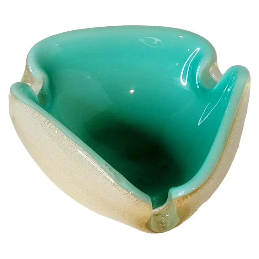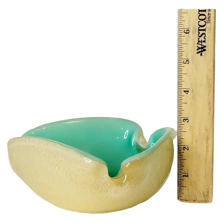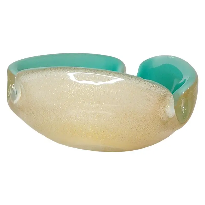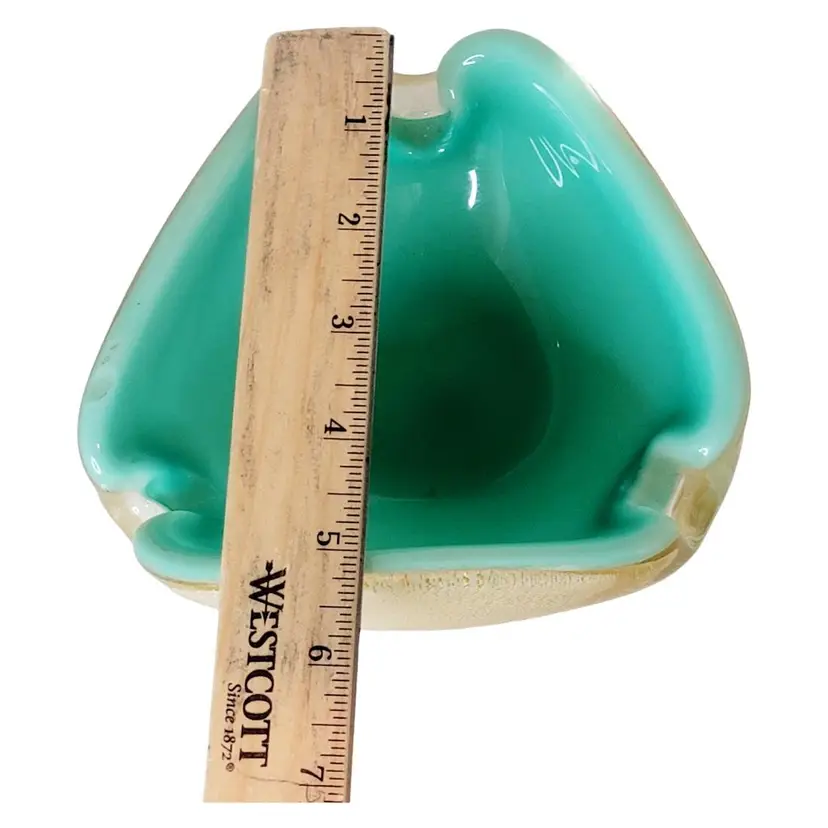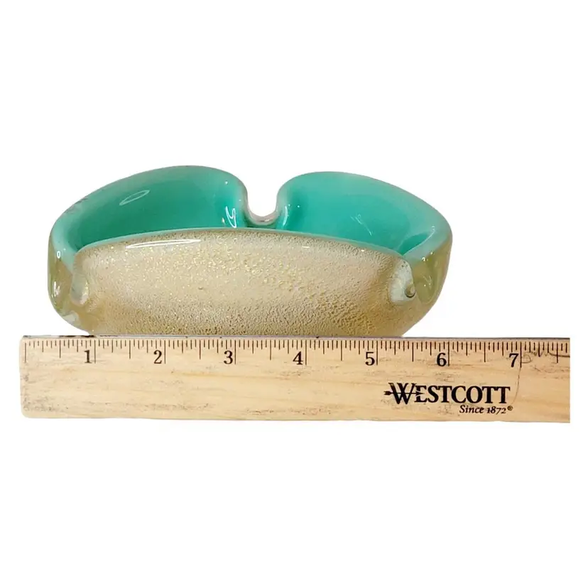 Seguso Murano Aqua Green Celadon Gold Flecks Italian Art Glass Dish Bowl Ashtray 5" long 6" wide 2.5" tall