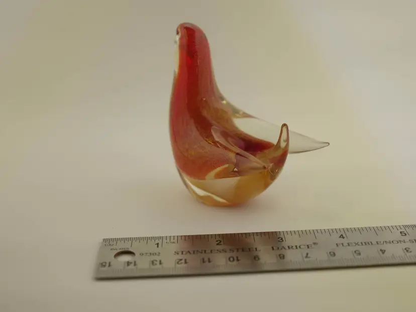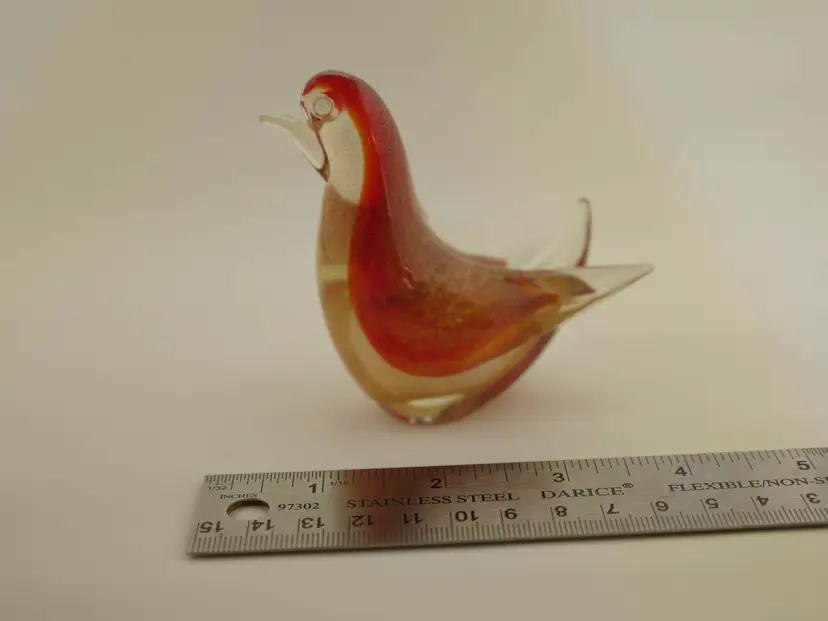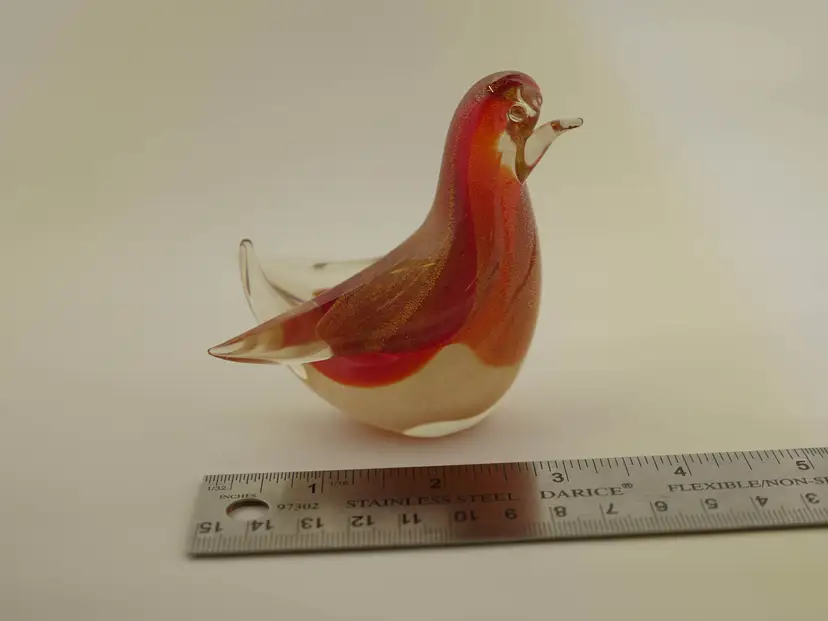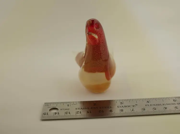 A pair of hand-blown Murano art glass birds, measuring approx. 3 & 3.5 inches in height. The pair each features a vibrant red color with shimmering gold, a technique known as Polveri and an elegant, pulled tail. They are both in excellent condition with no chips or cracks.