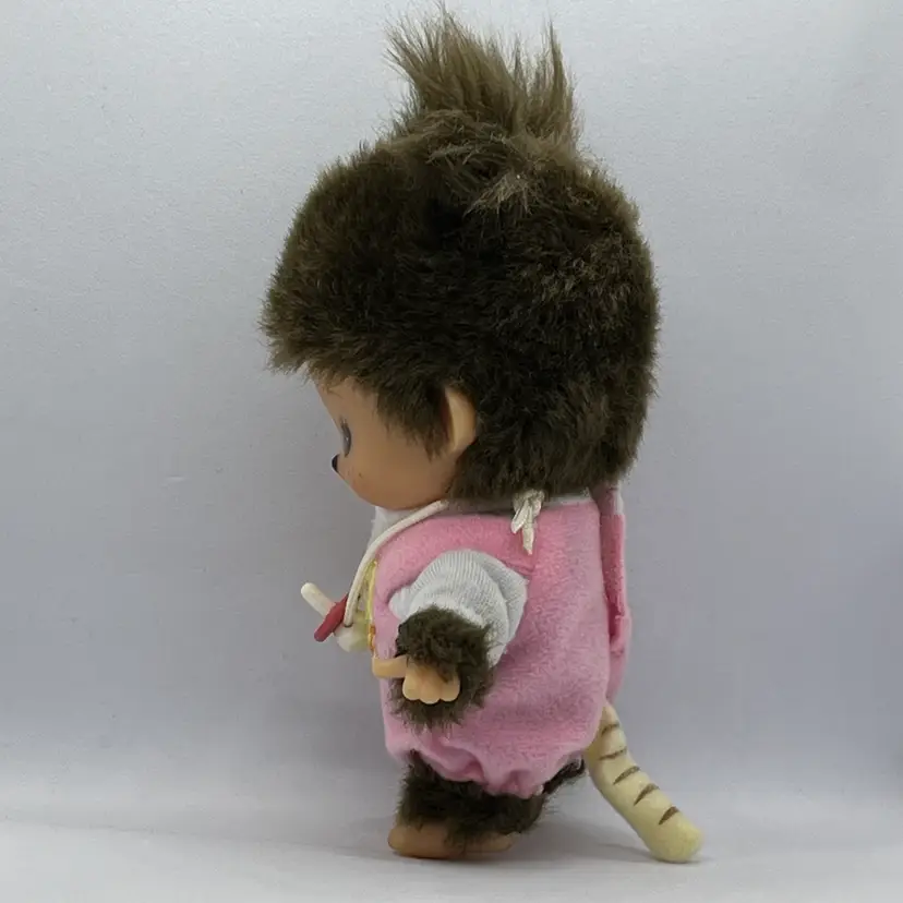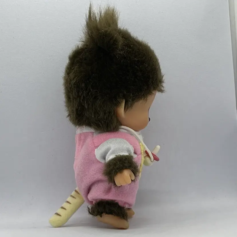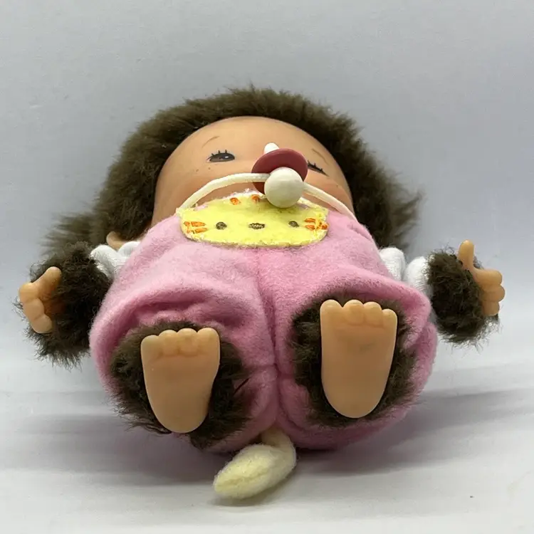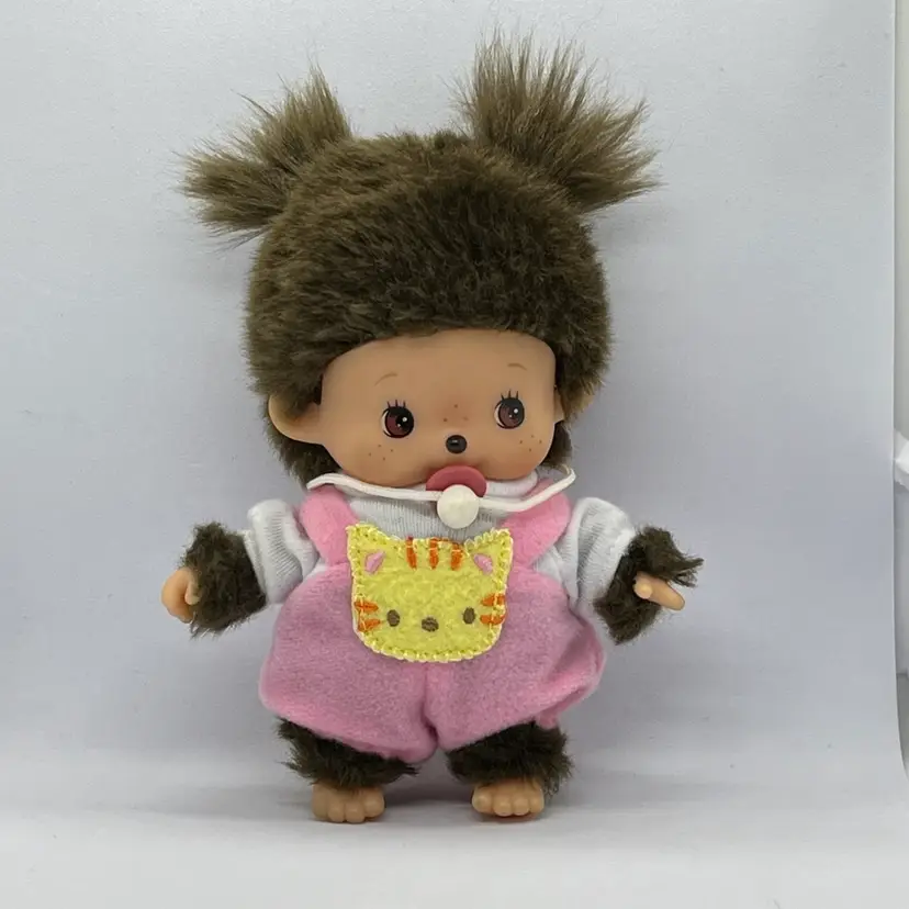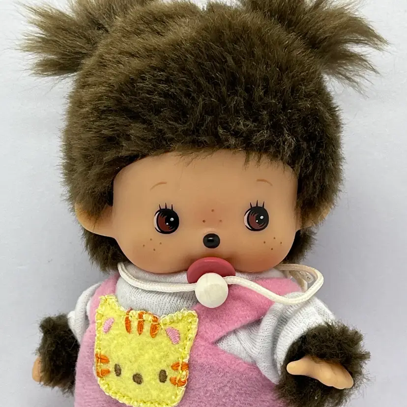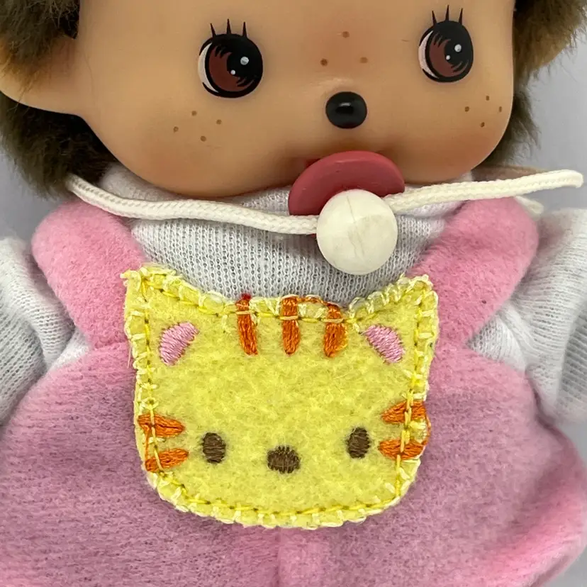This is a Sekiguchi Monchhichi Bebichhichi pacifier/thumbsucker plush doll wearing an ADORABLE kitty outfit.