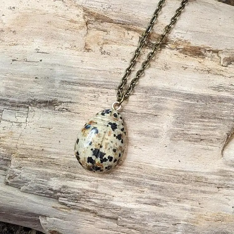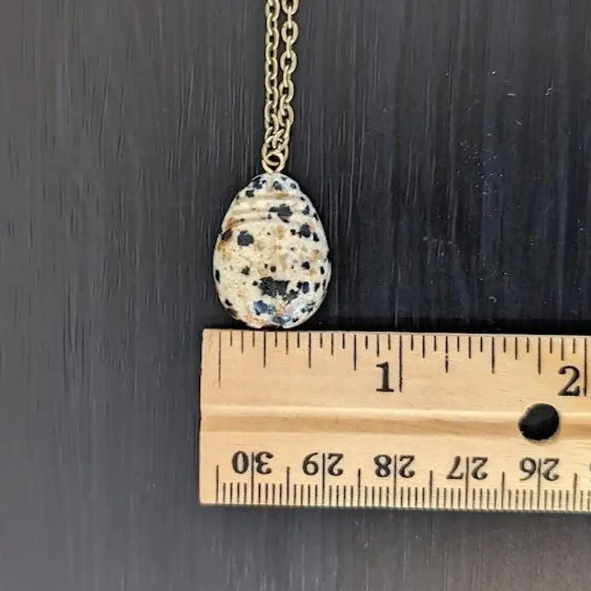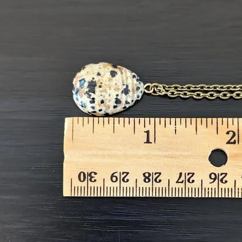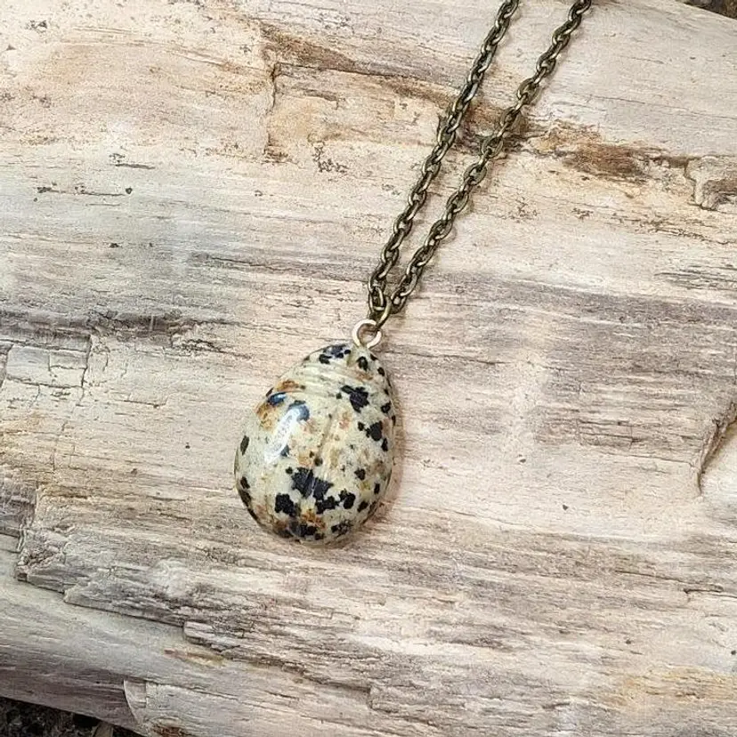 One of a kind necklaces made by Sela. Natural dalmatian jasper stone on bronze toned chain. 20" Chain