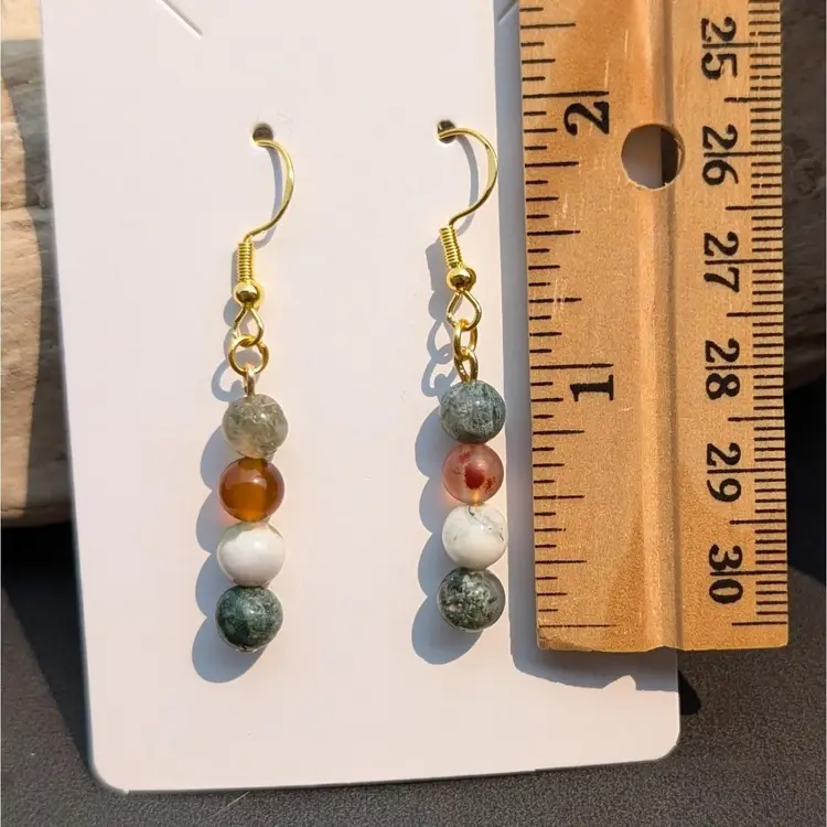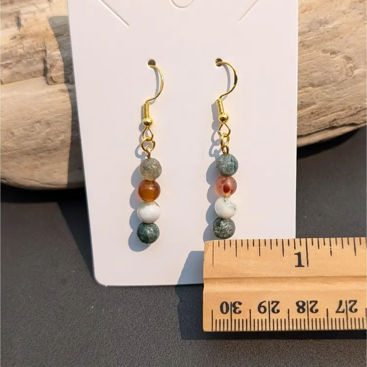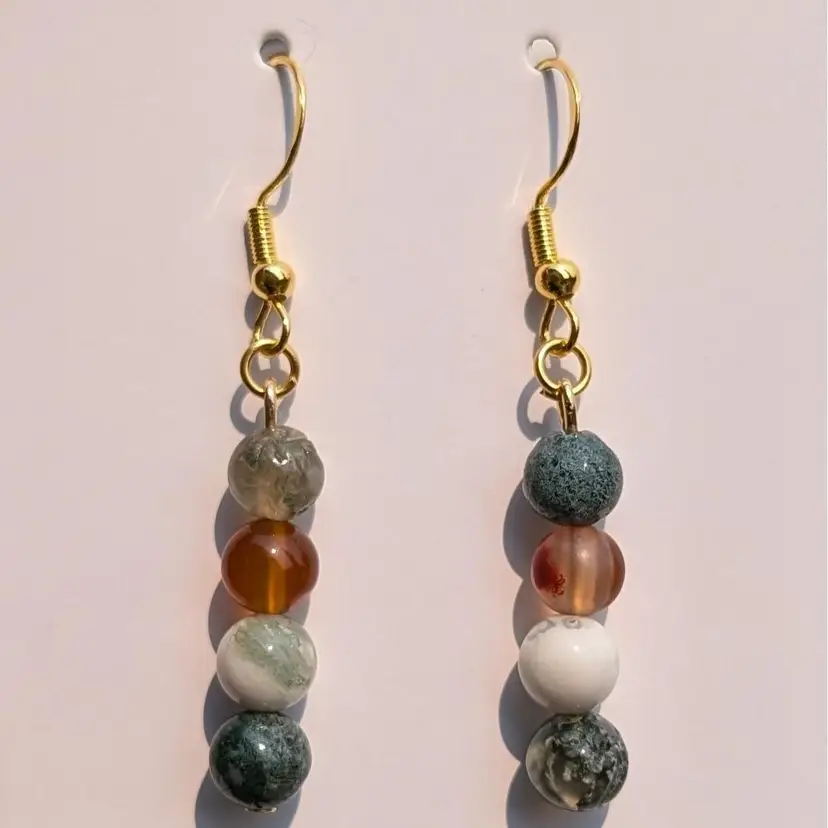 One of a kind earrings made by Sela. Dragon Agate stone beads on gold toned wire and 925 plated hooks.
