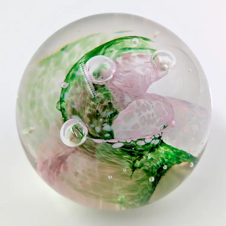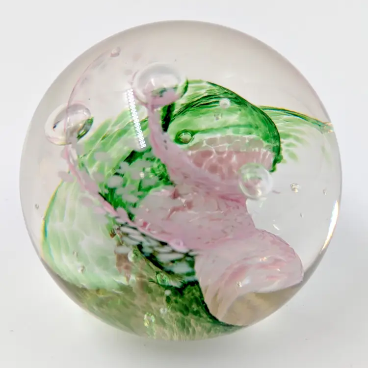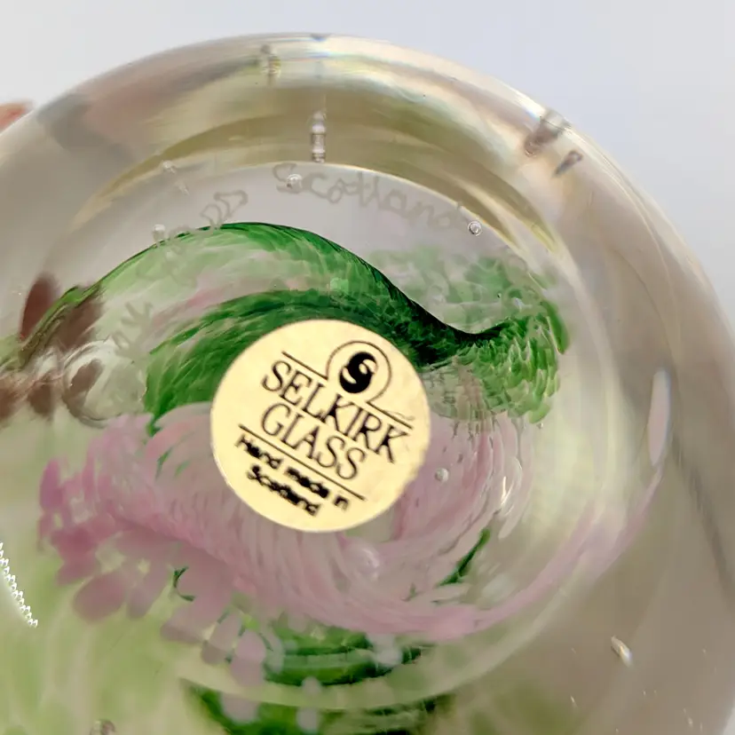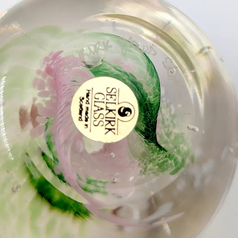 Beautiful paperweight from Selkirk Scotland with green and pink swirls. Has a Selkirk sticker on the bottom and is also etched. No chips or cracks.
