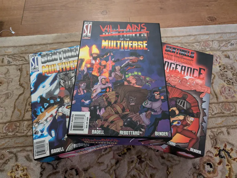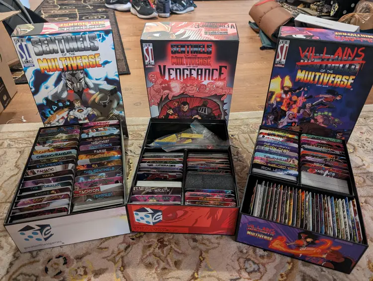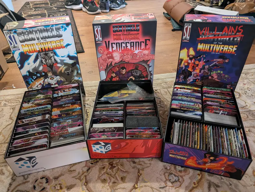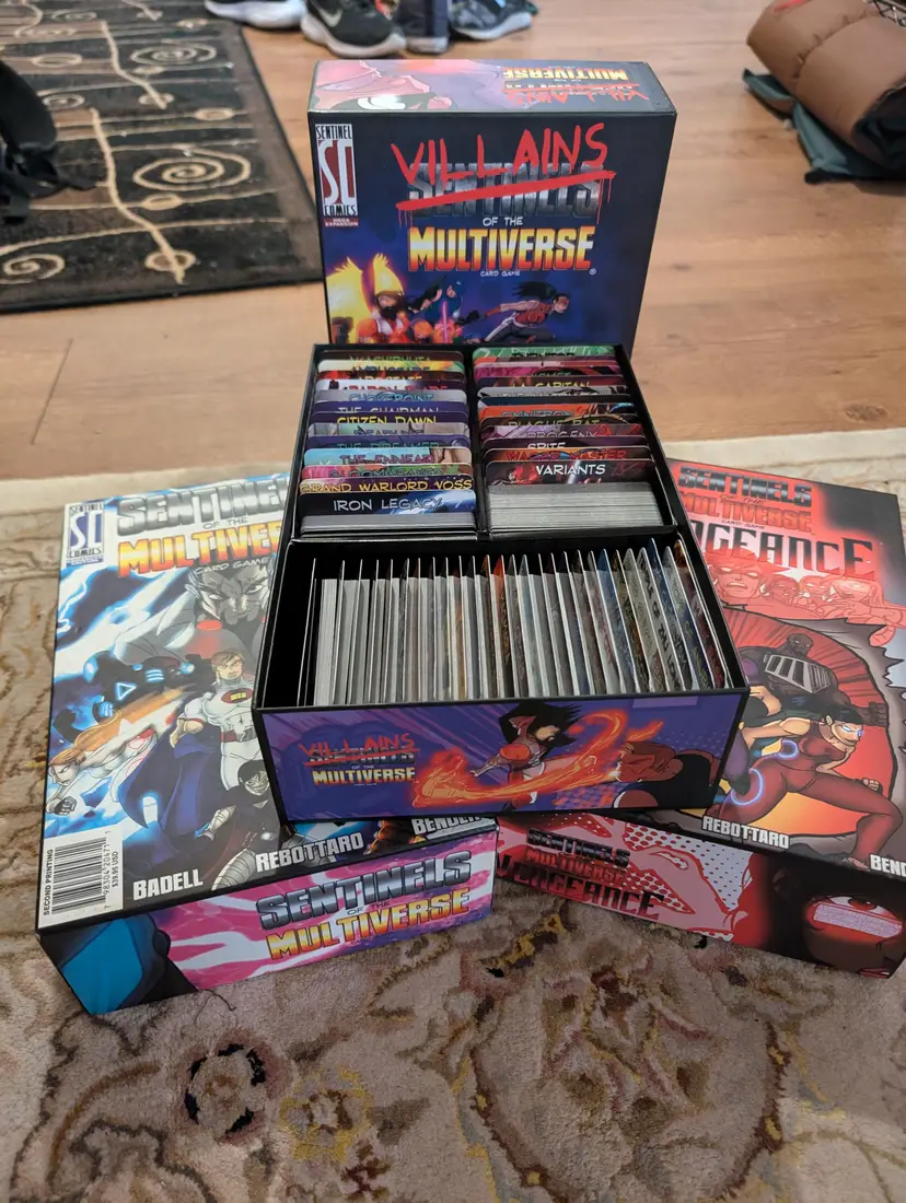 This is a complete collection of Sentinels of the multiverse (2nd / enhanced edition). This includes all variants, and products, sans the collectors box. Instead the game is kept in 3 separate sentinels product boxes. Cards are all in excellent condition. Some of the dividers show wear.
