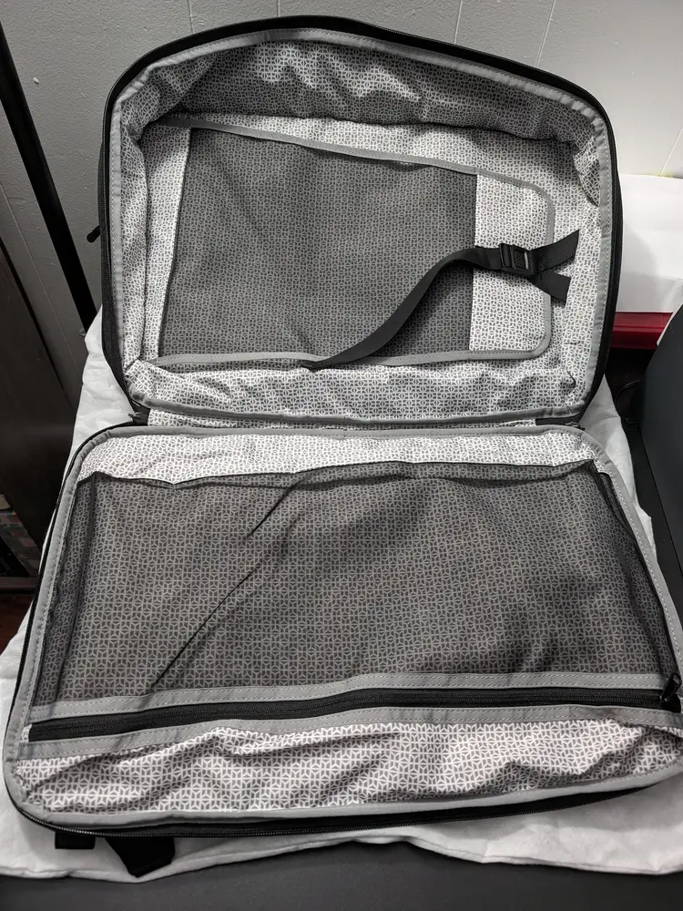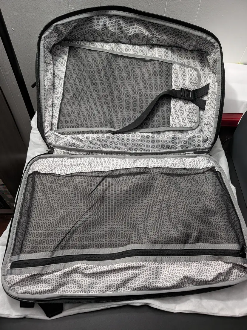 Expands from 30 to 46 Liters. Holds 17" laptop with several outfits. Hidden, zip away side water bottle. Tuck away back pack straps.