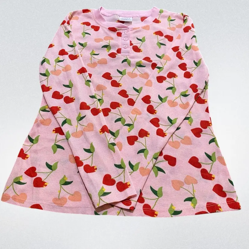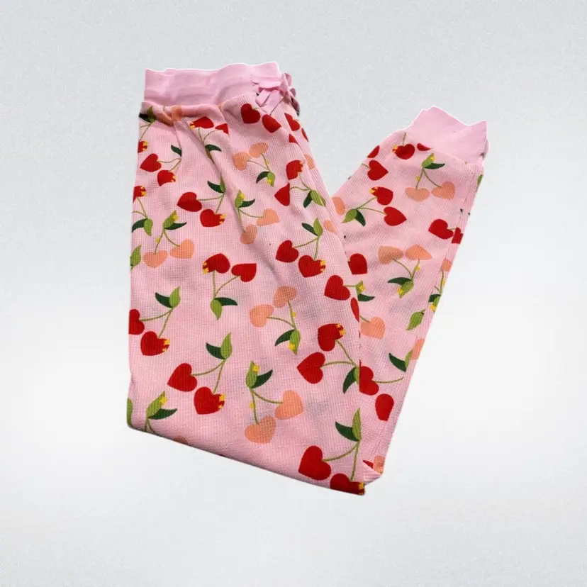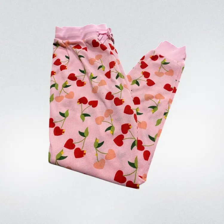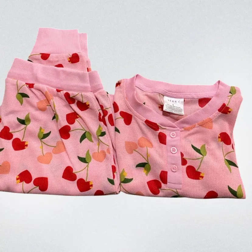 Pajama set with cherries waffle weave pattern cuff on bottom of pants. Excellent condition. Worn once. Size Large 60% cotton 40% polyester