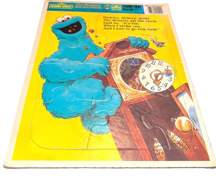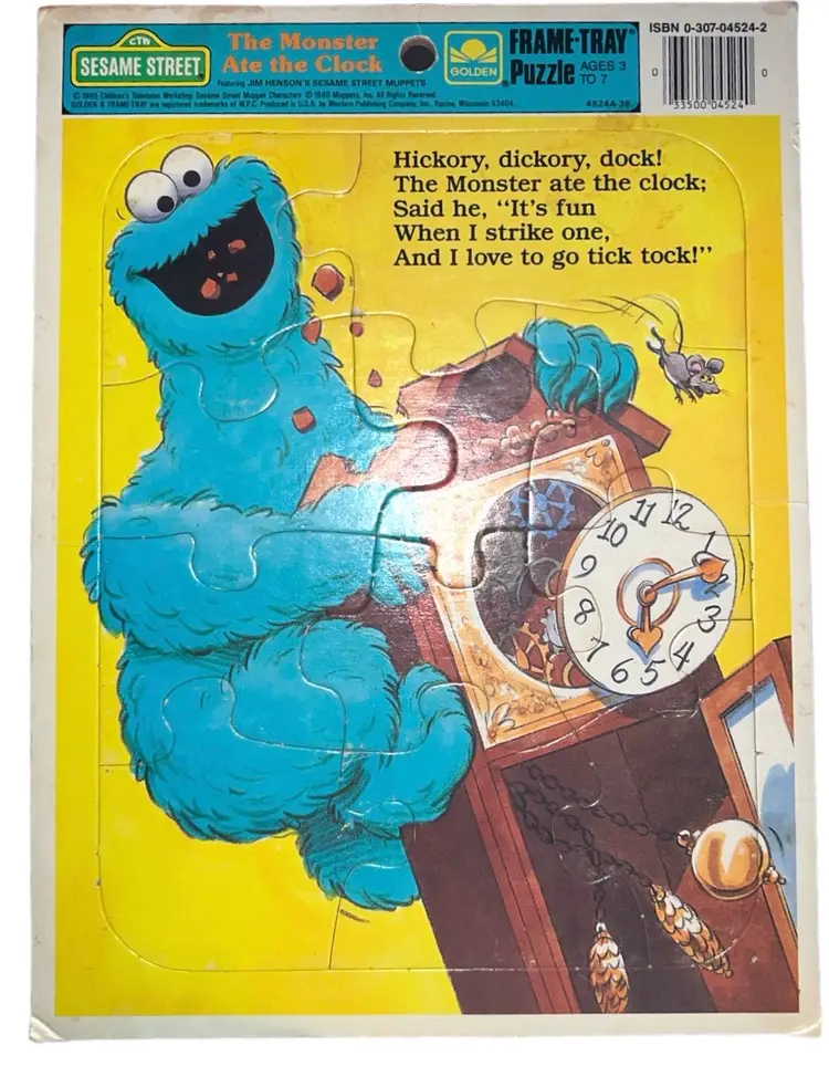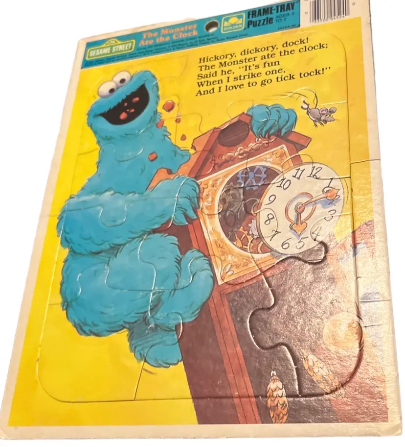 This vintage Sesame Street Golden puzzle features Cookie Monster in "The Monster Ate the Clock" scene from 1989. With less than 15 pieces, this tray puzzle is perfect for little ones aged 3-7 years old. The multi-color puzzle pieces are made from cardboard and showcase Cookie Monster's playful character. This puzzle is a must-have for any Sesame Street fan and is a great addition to any puzzle collection.