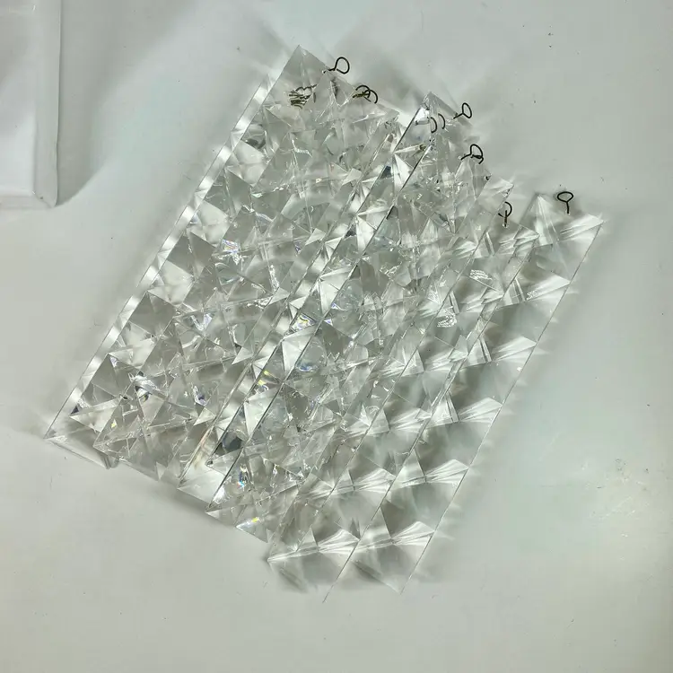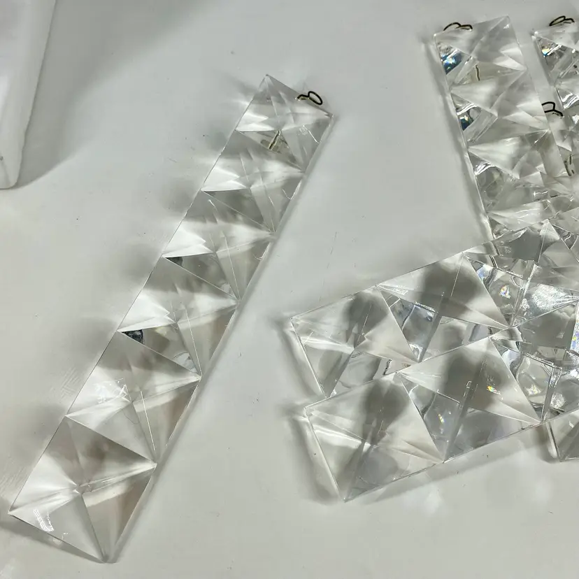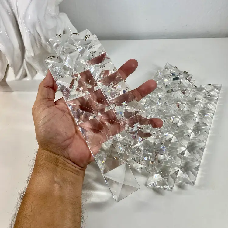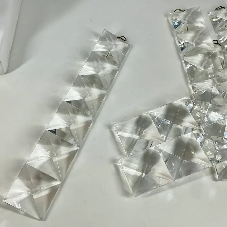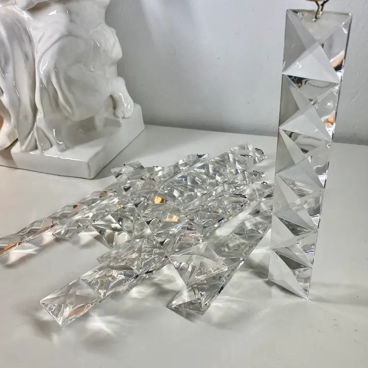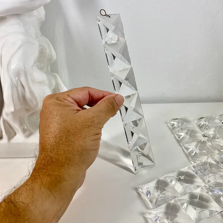 Hi... Add some retro charm to your Christmas tree with these elegant dangling rectangular icicles. The set includes ten crystal clear prism ornaments, each measuring 7.75 inches in height and 1.25 inches in width. The 6 segmented pyramid pattern and square shape of the prisms make for a unique and modern addition to your holiday decor. These vintage ornaments were manufactured in the 1980s and are perfect for collectors and anyone looking to add some sparkly nostalgia to their holiday decor. The molded pressed plastic production gives the ornaments a durable and long-lasting quality. Bring some sparkle and elegance to your tree or home with these beautiful shimmering icicles.