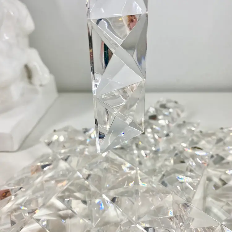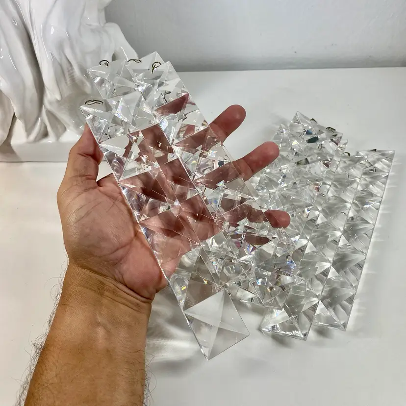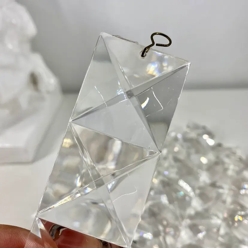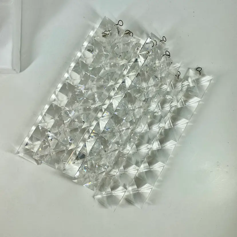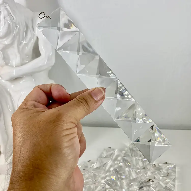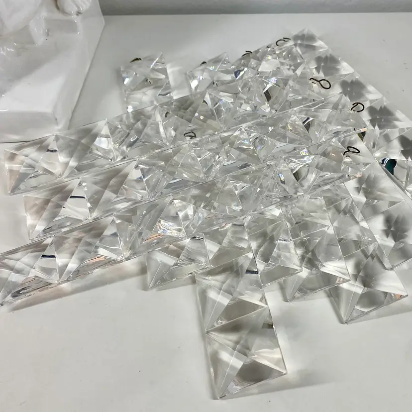 Hi... Add some retro charm to your Christmas tree with these elegant dangling rectangular icicles. The set includes ten crystal clear prism ornaments, each measuring 7.75 inches in height and 1.25 inches in width. The 6 segmented pyramid pattern and square shape of the prisms make for a unique and modern addition to your holiday decor. These vintage ornaments were manufactured in the 1980s and are perfect for collectors and anyone looking to add some sparkly nostalgia to their holiday decor. The molded pressed plastic production gives the ornaments a durable and long-lasting quality. Bring some sparkle and elegance to your tree or home with these beautiful shimmering icicles.