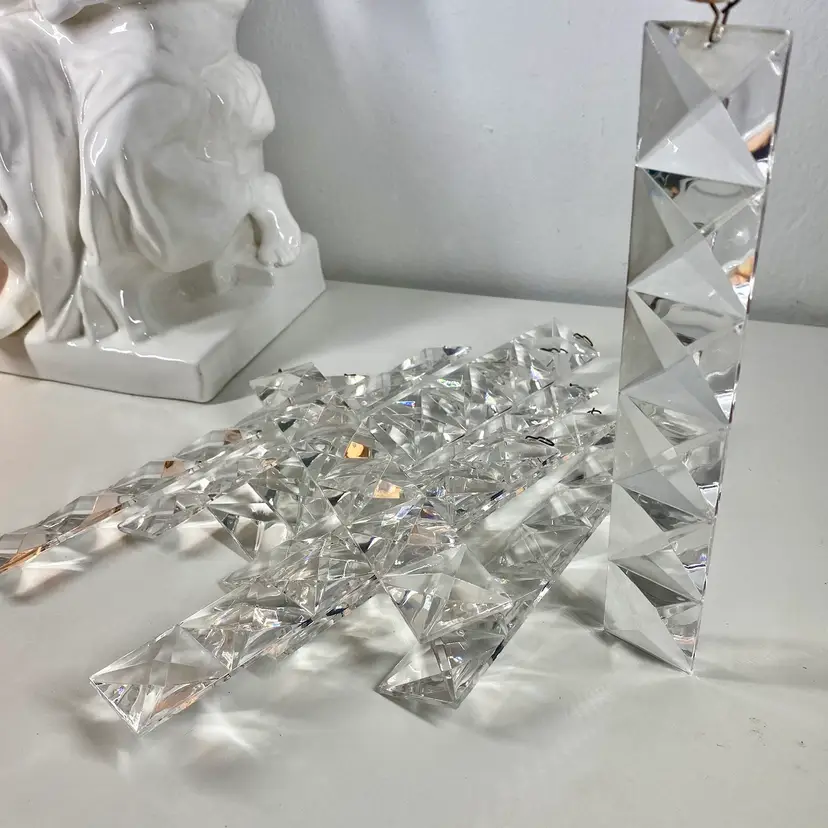 These handsome piece are in very good condition. No chips, cracks, or stains. One or two tiny scratches might exist because of the way they were originally stored but overall they're in wonderful condition. Each prism icicle comes ready to hang.