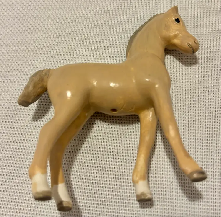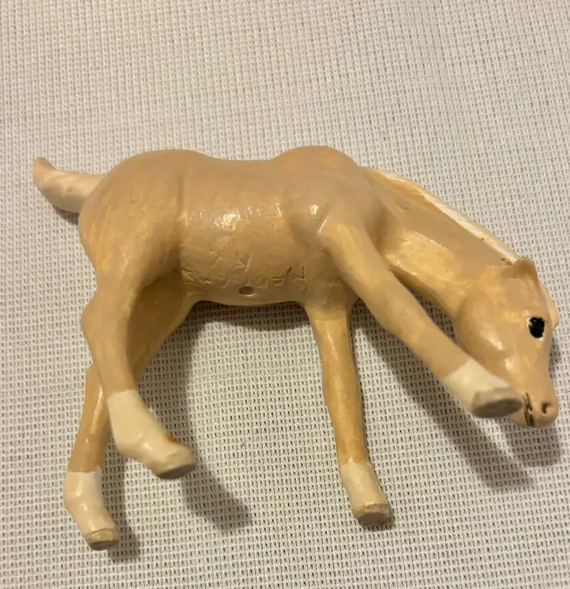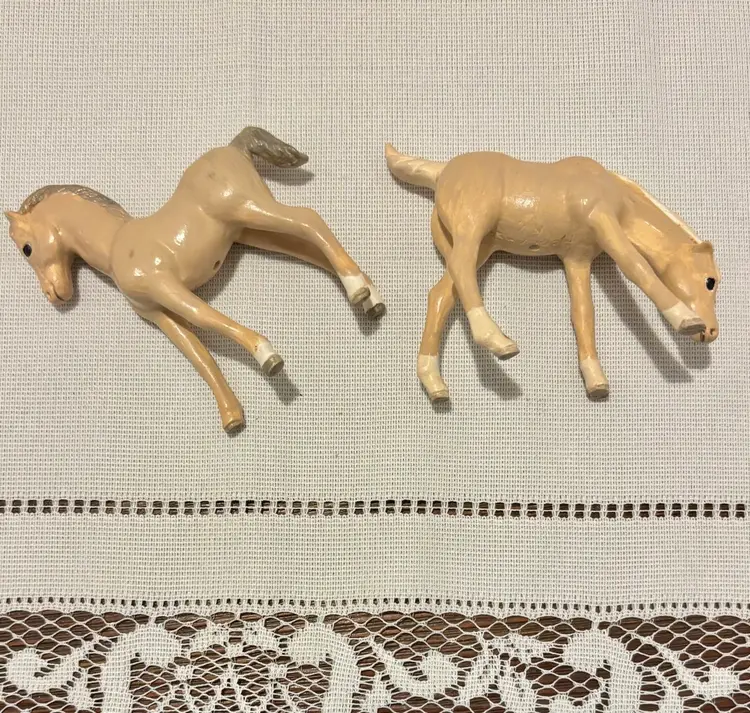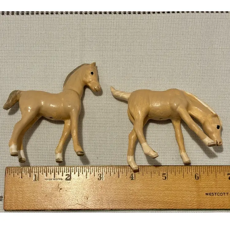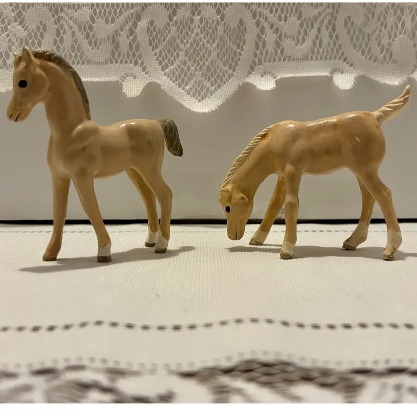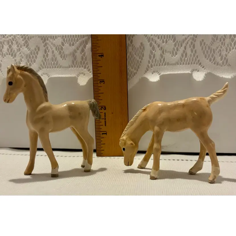 Vintage mini ceramic horse figurines, likely from the mid-20th century. The figurines appear to be "Pearly" models, possibly the CL Arabian Foal or CL Quarter Horse Foal in a palomino color variant. They were likely manufactured in Japan by companies such as Napco or Ucagco, which often produced similar, uncopyrighted ceramic items in the 1950s and 1960s. The figures feature a glossy finish and a palomino coloration with black hooves and grey tails. The one on the left is standing, while the one on the right is in a grazing or bowed pose.