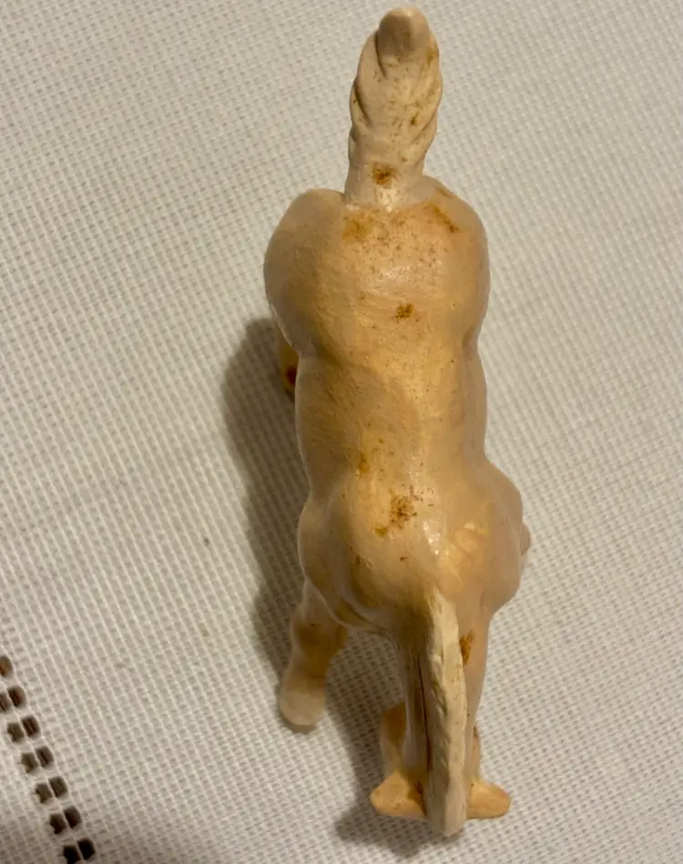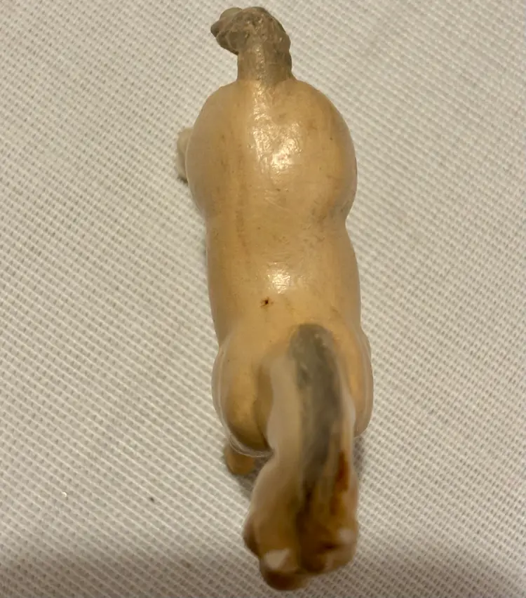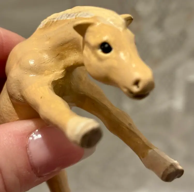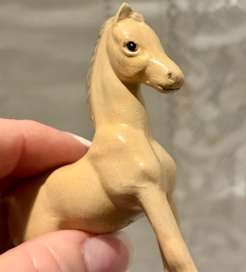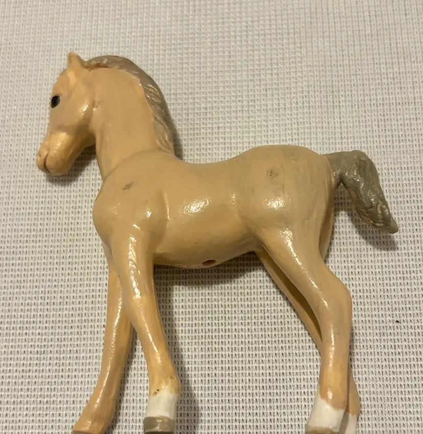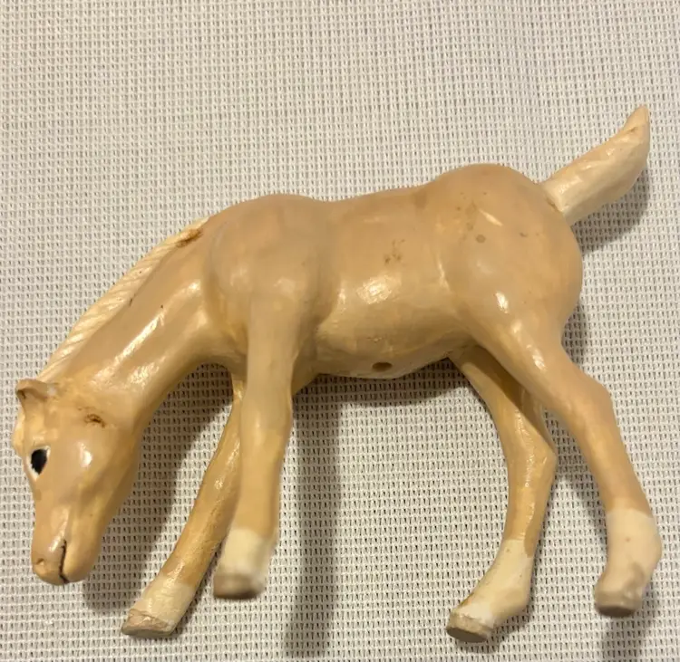 Vintage mini ceramic horse figurines, likely from the mid-20th century. The figurines appear to be "Pearly" models, possibly the CL Arabian Foal or CL Quarter Horse Foal in a palomino color variant. They were likely manufactured in Japan by companies such as Napco or Ucagco, which often produced similar, uncopyrighted ceramic items in the 1950s and 1960s. The figures feature a glossy finish and a palomino coloration with black hooves and grey tails. The one on the left is standing, while the one on the right is in a grazing or bowed pose.