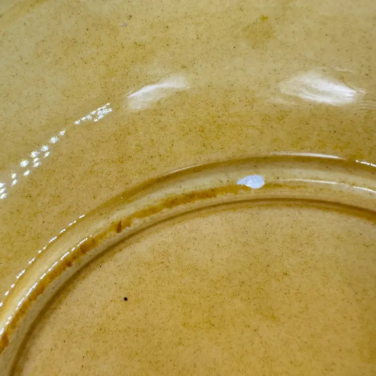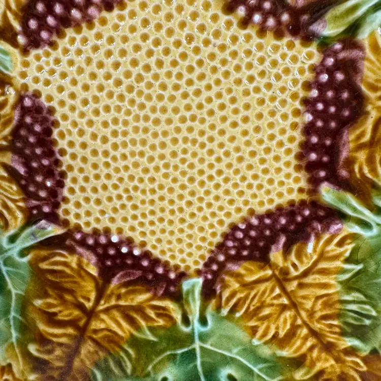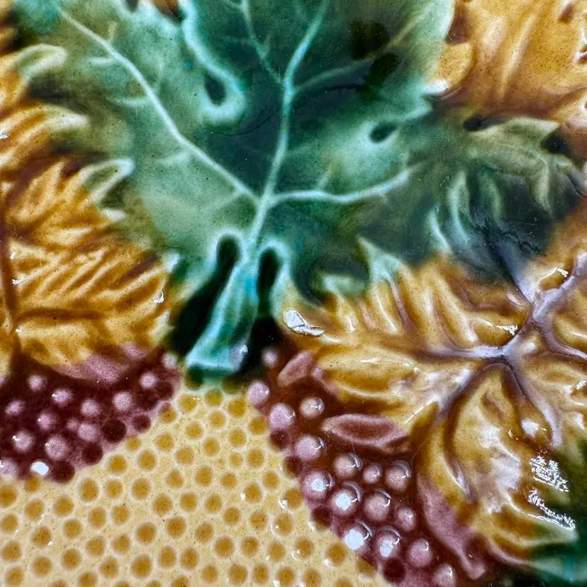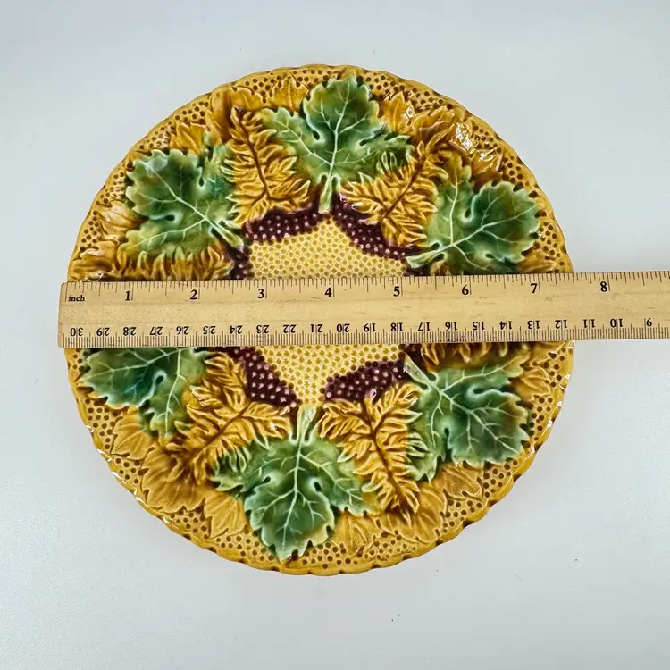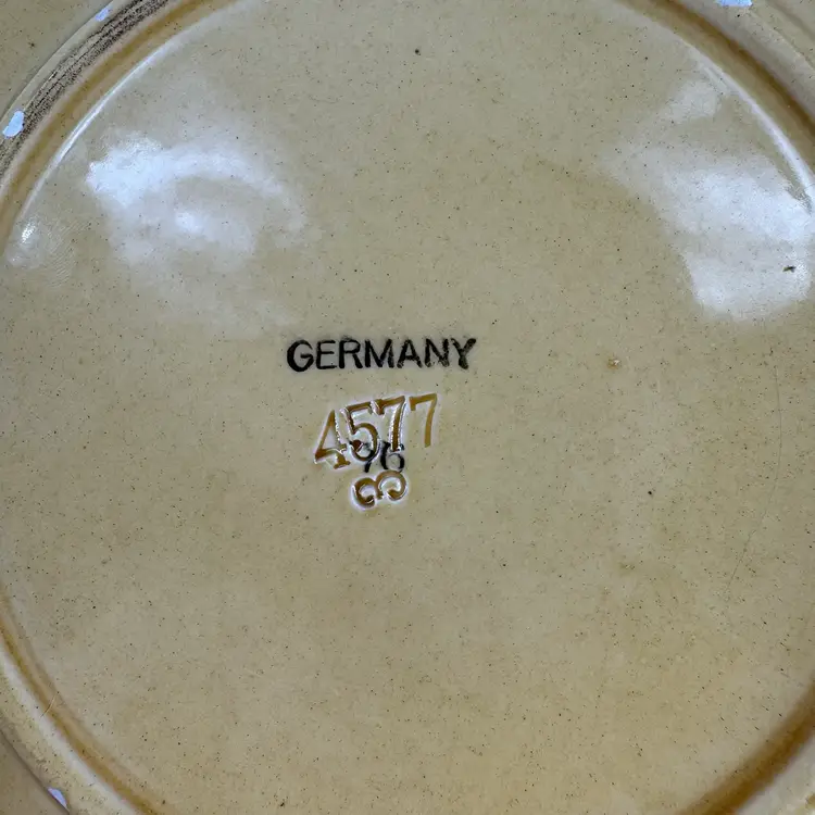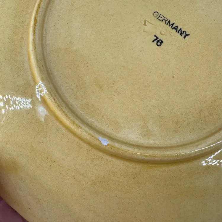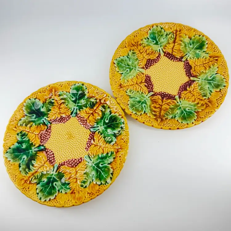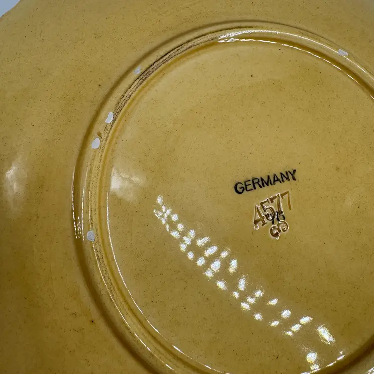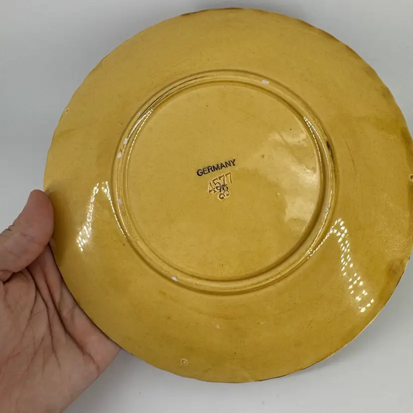 This set of 2 majolica plates are approximately 7.5” wide. There is little chips in the glaze. Also has crazing in the glaze as well. They are marked “Germany” on the bottom.