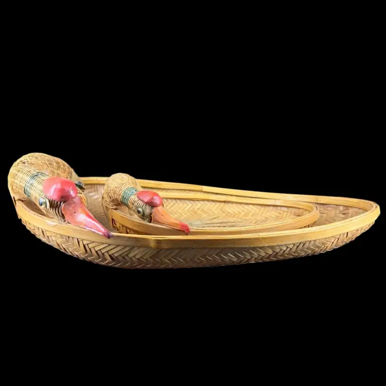 This Set 2 Rattan Duck Baskets the large one is approximately 15” in length, the smaller one is approximately 9.5” in length. The larger one does have damaged to the duck missing tail feathers and has a hole on the body all of the damage can be seen in the photos. There is no damage to the small one. They are marked “Made in China”.