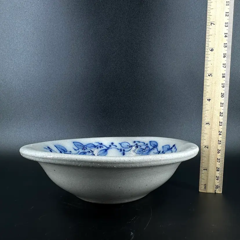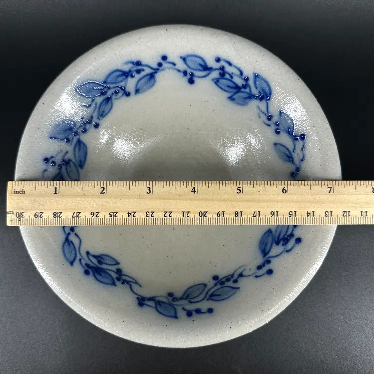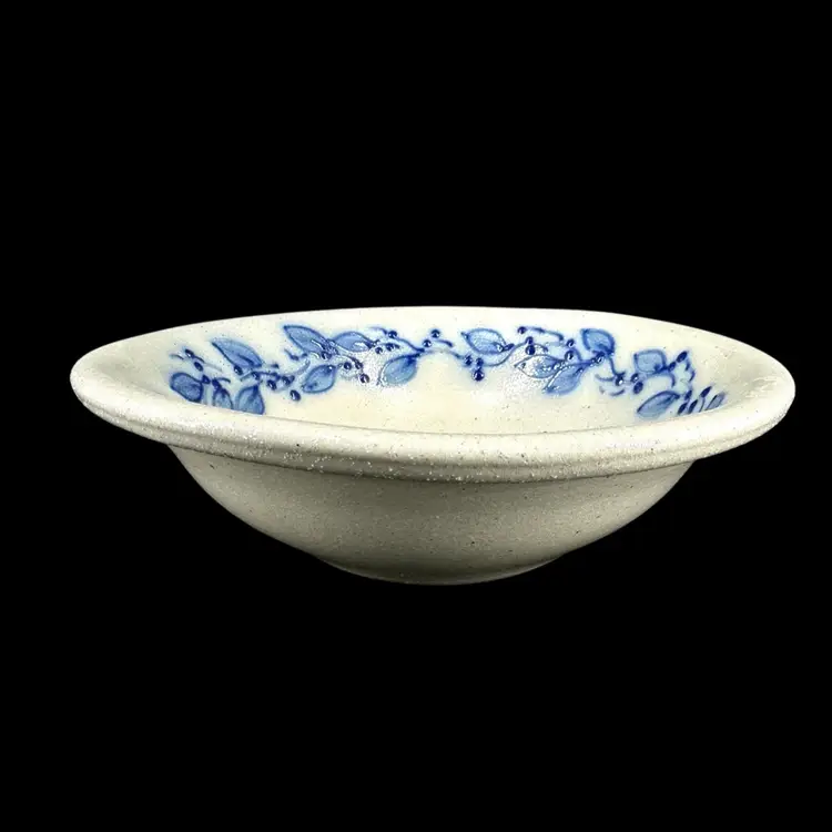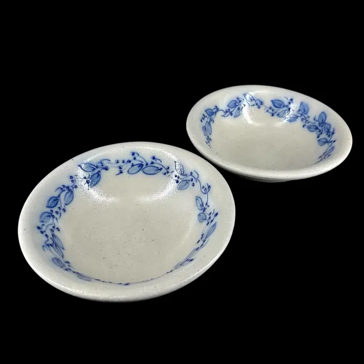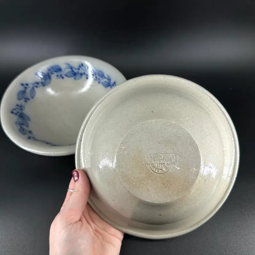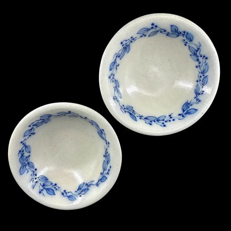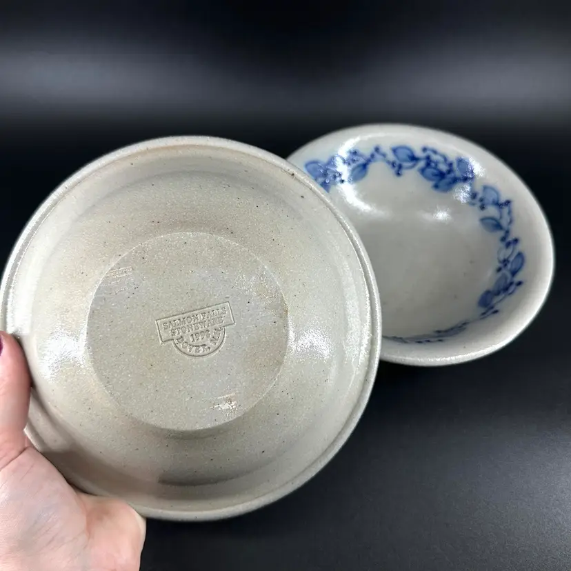 Set of two dinner bowls made by Salmon Falls Stoneware. Each bowl features their “Bluebird” pattern rim and a salt glaze. “SALMON FALLS STONEWARE DOVER, N.H. 1998” stamp engraved on bottom of both bowls. No chips or cracks. Each bowl measures approximately 2” high and 7.25” wide.