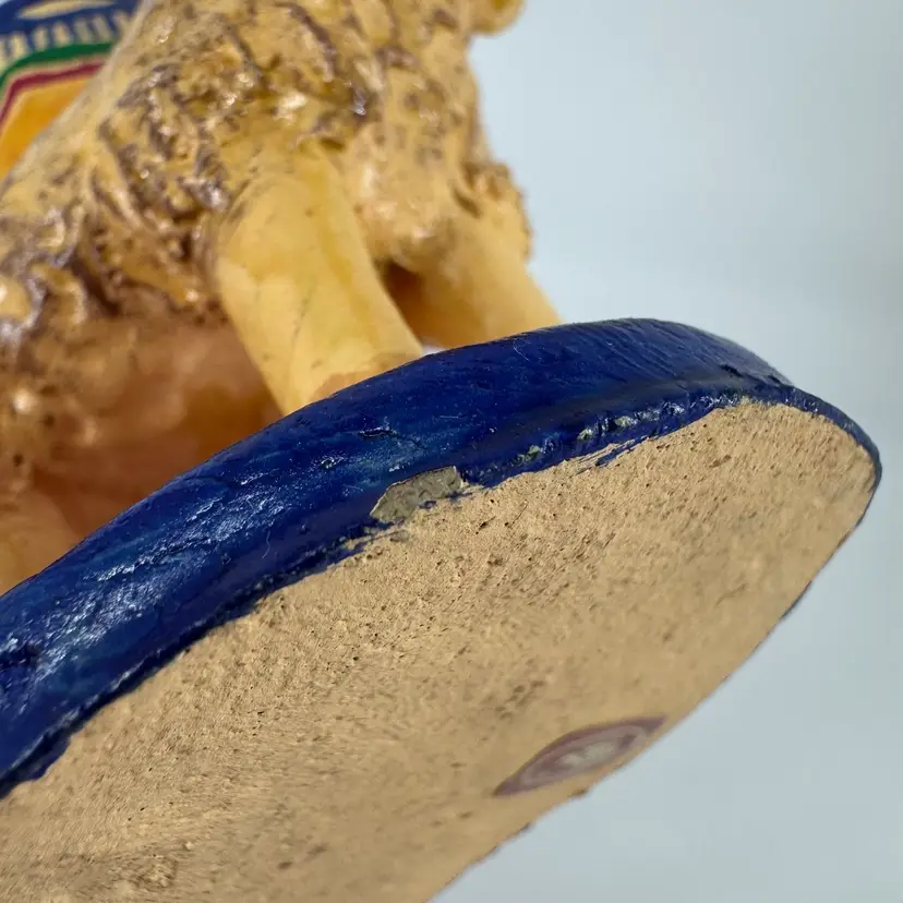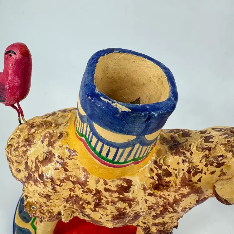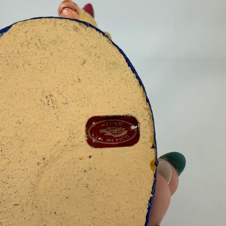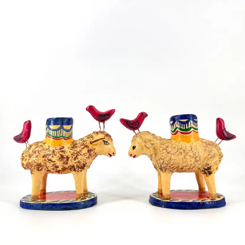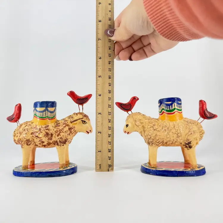 This Set 2 Sheep Candle Holders Mexico is approximately 4” in height for the both of them. There is some paint wear on the one around the rim of where the candle is held. Can be seen in the photos. They are both marked “Mecho En Mexico” in the bottoms with a sticker.