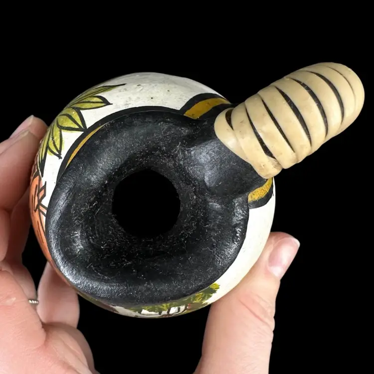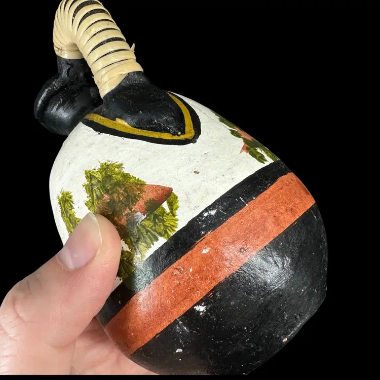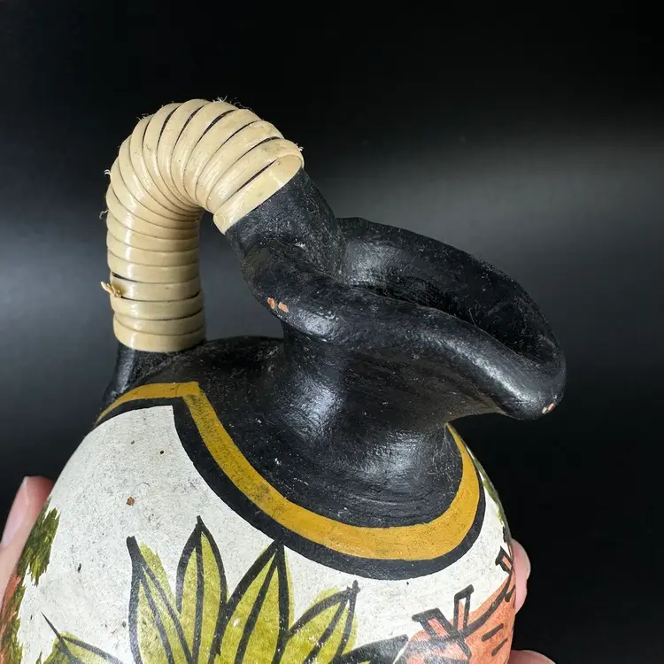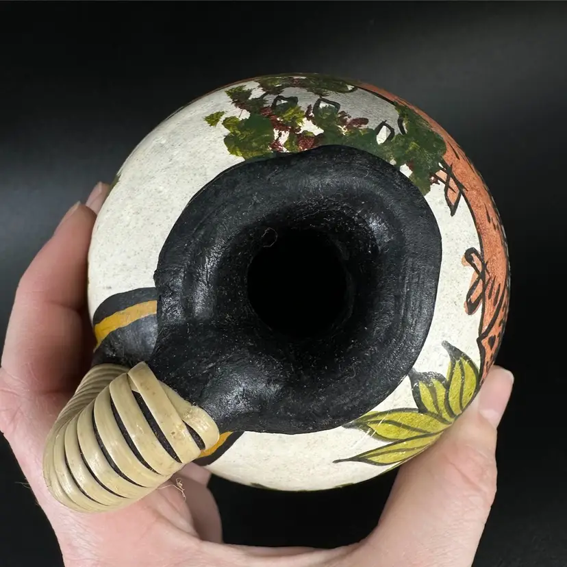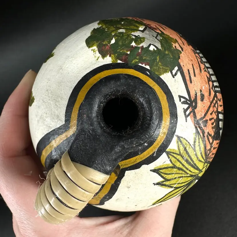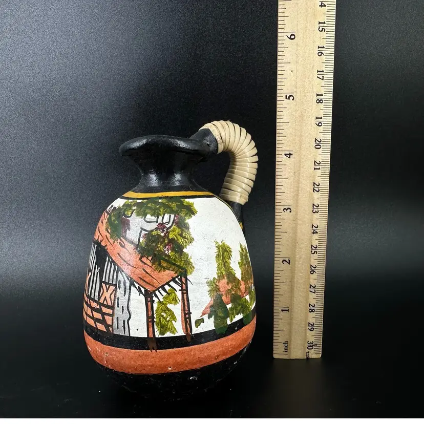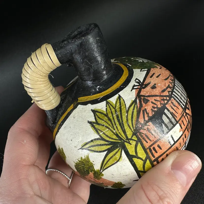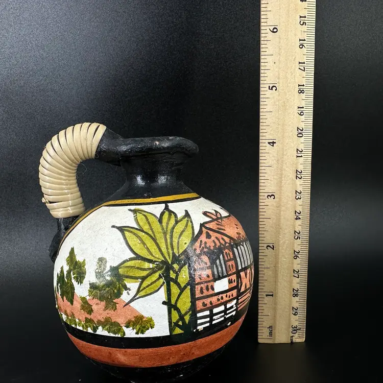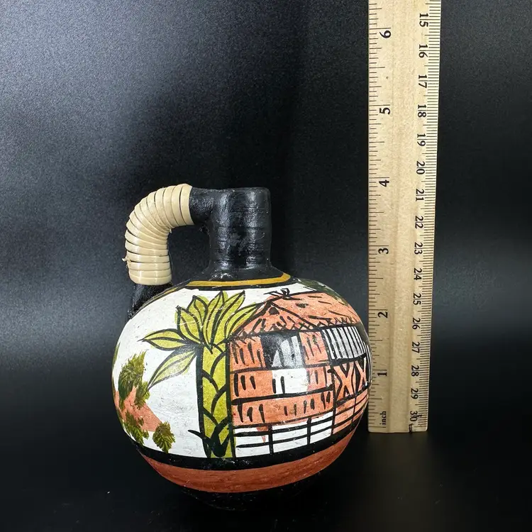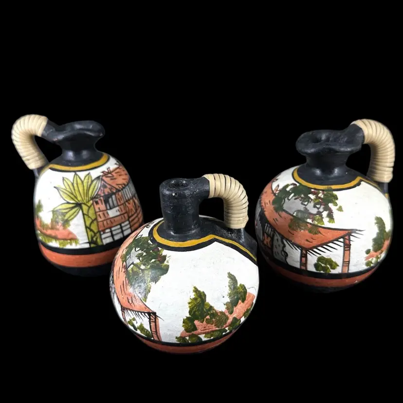 Set of three pottery jugs featuring handpainted African house/palm tree scenes. Each jug depicts same scene, but is each uniquely handpainted. Entwined handles are slightly frayed. No cracks, some chipping in the paint and wear on the bottom. No signatures or markings . Pitchers measure approximately 4” tall.