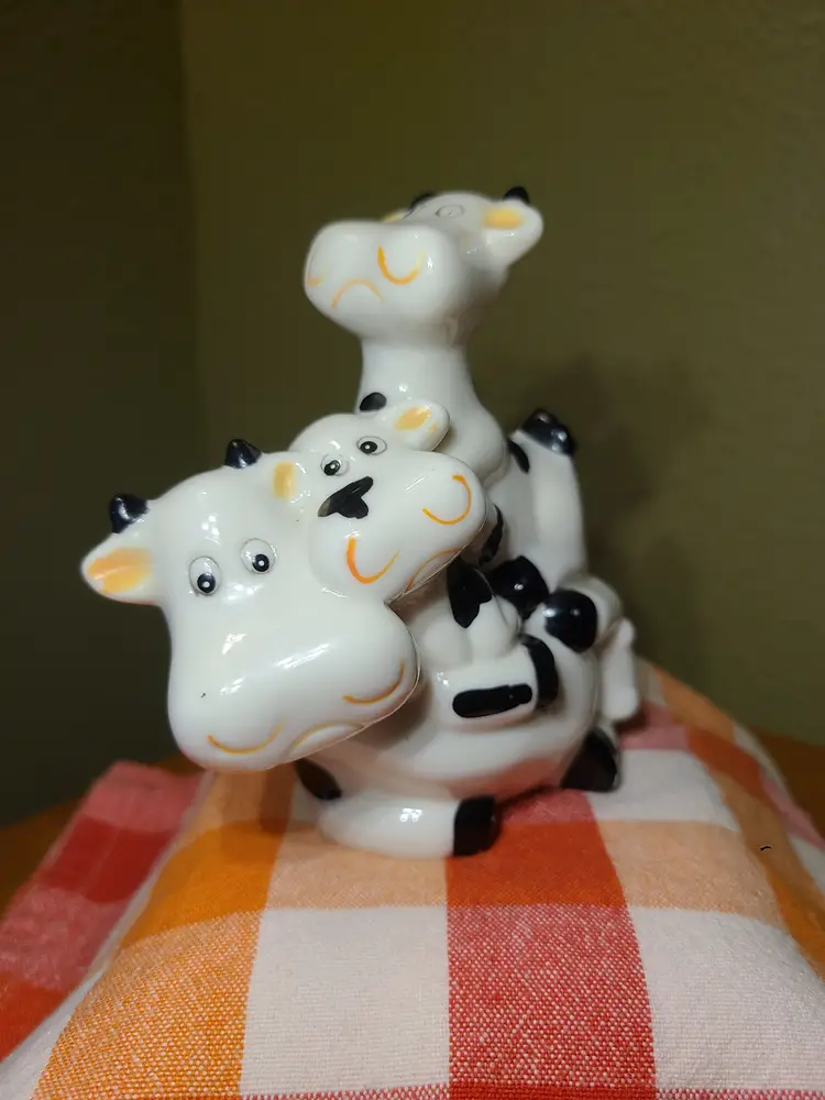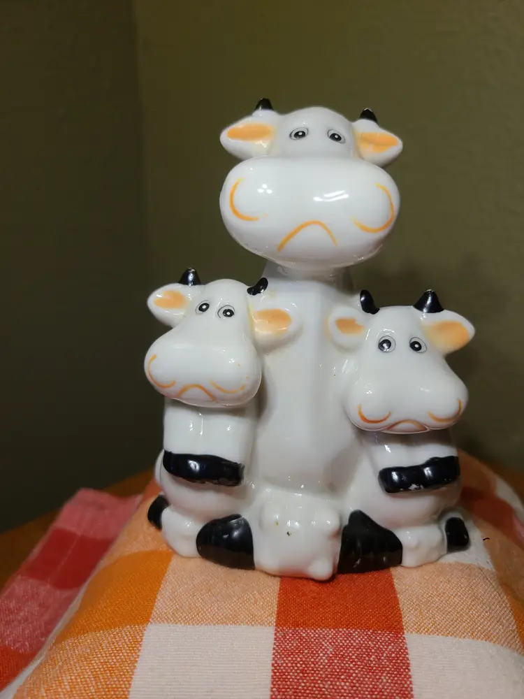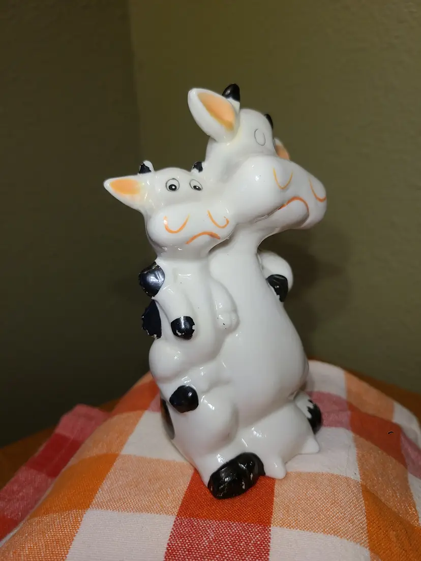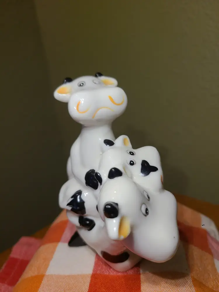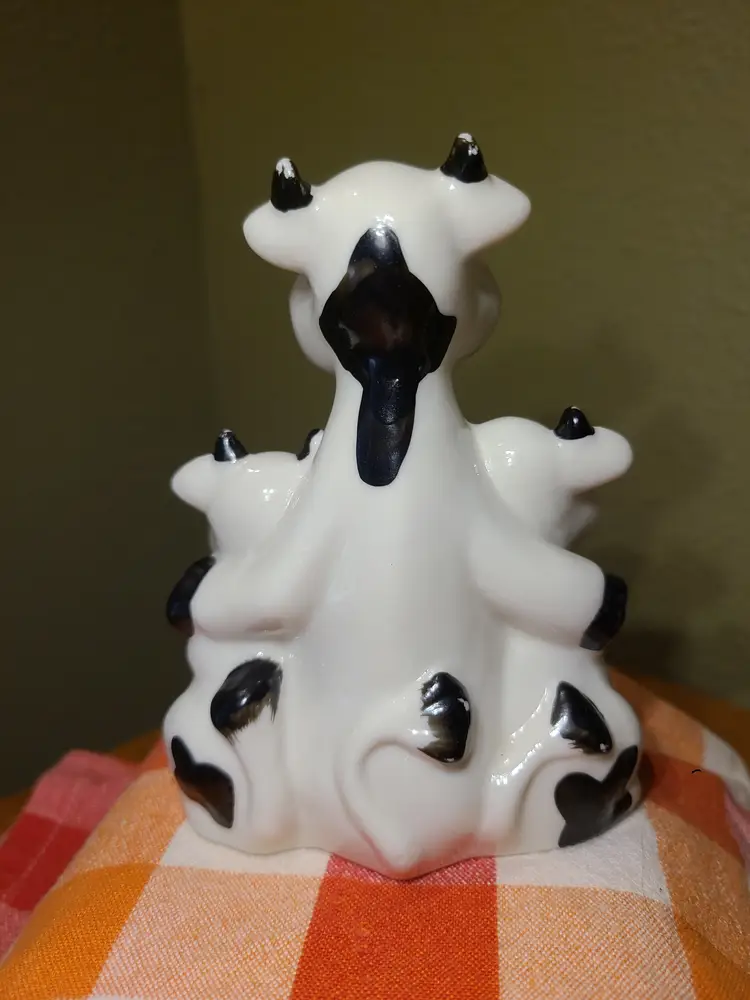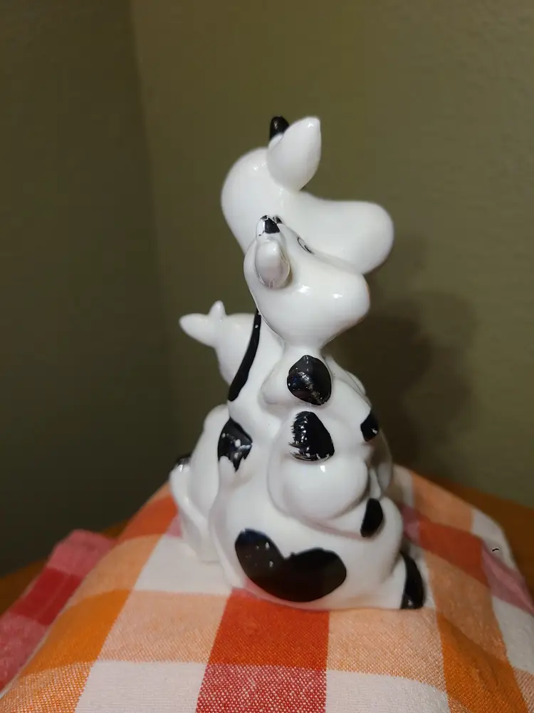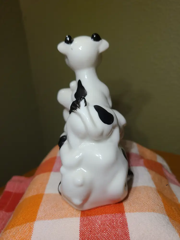 These black and white anamorphic Holstein cows will fit in nicely into any farmhouse or farmhouse-core style or part of an animal themed nursery room. Any figurine collector would enjoy these cuties. (2) Figurines are approx 4.5" and (1) is just a shade over 5" tall. Pictures clearly show where some of the black painted areas have come off. Perfectly charming as they are, but could easily be touched up with paint or a Sharpie marker. There are no chips or cracks.