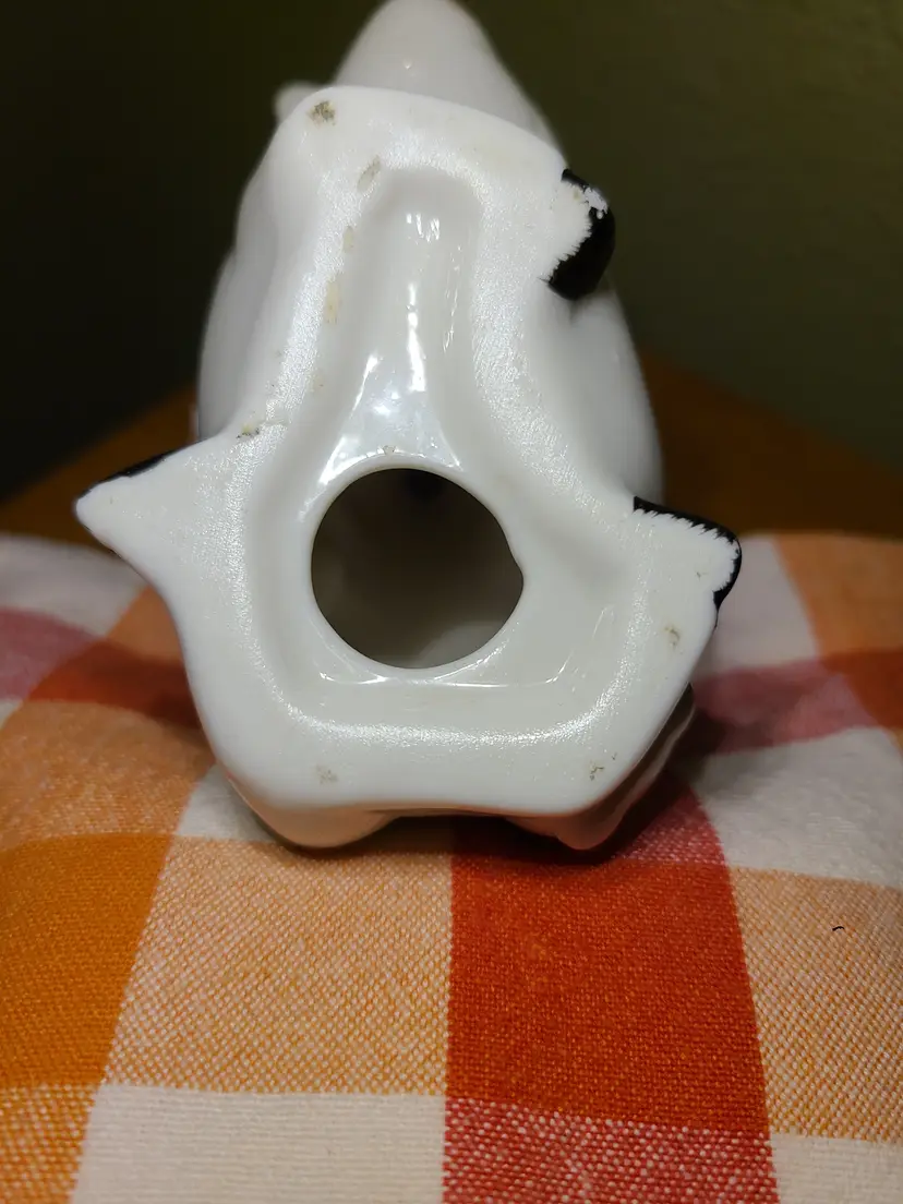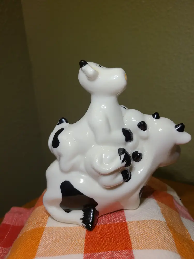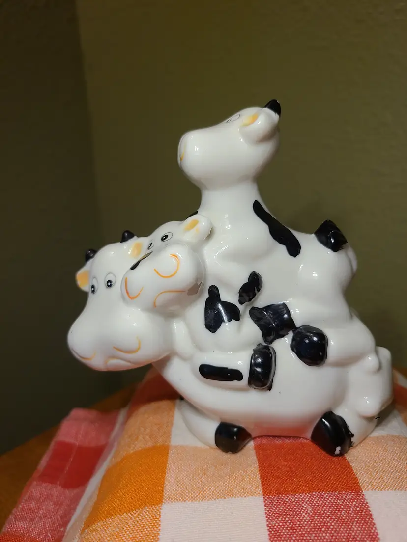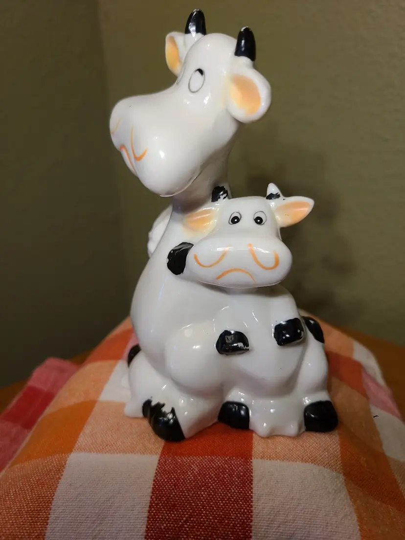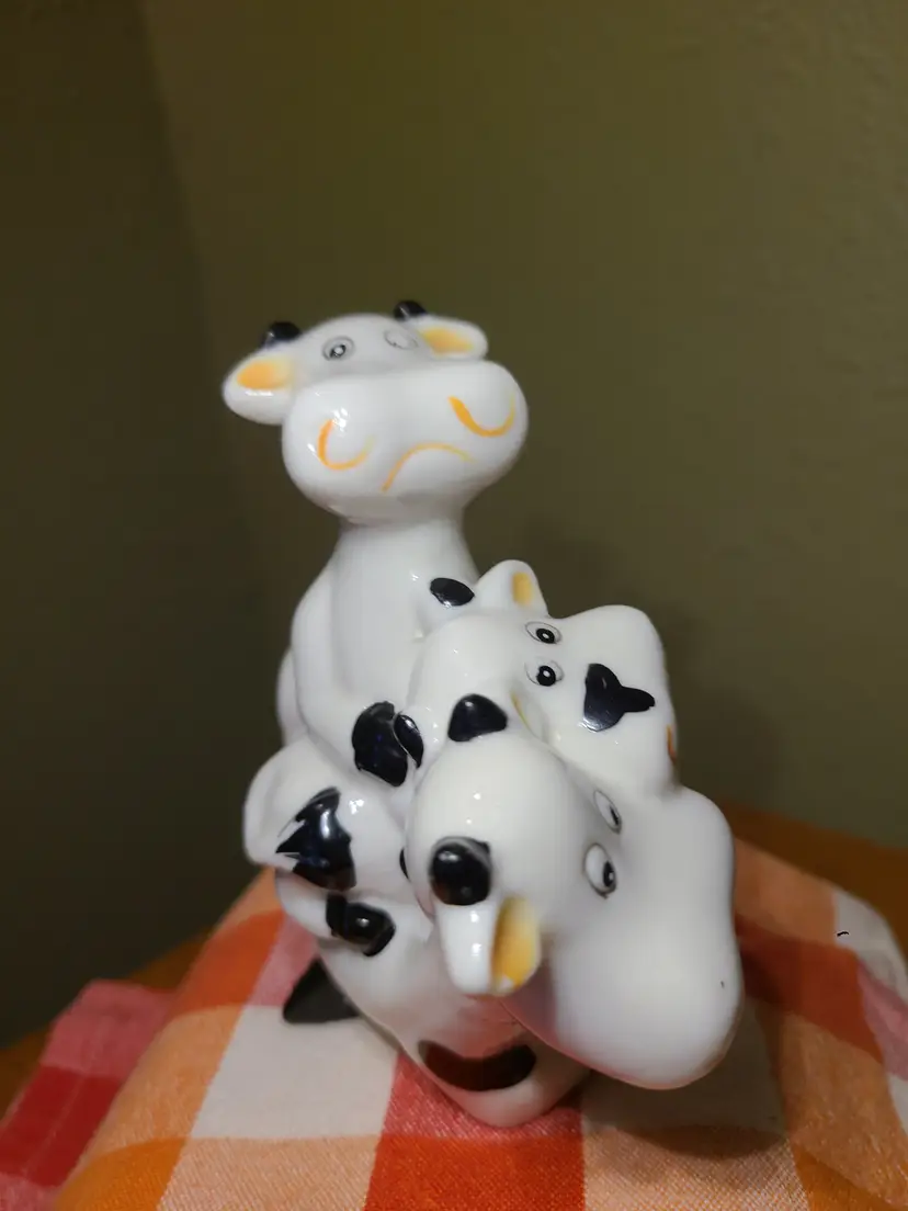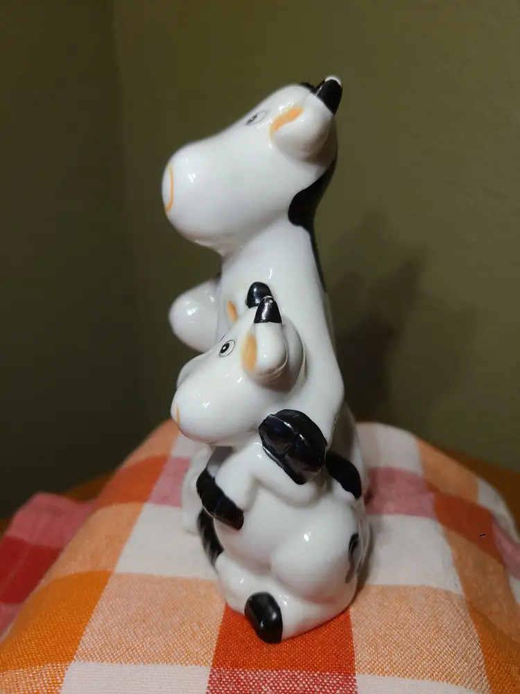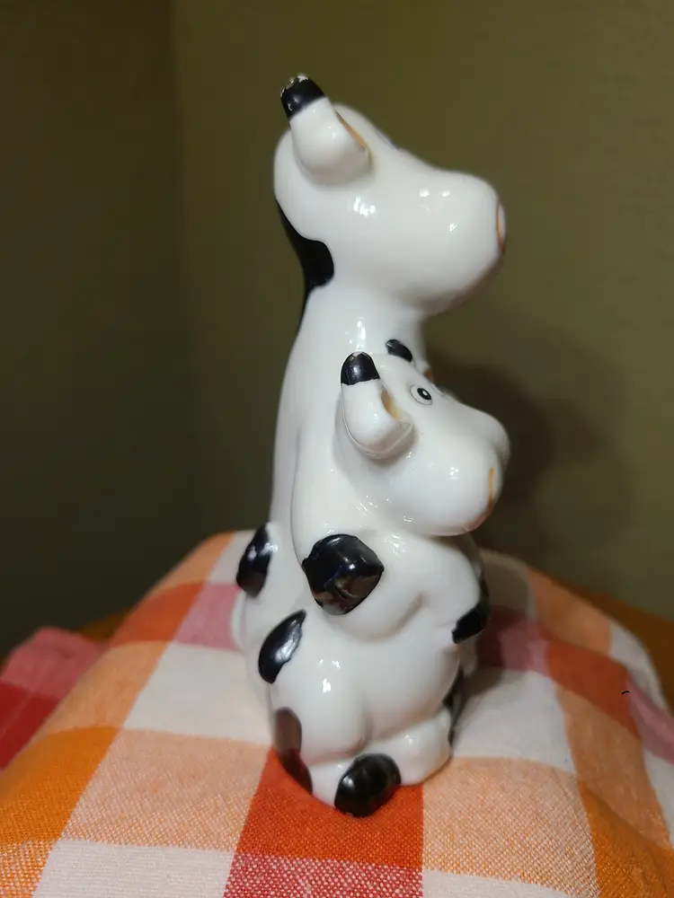 These black and white anamorphic Holstein cows will fit in nicely into any farmhouse or farmhouse-core style or part of an animal themed nursery room. Any figurine collector would enjoy these cuties. (2) Figurines are approx 4.5" and (1) is just a shade over 5" tall. Pictures clearly show where some of the black painted areas have come off. Perfectly charming as they are, but could easily be touched up with paint or a Sharpie marker. There are no chips or cracks.
