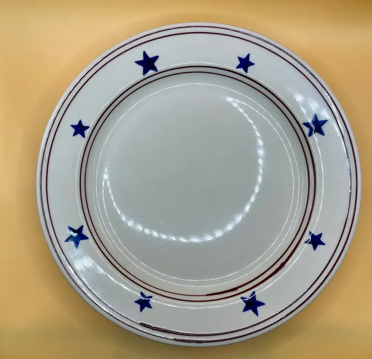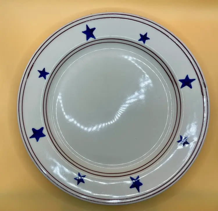 This set of four Hartstone Pottery dinner plates features a patriotic theme with a blue stars and red stripes pattern, perfect for all occasions. Handpainted on stoneware, the 11.25" round plates are adorned with four thin lines and have a shiny finish. Made in the United States by the Hartstone brand, these original plates showcase a primitive style and are a unique addition to any kitchen or dining table.
