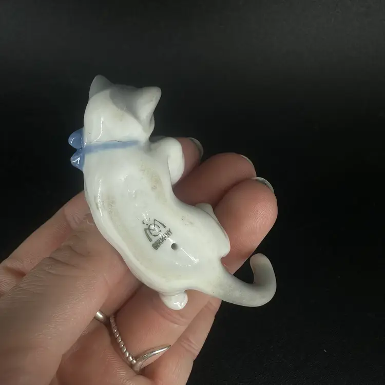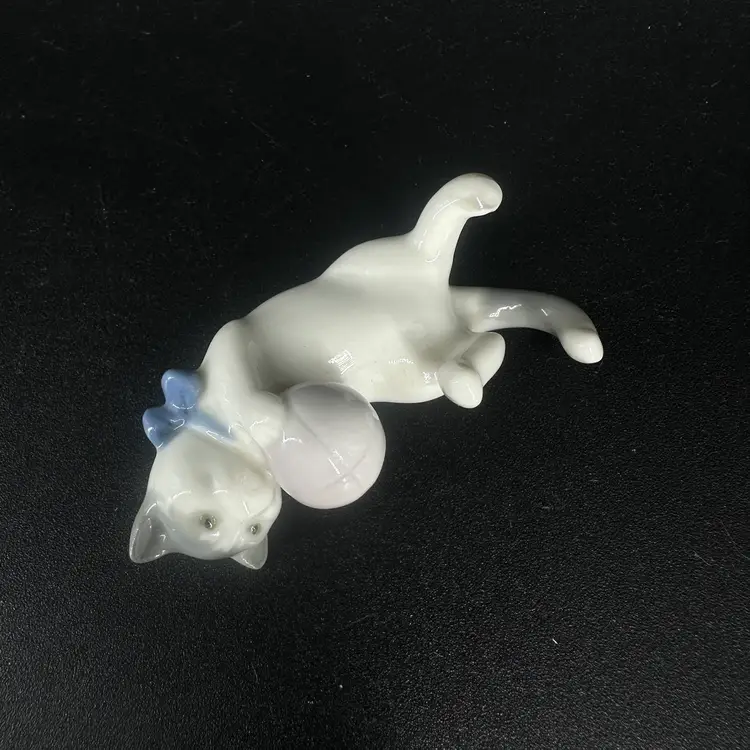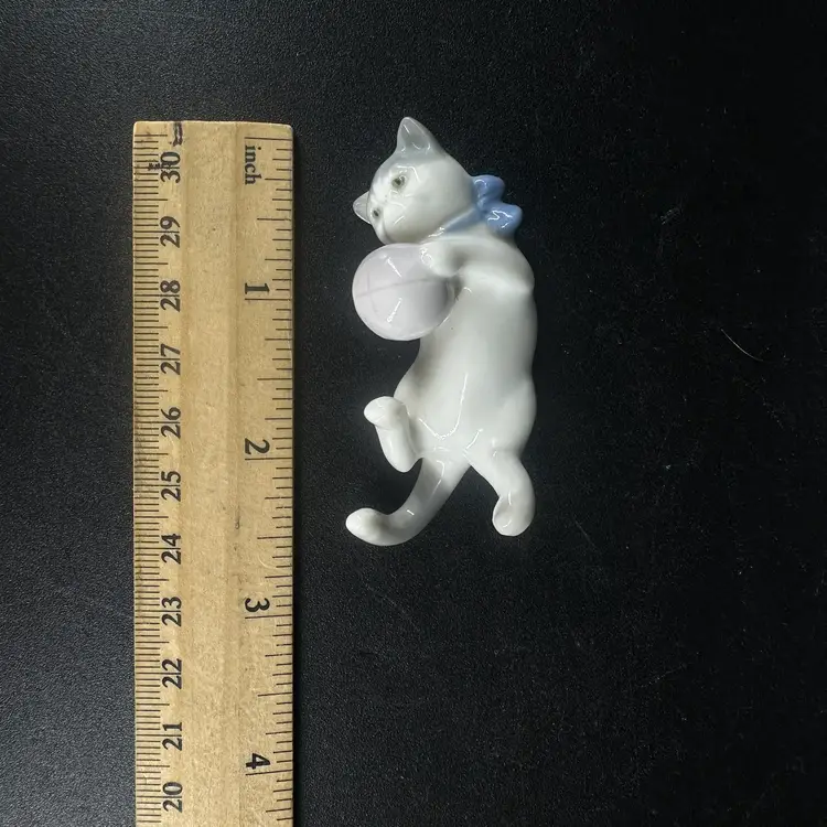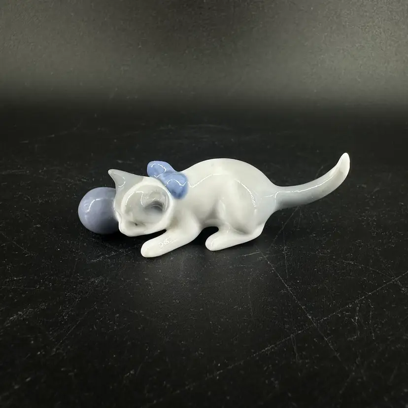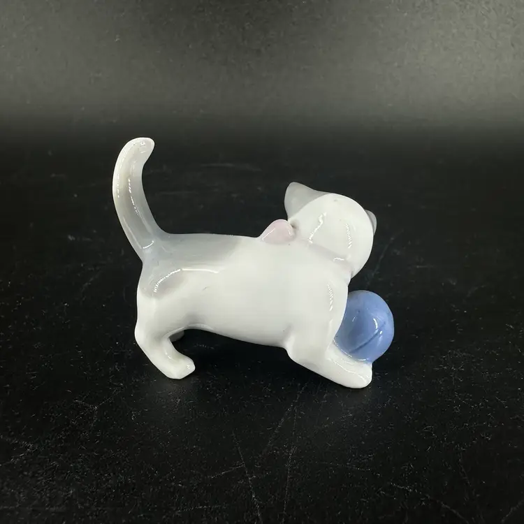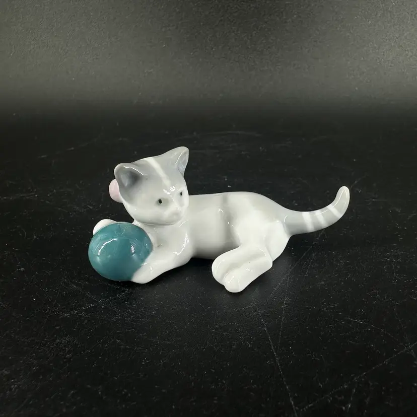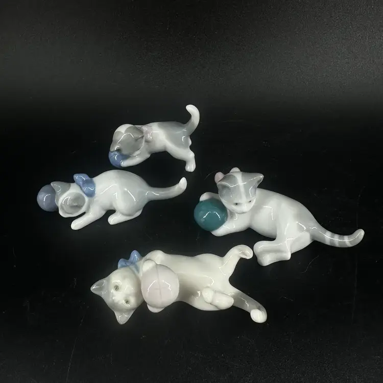 Set of 4 little cats with balls figurines made of porcelain, by Metzler & Ortloff. No chips or cracks on any piece. Has a printed Metzler & Ortloff Germany logo on the bottom of each. Each figurine measures approximately 3” long.
