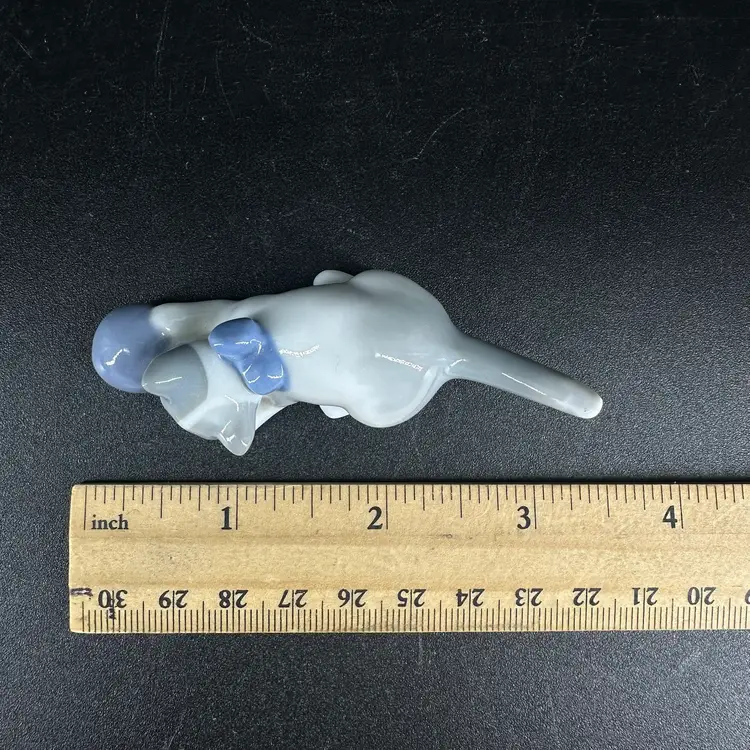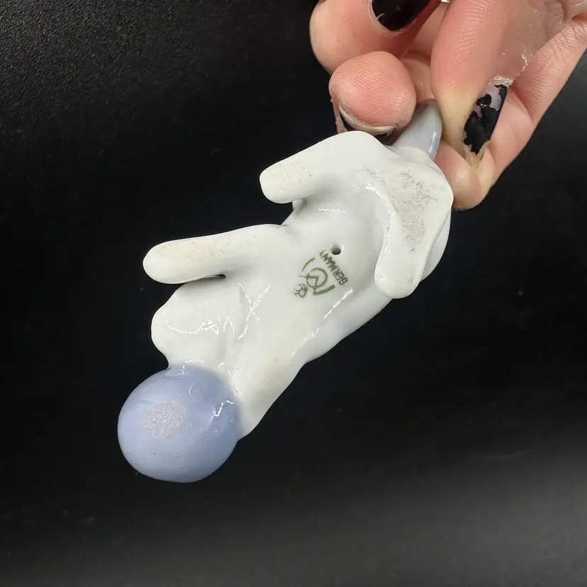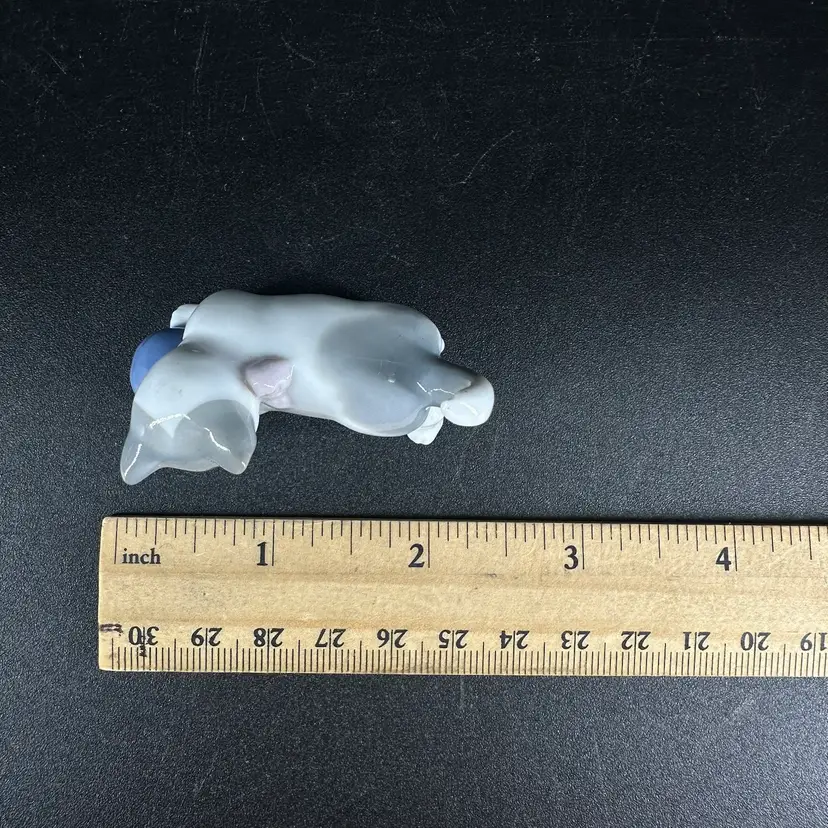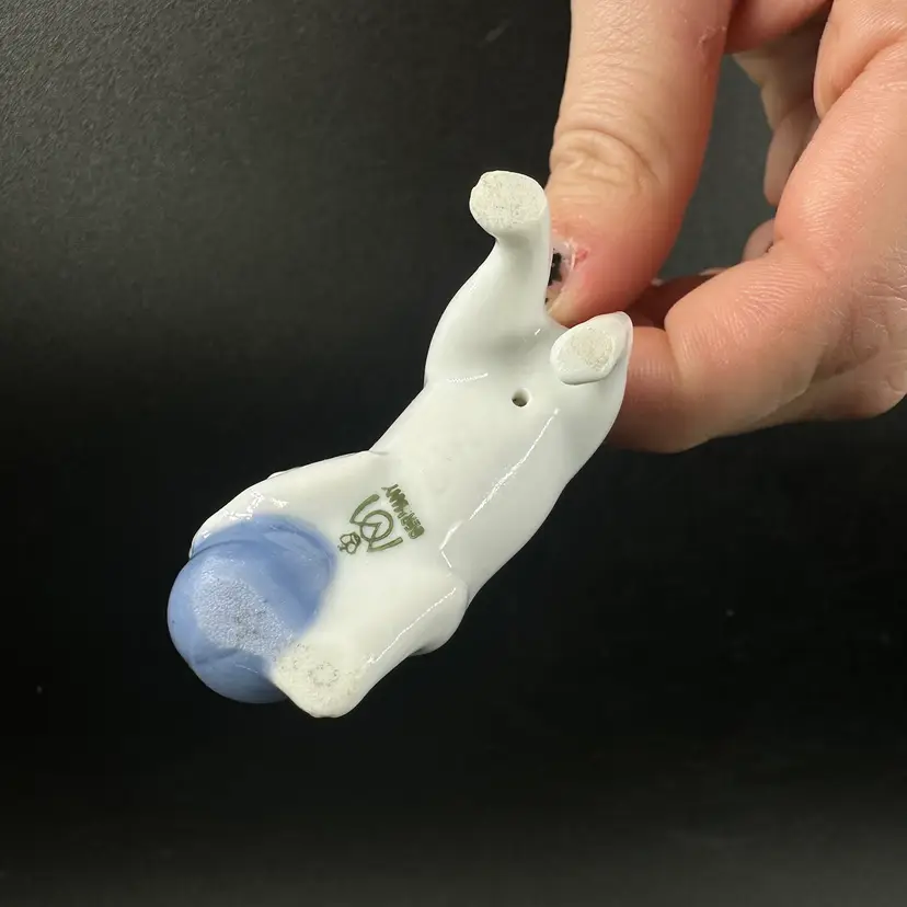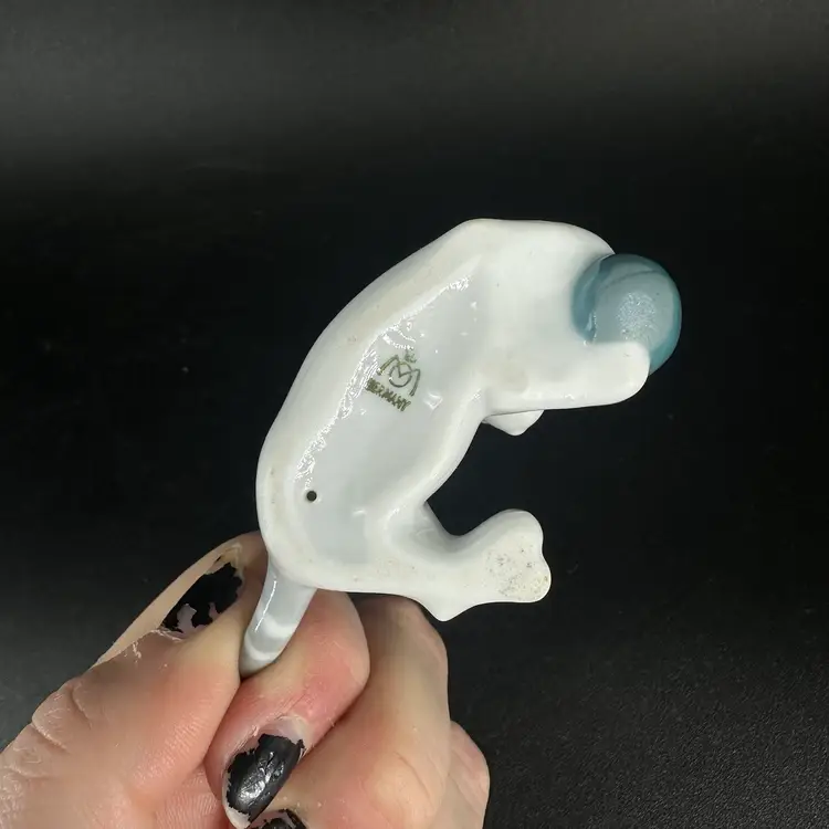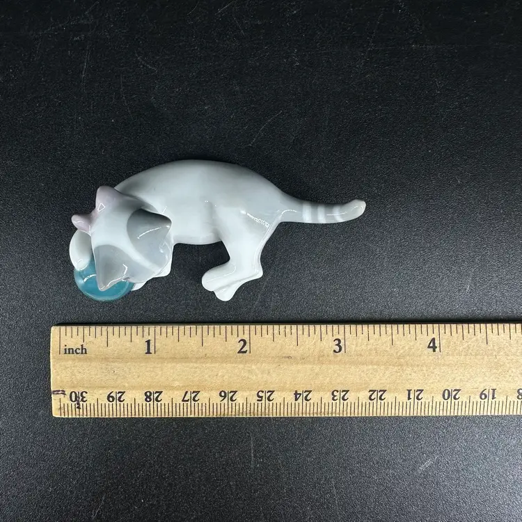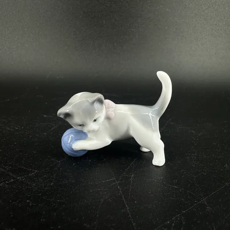 Set of 4 little cats with balls figurines made of porcelain, by Metzler & Ortloff. No chips or cracks on any piece. Has a printed Metzler & Ortloff Germany logo on the bottom of each. Each figurine measures approximately 3” long.