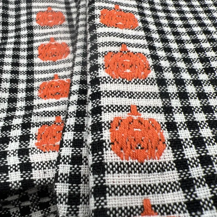 No damage or wear. Stain free. Black and white plaid with ornage embroidered pumpkins. Appear unused and unwashed. Clean!