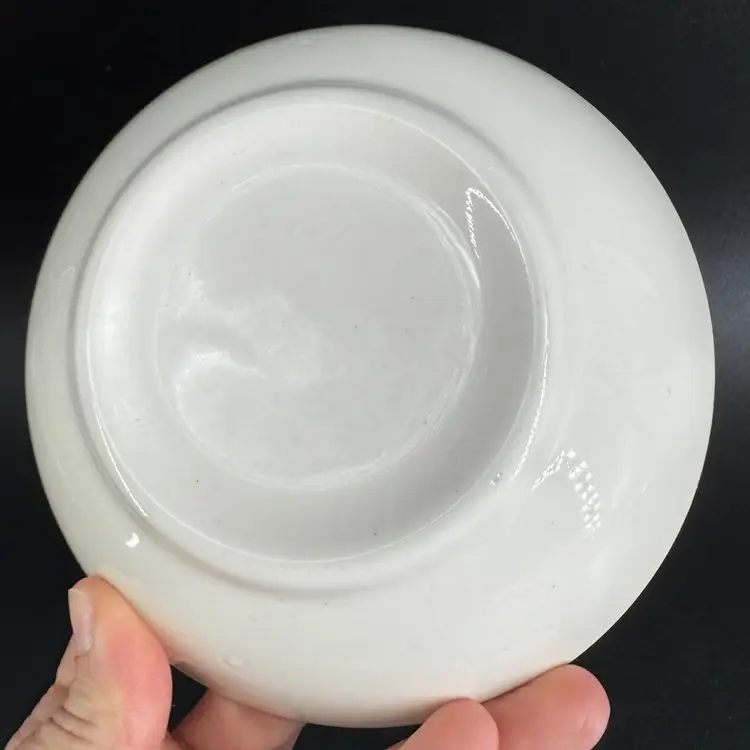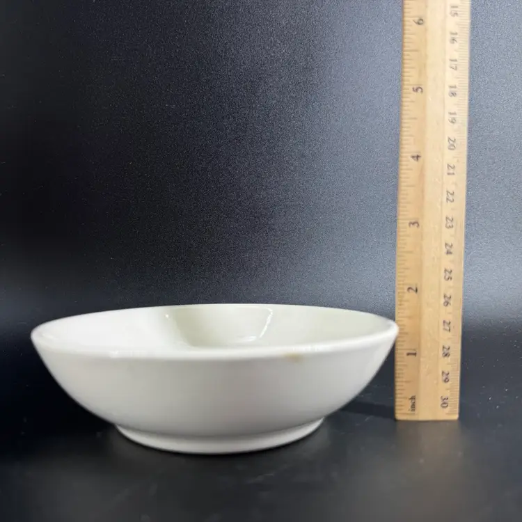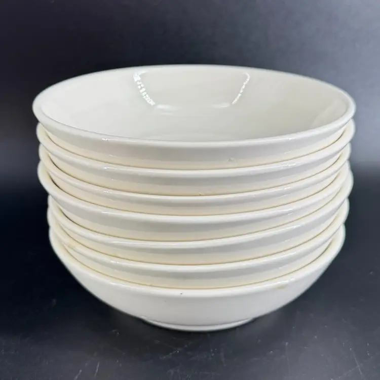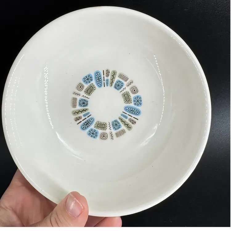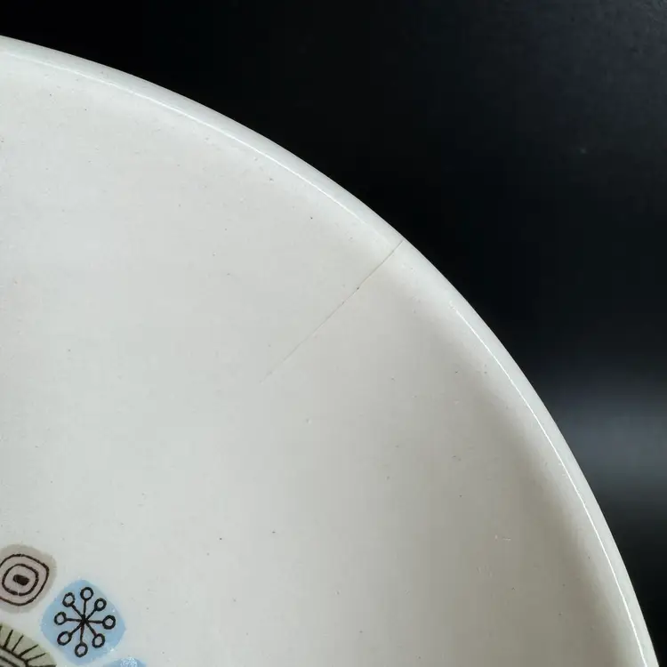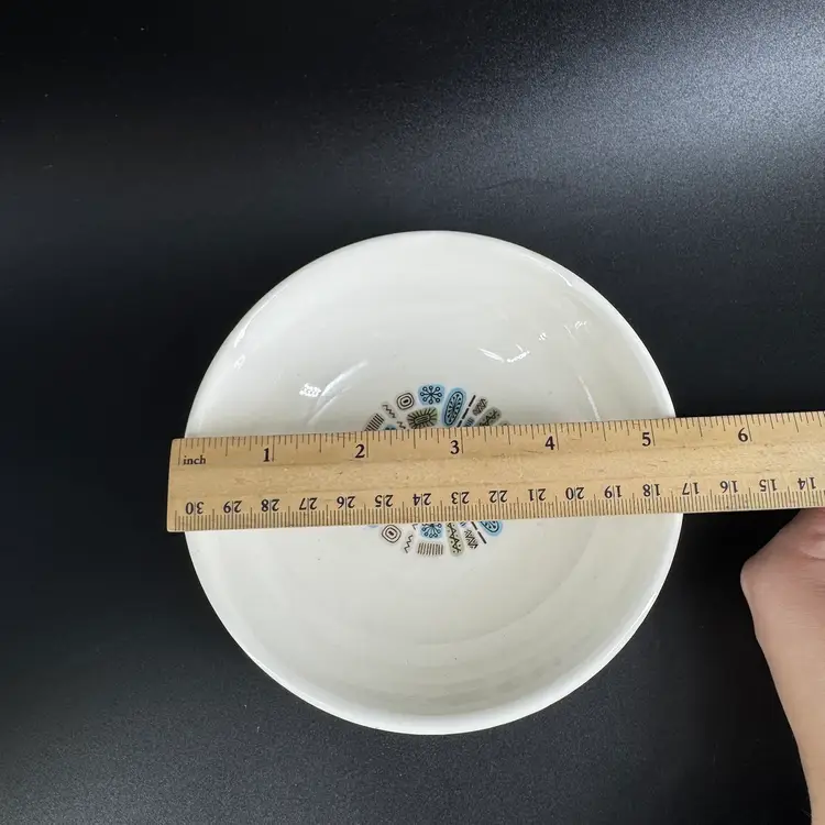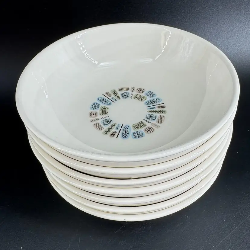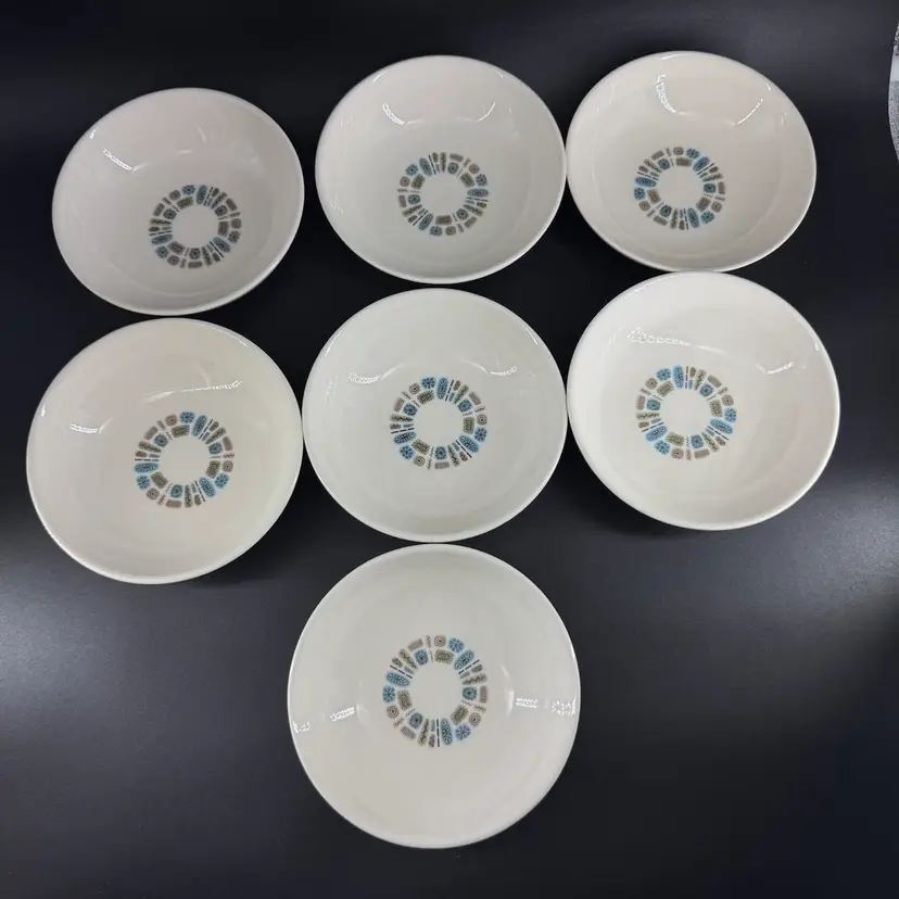 This set of 7 Canonsburg Temporama fruit dessert bowls width and height are approximately 1.5” and 5.5”. There is one cracks on one of the bowls can be seen in the photos there are in chips on any of them. They are not signed or marked.