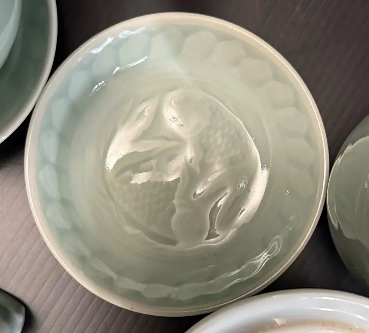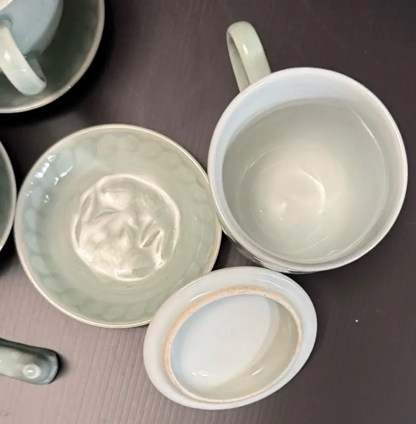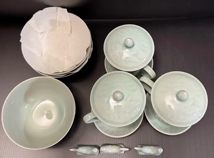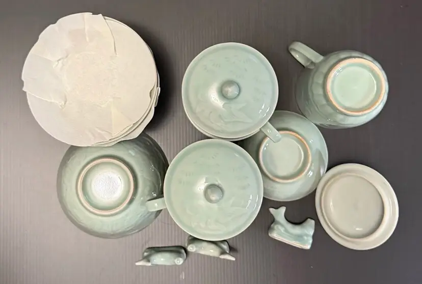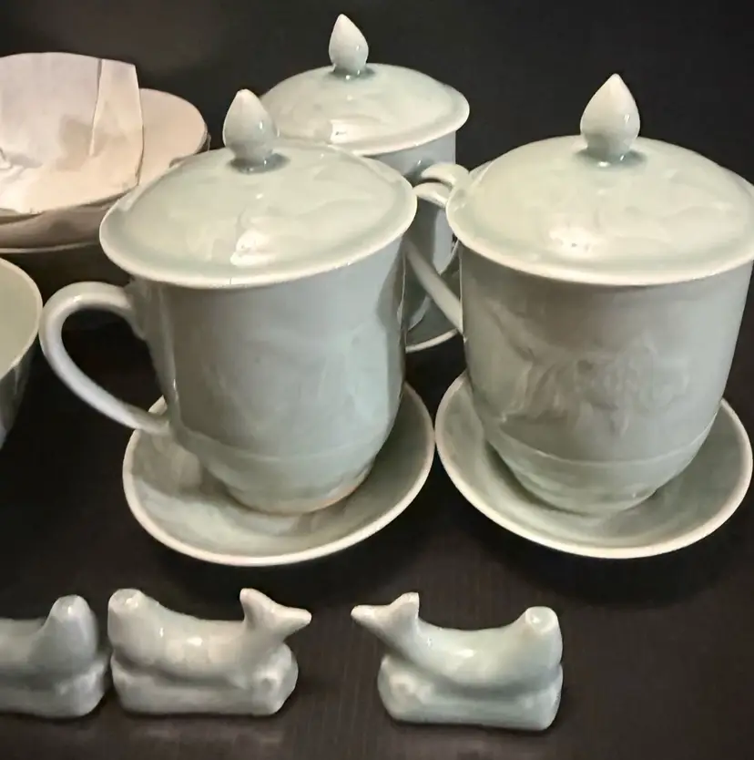 This set includes 3 vintage embossed Koi Fish celadon lidded mugs with saucers, spoon rest and fruit bowls, all featuring a classic round shape and a green color. Made of porcelain, these coffee cups have a capacity of 8 oz and are decorated with a Koi Fish pattern, making them suitable for hot beverages. The set is perfect for all occasions and is suitable for both adults and children, adding a touch of elegance to any dining table with its beautiful design and unique theme. Made in China by the brand Celadon, this mug set is a must-have for any coffee or tea lover.