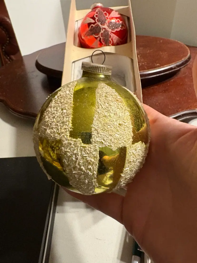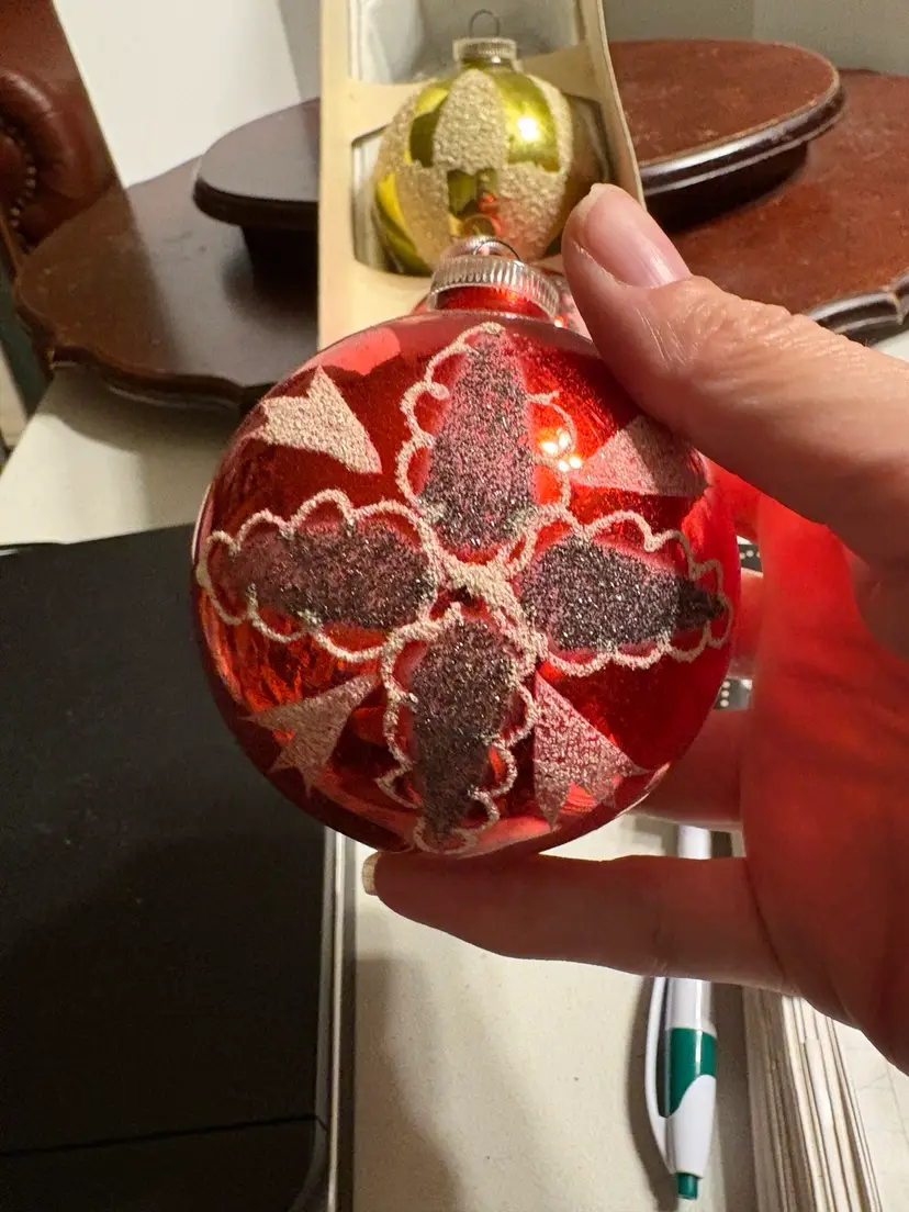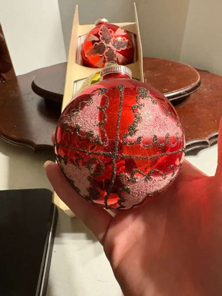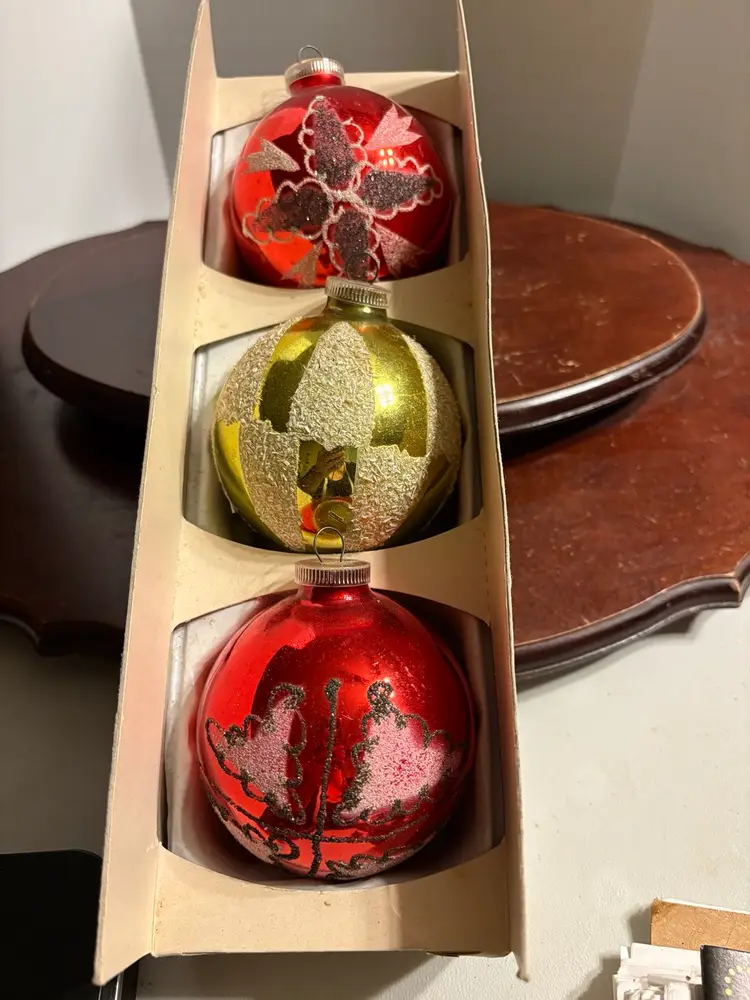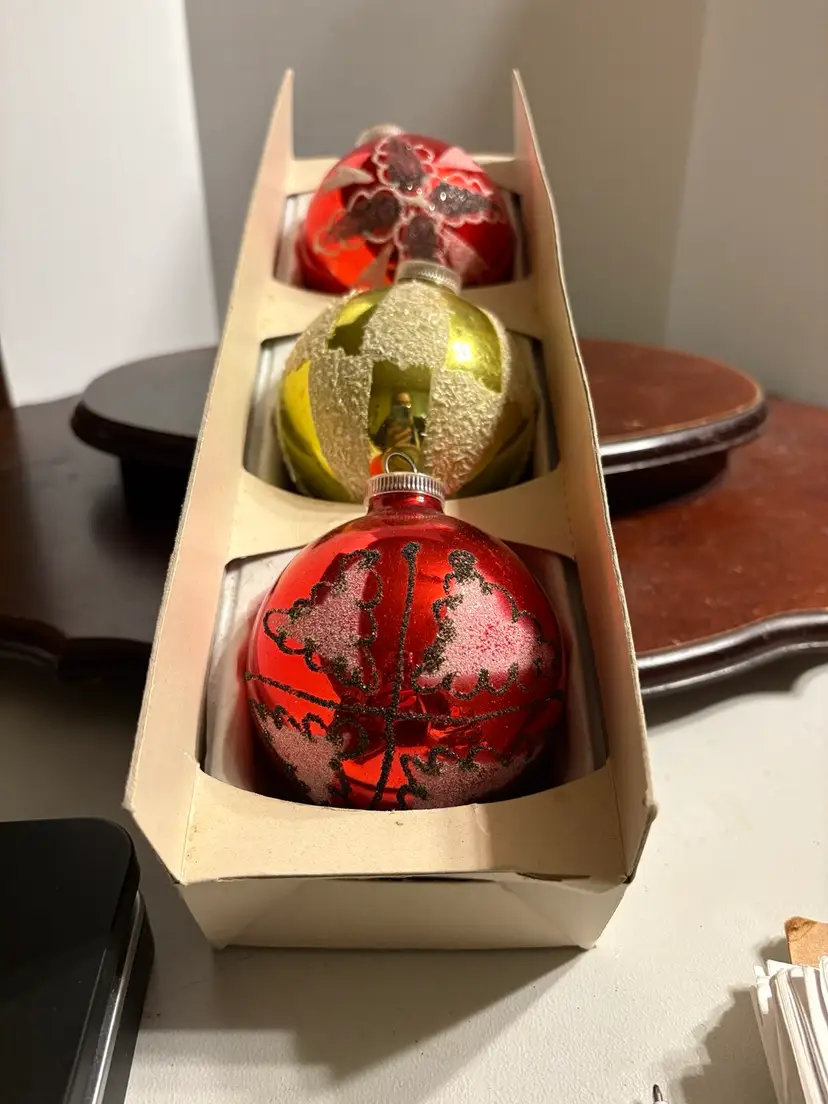 Bulbs are 3” and include 2 red and 1 gold. Each ornament has a different design.