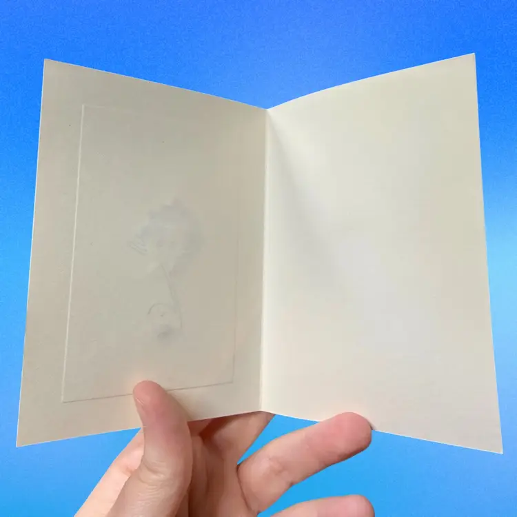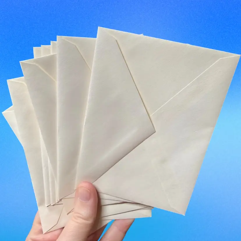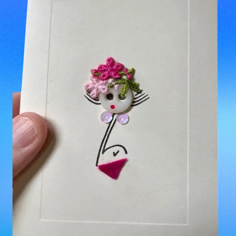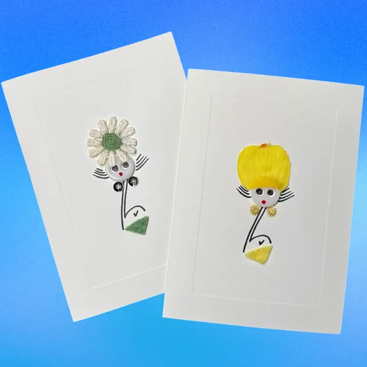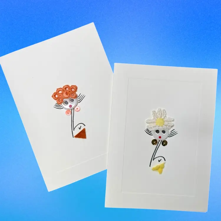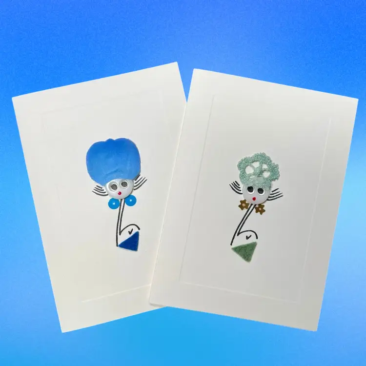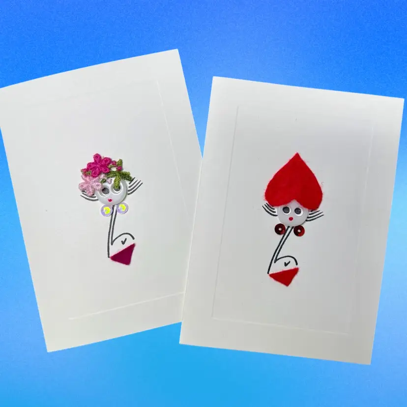 3.5"x5". Set of 10 greeting cards/invitations, BLANK on the inside and come with envelopes. On the outside of each card is a little multimedia art piece, a portrait of a stylized woman in a fancy hat. Each are composed of hand drawn details, buttons, lace, feathers, felt, etc. Each woman’s outfit is a different color. So cute! Perfect to use as invitations or separately for random occasions, or framed as little works of art! Unsure of exact age.