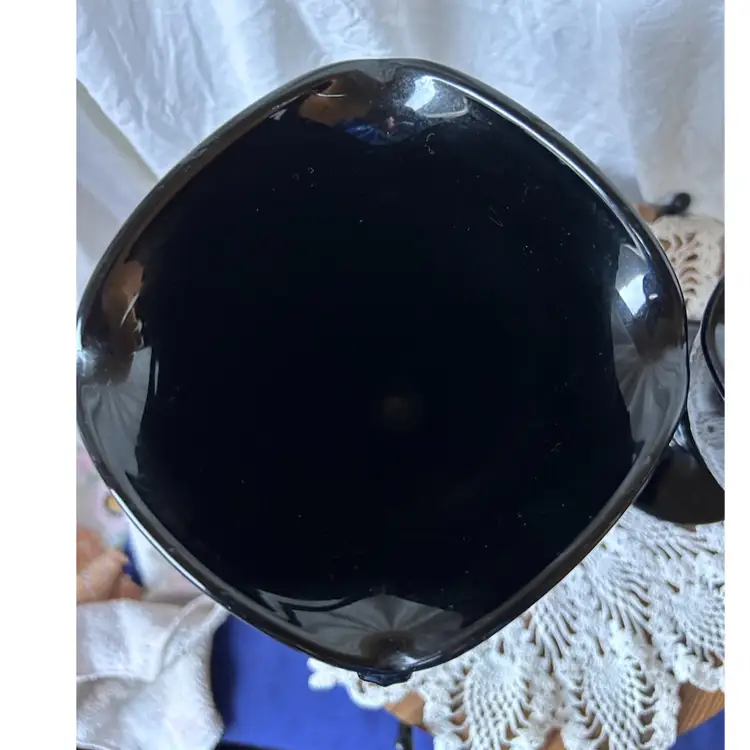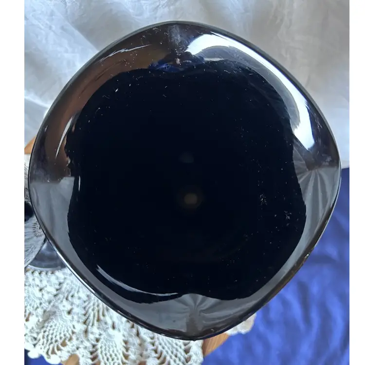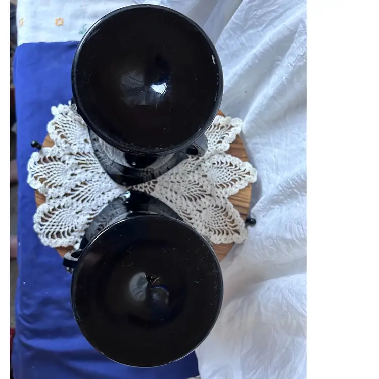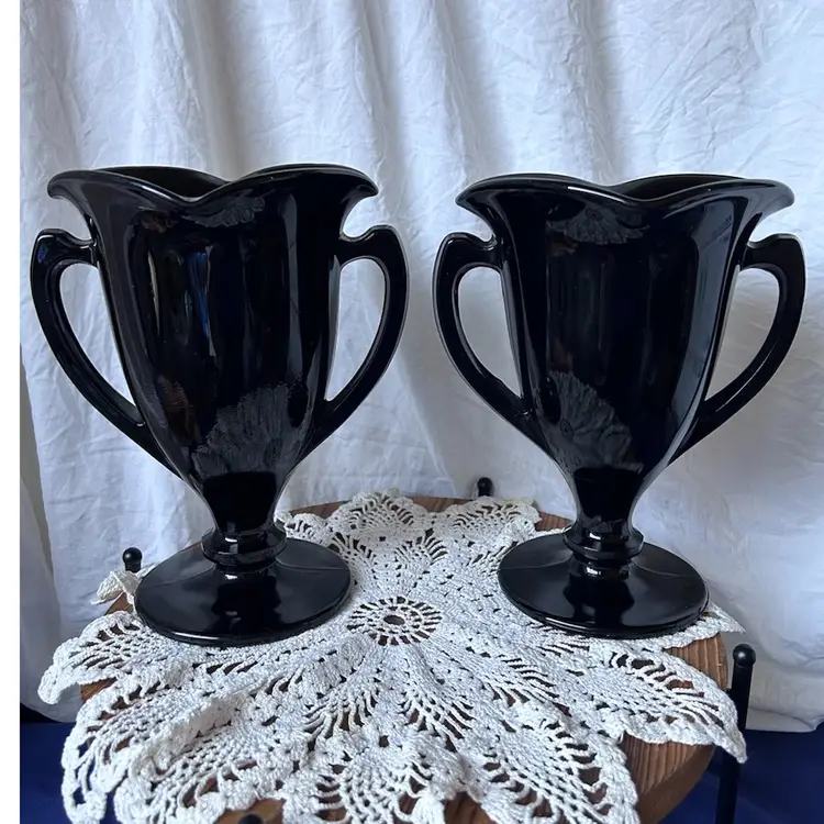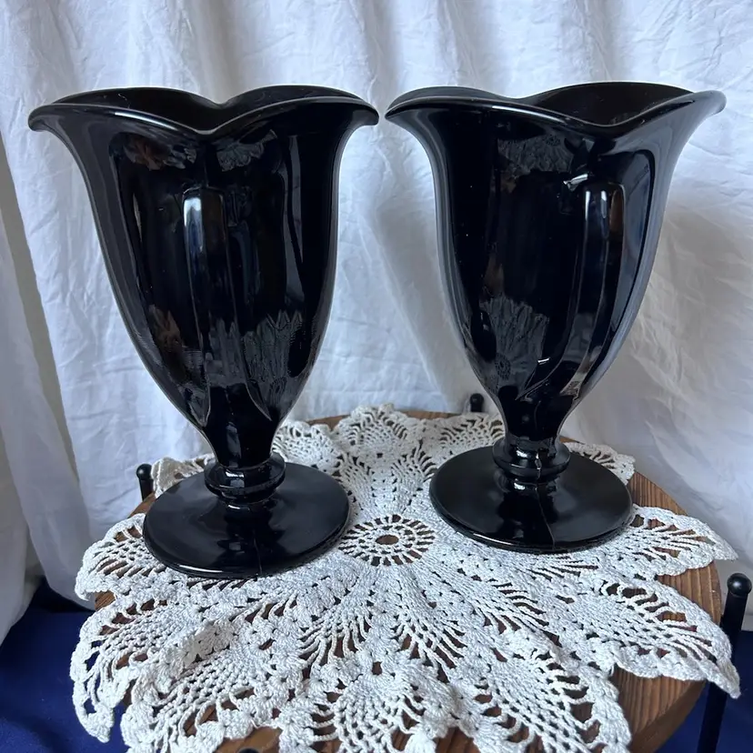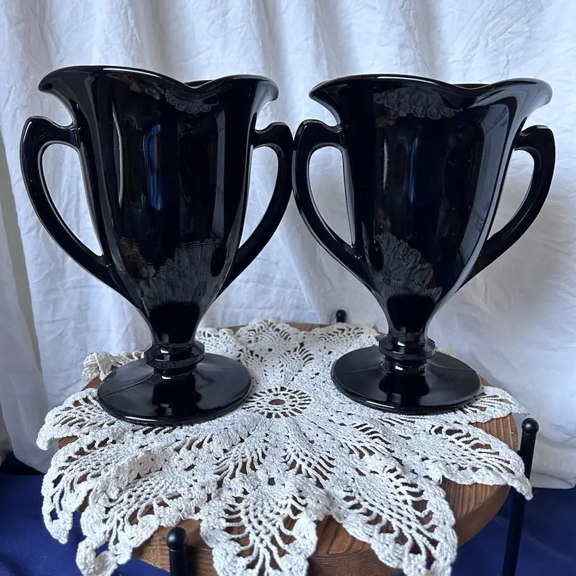 Two L.E.Smith black amethyst glass trophy style vases from the 1930’s. Both are in excellent vintage condition with only minor shelf ware to the bottoms. They measure 8” tall by 6” in diameter and the pattern number is 432.